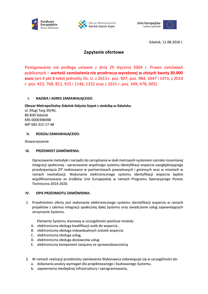 Gdańsk, 11.08.2016 r. Zapytanie ofertowe Postępowanie nie podlega ustawie z dnia 29 stycznia 2004 r. Prawo zamówień publicznych – wartość zamówienia nie przekracza wyrażonej w złotych kwoty 30.000 euro (art.4 pkt 8 tekst jednolity Dz. U. z 2013 r. poz. 907, poz. 984, 1047 i 1473, z 2014 r. poz. 423, 768, 811, 915 i 1146, 1232 oraz z 2015 r. poz. 349, 478, 605) I. NAZWA I ADRES ZAMAWIAJĄCEGO: Obszar Metropolitalny Gdańsk-Gdynia-Sopot z siedzibą w Gdańsku ul. Długi Targ 39/40, 80-830 Gdańsk KRS 0000398498 NIP 583-315-17-48 II. RODZAJ ZAMAWIAJĄCEGO: Stowarzyszenie III. PRZEDMIOT ZAMÓWIENIA: Opracowanie metodyki i narzędzi do zarządzania w skali metropolii systemem szeroko rozumianej integracji społecznej - opracowanie wspólnego systemu identyfikacji wsparcia uwzględniającego przedsięwzięcia ZIT realizowane w partnerstwach powiatowych i gminnych oraz w miastach w ramach rewitalizacji. Wykonanie elektronicznego systemu identyfikacji wsparcia będzie współfinansowane ze środków Unii Europejskiej w ramach Programu Operacyjnego Pomoc Techniczna 2014-2020. IV. OPIS PRZEDMIOTU ZAMÓWIENIA: 1. Przedmiotem oferty jest wykonanie elektronicznego systemu identyfikacji wsparcia w ramach projektów z zakresu integracji społecznej dalej Systemu oraz świadczenie usług zapewniających utrzymanie Systemu. A. B. C. D. E. Elementy Systemu stanowią w szczególności poniższe moduły: elektroniczna obsługa kwalifikacji osób do wsparcia , elektroniczna obsługa indywidualnych ścieżek wsparcia elektroniczna obsługa usług, elektroniczna obsługa dostawców usług elektroniczny komponent związany ze sprawozdawczością 2. W ramach realizacji przedmiotu zamówienia Wykonawca zobowiązuje się w szczególności do: a. dokonania analizy wymagań dla projektowanego i budowanego Systemu, b. zapewnienia niezbędnej infrastruktury i oprogramowania, c. konfiguracji infrastruktury przeznaczonej do realizacji przedmiotu zapytania ofertowego, d. dostawy, instalacji i konfiguracji oprogramowania, e. przekazania Zamawiającemu certyfikatów udzielania licencji/sublicencji oraz innych certyfikatów wymaganych przez Zamawiającego, f. produkcyjnego uruchomienia Systemu g. świadczenia usług gwarancyjnych, serwisowych i opieki administracyjnej, h. świadczenia usług hostingu i utrzymania, i. realizacji dodatkowych usług programistyczno – rozwojowych, j. zaprojektowania funkcjonalnego i graficznego Systemu, k. przeprowadzenia szkoleń dla użytkowników w zakresie administracji oraz obsługi Systemu wykonanego jako przedmiot zapytania ofertowego. 3. W ramach procesu realizacji przedmiotu zapytania Wykonawca: a. przeanalizuje i doprecyzuje wspólnie z Zamawiającym wymagania zawarte w przedmiocie zapytania ofertowego, b. niezwłocznie ustali z Zamawiającym harmonogram uruchamiania poszczególnych modułów systemu, c. zaprojektuje System, d. zbuduje i wdroży System, e. przygotuje i uruchomi wersję beta całego Systemu f. utrzyma i udostępni wersję beta Systemu we własnym zakresie do czasu uruchomienia w pełni funkcjonalnego Systemu, g. upubliczni i udostępni wersję beta Systemu do czasu uruchomienia pełnej wersji Systemu, h. uruchomi w pełni funkcjonalny System, i. wdroży System, j. zaimportuje dane, k. uruchomi produkcyjnie System, l. zapewni hosting i utrzymanie Systemu, m. zapewni bieżący serwis i opiekę administracyjną Systemu – podjęcie działań w ciągu 15h od momentu zgłoszenia w dni robocze oraz wciągu 24h w soboty, niedziele i święta. n. zapewni usługi gwarancyjne Systemu przez 24 miesiące po dokonaniu przez Zamawiającego odbioru Systemu, o. wykona dodatkowe prace programistyczno – rozwojowe w zakresie uzgodnionym z Zamawiającym. Planowane funkcjonalności systemu: 1. Funkcjonalności poszczególnych modułów: A. a. b. c. d. elektroniczna obsługa kwalifikacji osób do wsparcia elektroniczny formularz rekrutacyjny automatyczne generowanie umowy uczestnictwa automatyczne tworzenie profilu osoby uczestniczącej, możliwość zatwierdzenia zakwalifikowania osoby do wsparcia przez uprawnionych użytkowników e. eksportowanie i importowanie formularza z/do systemu w formacie xlsx, xls, ods, doc f. oznaczanie formularzy rekrutacyjnych unikatowym numerem seryjnym g. możliwość podglądu przez uprawnionych użytkowników liczby i treści złożonych formularzy rekrutacyjnych i wygenerowanych umów h. filtrowanie formularzy wg różnych kategorii, m.in. nazwiska, miejsca zamieszkania, i. pobieranie formularzy i umów w formacie gotowym do wydruku (.pdf), j. podział formularzy ze względu na status: złożone, zaakceptowane, odrzucone, rezygnacje, B. elektroniczna obsługa indywidualnych ścieżek wsparcia a. profil uczestnika projektu b. dołączanie dokumentów do profilu uczestnika projektu (skany dokumentów, zaświadczenia, oświadczenia itp.) c. możliwość przypisywania użytkowników/specjalistów do profilu d. możliwość przypisywania usług do profilu (np. terapia psychologiczna, terapia uzależnień, trening budżetowy itp.) e. elektroniczny generator zaświadczeń związanych z udzielonym wsparciem f. elektroniczny kalendarz wsparcia g. elektroniczny formularz Indywidualnej Ścieżki Reintegracji h. elektroniczny generator portfolio osoby uczestniczącej i. możliwość przypisywania osiągniętych wskaźników w ramach wsparcia j. możliwość przypisywania do profilu subprofilów otoczenia C. a. b. c. elektroniczna obsługa usług elektroniczny koszyk usług z przypisanym budżetem (portfelem) na każdą usługę generator dokumentów związanych z każdą usługą (karty doradcze, listy obecności, programy) możliwość przypisania do każdej usługi generatora dokumentów z nią związanych (np. szkolenie – lista obecności, program, zaświadczenie) d. możliwość przypisywania usług do profilu uczestników/-czek (odbiorca) i konta dostawcy usługi e. korelacja stopnia wykorzystania usługi z systemem sprawozdawczości dostawców 