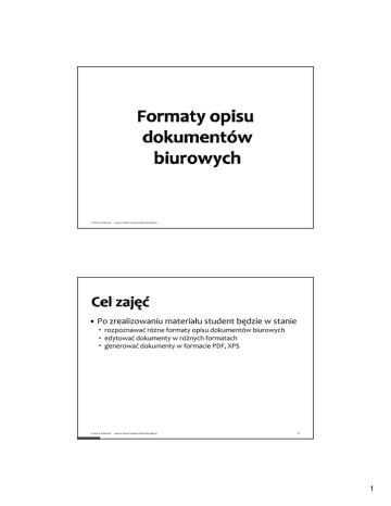 © UEK w Krakowie Janusz Stal & Grażyna Paliwoda-Pękosz Po zrealizowaniu materiału student będzie w stanie rozpoznawać różne formaty opisu dokumentów biurowych edytować dokumenty w różnych formatach generować dokumenty w formacie PDF, XPS © UEK w Krakowie Janusz Stal & Grażyna Paliwoda-Pękosz 2 1 ODF XPS (XML Paper) specification http://www.microsoft.com/whdc/device/print/xps/xpsspec.mspx Open Office 2007 http://www.microsoft.com/poland/technet/bazawiedzy/centrumro zwiazan/cr029_01.mspx#EJB http://office.microsoft.com/en-us/word-help/office-open-xml-iexploring-the-office-open-xml-formats-RZ010243529.aspx http://www.oasis-open.org/committees/tc_home.php?wg_abbrev=office http://office.microsoft.com/en-us/word-help/open-xml-ii-editingdocuments-in-the-xml-RZ010357030.aspx Dodawanie komentarzy do pliku pdf http://www.afritz.org/freetools/adding_PDF_comments.pdf © UEK w Krakowie Janusz Stal & Grażyna Paliwoda-Pękosz Rodzaje formatów Przegląd formatów Wybrane formaty 3 Office Open XML ODF PDF XSP Przepisy prawne w Polsce związane z e-dokumentami Tendencje światowe © UEK w Krakowie Janusz Stal & Grażyna Paliwoda-Pękosz 4 2 Ze względu na obszar zastosowania wspólne dla całego pakietu (edytor tekstu, arkusz kalkulacyjny, prezentacje) , np. ODF, Office Open XML dotyczące tylko wybranych typów dokumentów Dostępność zamknięte – opatentowane przez firmy, nie są dostępne publicznie (np. doc, xls, …) otwarte standardy opisu danych ODF Office Open XML © UEK w Krakowie 5 Janusz Stal & Grażyna Paliwoda-Pękosz MS Office MS Office 2007 MS Works iWork (Macintosh) Open Document Star Office inne Dokument DOC DOCX WPS PAGES ODT SXW TXT, RTF, PDF, MCW (MS Word dla Macintosh), WRI (MS Write) Szablon DOT DOTX WPT OTT STW ODS SXC OTS STC ODP SXI OTP STI Szablon z makrami DOTM Dokument z obsługą makr DOCM Skoroszyt XLS Skoroszyt z obsługą makr XLT Szablon z obsługą makr © UEK w Krakowie NUMBERS CSV, WK1, WK3, WK4, WKS (Lotus 1-2-3) XLTX XLTM PPT Szablon Pokaz XLR XLSM Szablon arkusza Prezentacje XLSX PPTX POTX PPS KEY PPSX Janusz Stal & Grażyna Paliwoda-Pękosz 6 3 Open Document Format for Office Applications (OpenDocument, ISO/IEC 26300), standard rozwijany przez OASIS (Organization for the Advancement of Structured Information Standards) Wykorzystanie: OpenOffice.org, KOffice i StarOffice dokumenty tekstowe, arkusze kalkulacyjne, wykresy i prezentacje multimedialne *.odt -> *.zip © UEK w Krakowie Janusz Stal & Grażyna Paliwoda-Pękosz ISO/IEC 29500, OOXML, OpenXML, MSOOXML Wykorzystanie: MS Office 2007 7 *.docx -> *.zip © UEK w Krakowie Janusz Stal & Grażyna Paliwoda-Pękosz 8 4 Cel standardu: Wykorzystywane języki znacznikowe: OFFICE OPEN XML OVERVIEW automatyczne generowanie dokumentów z danych biznesowych wydobywanie danych biznesowych z dokumentów i automatyczne przekazywanie ich do innych aplikacji archiwizacja danych w takim formacie aby mogły być w przyszłości bez problemu odczytane WordprocessingML (dokumenty tekstowe) SpreadsheetML (arkusze kalkulacyjne) PresentationML (prezentacje multimedialne) DrawingML (kształty i inne obiekty graficzne) VML (grafika wektorowa) inne: języki do opisu formuł matematycznych, metadanych i bibliografii http://www.ecma-international.org/news/TC45_current_work/OpenXML%20White%20Paper.pdf © UEK w Krakowie Motywy (szablony) dokumentów – pliki *.thmx możliwość zmiany wyglądu całego dokumentu możliwość korzystania z gotowych motywów oraz tworzenia i zapisywania nowych motywów Word, Excel 9 Janusz Stal & Grażyna Paliwoda-Pękosz PowerPoint Te same szablony (motywy) dokumentów *.thmx dla PowerPointa, Worda, Excela! => możliwość automatycznego przygotowywania dokumentów, wykresów, prezentacji, które wyglądają podobnie (kolorystyka, czcionki, …) © UEK w Krakowie Janusz Stal & Grażyna Paliwoda-Pękosz 10 5 Excel: szablony wykresów (*.crtx) Word: style całego dokumentu Możliwość szybkiej edycji dokumentu bezpośrednio w XML (po rozpakowaniu *.docx => *.zip) zastępowanie obrazów usuwanie fragmentów dokumentu © UEK w Krakowie Janusz Stal & Grażyna Paliwoda-Pękosz 11 Po co nowy standard tworzony przez Microsoft? Wcześniej był już Open Document Format stworzony przez OASIS Użycie DrawingML, VML oraz nowego formatu dla wzorów matematycznych zamiast SVG i MathML zalecane przez W3C (Word Wide Web Consortium http://www.w3.org/) Niestandardowe kody języków i kolorów … Specyfikacja formatu: 60000 stron … źródło: http://pl.wikipedia.org/wiki/Office_Open_XML © UEK w Krakowie Janusz Stal & Grażyna Paliwoda-Pękosz 12 6 Opracowany przez Microsoft odpowiednik PDF Reprezentacja dokumentu dla potrzeb przeglądania i drukowania Wykorzystuje podzbiór języka XAML *.xps – archiwum ZIP (pliki XML, czcionki, …) Udostępniany na licencji royalty free (jednorazowa opłata dla licencjonodawcy) Przeglądanie XPS Internet Explorer pakiet XPS Essentials Pack: http://www.microsoft.com/downloads/details.aspx?displaylang=pl&FamilyID=b8dcffdde3a5-44cc-8021-7649fd37ffee Tworzenie dokumentów XPS w MS Office 2007 można zapisać plik w formacie XPS © UEK w Krakowie Janusz Stal & Grażyna Paliwoda-Pękosz 13 © UEK w Krakowie Janusz Stal & Grażyna Paliwoda-Pękosz 14 7 Przeglądanie dokumentu – Adobe Reader – bezpłatny Modyfikacja plików – płatne oprogramowanie Tworzenie/publikowanie dostępne, np. w MS Office 2007 Acrobat.com – narzędzie online https://acrobat.com/ Dodatkowe możliwości: przeszukiwanie dokumentów pdf i dodawanie komentarzy (Adobe Reader 7+, ale w tych dokumentach pdf, które mają włączoną przez autora taką możliwość (to robi Acrobat 7 Professional) => będzie na ćwiczeniach) szyfrowanie dokumentu pdf zabezpieczenie dokumentu pdf przed kopiowaniem tworzenie zakładek/spisu treści dokumentu (płatne narzędzia) © UEK w Krakowie Janusz Stal & Grażyna Paliwoda-Pękosz 15 Autor dokumentu pdf może nadać użytkownikom dokumentu różne prawa (ale niestet