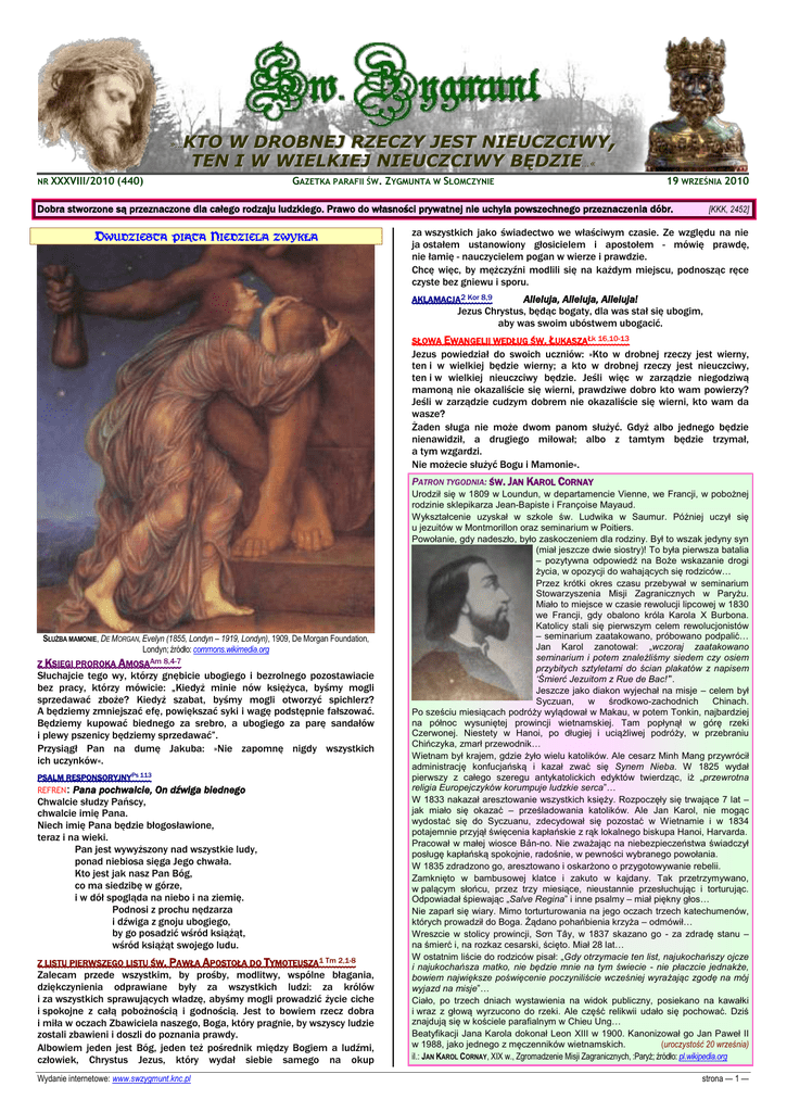 KTO W DROBNEJ RZECZY JEST NIEUCZCIWY, TEN I W WIELKIEJ NIEUCZCIWY BĘDZIE…« »… NR XXXVIII/2010 (440) GAZETKA PARAFII ŚW. ZYGMUNTA W SŁOMCZYNIE 19 WRZEŚNIA 2010 Dobra stworzone są przeznaczone dla całego rodzaju ludzkiego. Prawo do własności prywatnej nie uchyla powszechnego przeznaczenia dóbr. DWUDZIESTA PIĄTA NIEDZIELA ZWYKŁA [KKK, 2452] za wszystkich jako świadectwo we właściwym czasie. Ze względu na nie ja ostałem ustanowiony głosicielem i apostołem - mówię prawdę, nie łamię - nauczycielem pogan w wierze i prawdzie. Chcę więc, by mężczyźni modlili się na każdym miejscu, podnosząc ręce czyste bez gniewu i sporu. AKLAMACJA2 Kor 8,9 Alleluja, Alleluja, Alleluja! Jezus Chrystus, będąc bogaty, dla was stał się ubogim, aby was swoim ubóstwem ubogacić. SŁOWA EWANGELII WEDŁUG ŚW. ŁUKASZAŁk 16,10-13 Jezus powiedział do swoich uczniów: »Kto w drobnej rzeczy jest wierny, ten i w wielkiej będzie wierny; a kto w drobnej rzeczy jest nieuczciwy, ten i w wielkiej nieuczciwy będzie. Jeśli więc w zarządzie niegodziwą mamoną nie okazaliście się wierni, prawdziwe dobro kto wam powierzy? Jeśli w zarządzie cudzym dobrem nie okazaliście się wierni, kto wam da wasze? Żaden sługa nie może dwom panom służyć. Gdyż albo jednego będzie nienawidził, a drugiego miłował; albo z tamtym będzie trzymał, a tym wzgardzi. Nie możecie służyć Bogu i Mamonie«. PATRON TYGODNIA: ŚW. JAN KAROL CORNAY SŁUŻBA MAMONIE, DE MORGAN, Evelyn (1855, Londyn – 1919, Londyn), 1909, De Morgan Foundation, Londyn; źródło: commons.wikimedia.org Z KSIĘGI PROROKA AMOSAAm 8,4-7 Słuchajcie tego wy, którzy gnębicie ubogiego i bezrolnego pozostawiacie bez pracy, którzy mówicie: „Kiedyż minie nów księżyca, byśmy mogli sprzedawać zboże? Kiedyż szabat, byśmy mogli otworzyć spichlerz? A będziemy zmniejszać efę, powiększać syki i wagę podstępnie fałszować. Będziemy kupować biednego za srebro, a ubogiego za parę sandałów i plewy pszenicy będziemy sprzedawać”. Przysiągł Pan na dumę Jakuba: »Nie zapomnę nigdy wszystkich ich uczynków«. PSALM RESPONSORYJNYPs 113 REFREN: Pana pochwalcie, On dźwiga biednego Chwalcie słudzy Pańscy, chwalcie imię Pana. Niech imię Pana będzie błogosławione, teraz i na wieki. Pan jest wywyższony nad wszystkie ludy, ponad niebiosa sięga Jego chwała. Kto jest jak nasz Pan Bóg, co ma siedzibę w górze, i w dół spogląda na niebo i na ziemię. Podnosi z prochu nędzarza i dźwiga z gnoju ubogiego, by go posadzić wśród książąt, wśród książąt swojego ludu. Z LISTU PIERWSZEGO LISTU ŚW. PAWŁA APOSTOŁA DO TYMOTEUSZA1 Tm 2,1-8 Zalecam przede wszystkim, by prośby, modlitwy, wspólne błagania, dziękczynienia odprawiane były za wszystkich ludzi: za królów i za wszystkich sprawujących władzę, abyśmy mogli prowadzić życie ciche i spokojne z całą pobożnością i godnością. Jest to bowiem rzecz dobra i miła w oczach Zbawiciela naszego, Boga, który pragnie, by wszyscy ludzie zostali zbawieni i doszli do poznania prawdy. Albowiem jeden jest Bóg, jeden też pośrednik między Bogiem a ludźmi, człowiek, Chrystus Jezus, który wydał siebie samego na okup Wydanie internetowe: www.swzygmunt.knc.pl Urodził się w 1809 w Loundun, w departamencie Vienne, we Francji, w pobożnej rodzinie sklepikarza Jean-Bapiste i Françoise Mayaud. Wykształcenie uzyskał w szkole św. Ludwika w Saumur. Później uczył się u jezuitów w Montmorillon oraz seminarium w Poitiers. Powołanie, gdy nadeszło, było zaskoczeniem dla rodziny. Był to wszak jedyny syn (miał jeszcze dwie siostry)! To była pierwsza batalia – pozytywna odpowiedź na Boże wskazanie drogi życia, w opozycji do wahających się rodziców… Przez krótki okres czasu przebywał w seminarium Stowarzyszenia Misji Zagranicznych w Paryżu. Miało to miejsce w czasie rewolucji lipcowej w 1830 we Francji, gdy obalono króla Karola X Burbona. Katolicy stali się pierwszym celem rewolucjonistów – seminarium zaatakowano, próbowano podpalić… Jan Karol zanotował: „wczoraj zaatakowano seminarium i potem znaleźliśmy siedem czy osiem przybitych sztyletami do ścian plakatów z napisem ‘Śmierć Jezuitom z Rue de Bac!’”. Jeszcze jako diakon wyjechał na misje – celem był Syczuan, w środkowo-zachodnich Chinach. Po sześciu miesiącach podróży wylądował w Makau, w potem Tonkin, najbardziej na północ wysuniętej prowincji wietnamskiej. Tam popłynął w górę rzeki Czerwonej. Niestety w Hanoi, po długiej i uciążliwej podróży, w przebraniu Chińczyka, zmarł przewodnik… Wietnam był krajem, gdzie żyło wielu katolików. Ale cesarz Minh Mang przywrócił administrację konfucjańską i kazał zwać się Synem Nieba. W 1825 wydał pierwszy z całego szeregu antykatolickich edyktów twierdząc, iż „przewrotna religia Europejczyków korumpuje ludzkie serca”… W 1833 nakazał aresztowanie wszystkich księży. Rozpoczęły się trwające 7 lat – jak miało się okazać – prześladowania katolików. Ale Jan Karol, nie mogąc wydostać się do Syczuanu, zdecydował się pozostać w Wietnamie i w 1834 potajemnie przyjął święcenia kapłańskie z rąk lokalnego biskupa Hanoi, Harvarda. Pracował w małej wiosce Bản-no. Nie zważając na niebezpieczeństwa świadczył posługę kapłańską spokojnie, radośnie, w pewności wybranego powołania. W 1835 zdradzono go, aresztowano i oskarżono o przygotowywanie rebelii. Zamknięto w bambusowej klatce i zakuto w kajdany. Tak przetrzymywano, w palącym słońcu, przez trzy miesiące, nieustannie przesłuchując i torturując. Odpowiadał śpiewając „Salve Regina” i inne psalmy – miał piękny głos… Nie zaparł się wiary. Mimo torturturowania na jego oczach trzech katechumenów, których prowadził do Boga. Żądano pohańbienia krzyża – odmówił… Wreszcie w stolicy prowincji, Sơn Tây, w 1837 skazano go - za zdradę stanu – na śmi