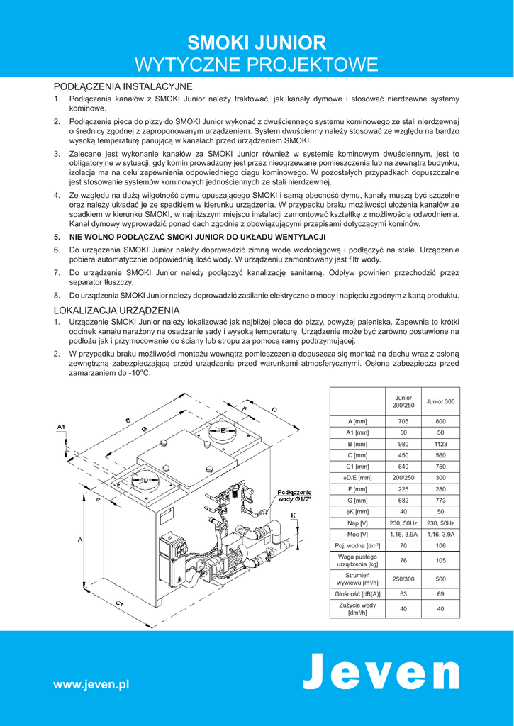 SMOKI JUNIOR WYTYCZNE PROJEKTOWE PODŁĄCZENIA INSTALACYJNE 1. Podłączenia kanałów z SMOKI Junior należy traktować, jak kanały dymowe i stosować nierdzewne systemy kominowe. 2. Podłączenie pieca do pizzy do SMOKI Junior wykonać z dwuściennego systemu kominowego ze stali nierdzewnej o średnicy zgodnej z zaproponowanym urządzeniem. System dwuścienny należy stosować ze względu na bardzo wysoką temperaturę panującą w kanałach przed urządzeniem SMOKI. 3. Zalecane jest wykonanie kanałów za SMOKI Junior również w systemie kominowym dwuściennym, jest to obligatoryjne w sytuacji, gdy komin prowadzony jest przez nieogrzewane pomieszczenia lub na zewnątrz budynku, izolacja ma na celu zapewnienia odpowiedniego ciągu kominowego. W pozostałych przypadkach dopuszczalne jest stosowanie systemów kominowych jednościennych ze stali nierdzewnej. 4. Ze względu na dużą wilgotność dymu opuszającego SMOKI i samą obecność dymu, kanały muszą być szczelne oraz należy układać je ze spadkiem w kierunku urządzenia. W przypadku braku możliwości ułożenia kanałów ze spadkiem w kierunku SMOKI, w najniższym miejscu instalacji zamontować kształtkę z możliwością odwodnienia. Kanał dymowy wyprowadzić ponad dach zgodnie z obowiązującymi przepisami dotyczącymi kominów. 5. NIE WOLNO PODŁĄCZAĆ SMOKI JUNIOR DO UKŁADU WENTYLACJI 6. Do urządzenia SMOKI Junior należy doprowadzić zimną wodę wodociągową i podłączyć na stałe. Urządzenie pobiera automatycznie odpowiednią ilość wody. W urządzeniu zamontowany jest filtr wody. 7. Do urządzenie SMOKI Junior należy podłączyć kanalizację sanitarną. Odpływ powinien przechodzić przez separator tłuszczy. 8. Do urządzenia SMOKI Junior należy doprowadzić zasilanie elektryczne o mocy i napięciu zgodnym z kartą produktu. LOKALIZACJA URZĄDZENIA 1. Urządzenie SMOKI Junior należy lokalizować jak najbliżej pieca do pizzy, powyżej paleniska. Zapewnia to krótki odcinek kanału narażony na osadzanie sady i wysoką temperaturę. Urządzenie może być zarówno postawione na podłożu jak i przymocowanie do ściany lub stropu za pomocą ramy podtrzymującej. 2. W przypadku braku możliwości montażu wewnątrz pomieszczenia dopuszcza się montaż na dachu wraz z osłoną zewnętrzną zabezpieczającą przód urządzenia przed warunkami atmosferycznymi. Osłona zabezpiecza przed zamarzaniem do -10°C. A [mm] www.jeven.pl Junior 200/250 Junior 300 705 800 A1 [mm] 50 50 B [mm] 980 1123 C [mm] 450 560 C1 [mm] 640 750 fD/E [mm] 200/250 300 F [mm] 225 280 G [mm] 682 773 fK [mm] 40 50 Nap [V] 230, 50Hz 230, 50Hz Moc [V] 1.16, 3.9A 1.16, 3.9A Poj. wodna [dm3] 70 106 Waga pustego urządzenia [kg] 76 105 Strumień wywiewu [m3/h] 250/300 500 Głośność [dB(A)] 63 69 Zużycie wody [dm3/h] 40 40
