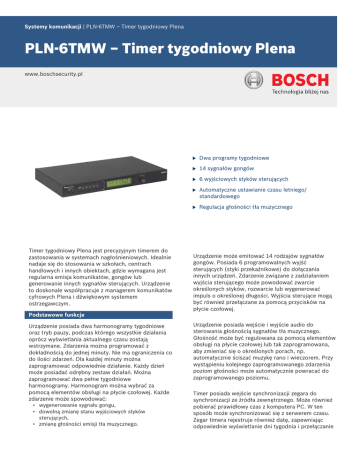 Systemy komunikacji | PLN‑6TMW – Timer tygodniowy Plena PLN‑6TMW – Timer tygodniowy Plena www.boschsecurity.pl Timer tygodniowy Plena jest precyzyjnym timerem do zastosowania w systemach nagłośnieniowych. Idealnie nadaje się do stosowania w szkołach, centrach handlowych i innych obiektach, gdzie wymagana jest regularna emisja komunikatów, gongów lub generowanie innych sygnałów sterujących. Urządzenie to doskonale współpracuje z managerem komunikatów cyfrowych Plena i dźwiękowym systemem ostrzegawczym. Podstawowe funkcje Urządzenie posiada dwa harmonogramy tygodniowe oraz tryb pauzy, podczas którego wszystkie działania oprócz wyświetlania aktualnego czasu zostają wstrzymane. Zdarzenia można programować z dokładnością do jednej minuty. Nie ma ograniczenia co do ilości zdarzeń. Dla każdej minuty można zaprogramować odpowiednie działanie. Każdy dzień może posiadać odrębny zestaw działań. Można zaprogramować dwa pełne tygodniowe harmonogramy. Harmonogram można wybrać za pomocą elementów obsługi na płycie czołowej. Każde zdarzenie może spowodować: • wygenerowanie sygnału gongu, • dowolną zmianę stanu wyjściowych styków sterujących, • zmianę głośności emisji tła muzycznego. u Dwa programy tygodniowe u 14 sygnałów gongów u 6 wyjściowych styków sterujących u Automatyczne ustawianie czasu letniego/ standardowego u Regulacja głośności tła muzycznego Urządzenie może emitować 14 rodzajów sygnałów gongów. Posiada 6 programowalnych wyjść sterujących (styki przekaźnikowe) do dołączania innych urządzeń. Zdarzenie związane z zadziałaniem wyjścia sterującego może powodować zwarcie określonych styków, rozwarcie lub wygenerować impuls o określonej długości. Wyjścia sterujące mogą być również przełączane za pomocą przycisków na płycie czołowej. Urządzenie posiada wejście i wyjście audio do sterowania głośnością sygnałów tła muzycznego. Głośność może być regulowana za pomocą elementów obsługi na płycie czołowej lub tak zaprogramowana, aby zmieniać się o określonych porach, np. automatycznie ściszać muzykę rano i wieczorem. Przy wystąpieniu kolejnego zaprogramowanego zdarzenia poziom głośności może automatycznie powracać do zaprogramowanego poziomu. Timer posiada wejście synchronizacji zegara do synchronizacji ze źródła zewnętrznego. Może również pobierać prawidłowy czas z komputera PC. W ten sposób może synchronizować się z serwerem czasu. Zegar timera rejestruje również datę, zapewniając odpowiednie wyświetlanie dni tygodnia i przełączanie 2 | PLN‑6TMW – Timer tygodniowy Plena czasu letniego i standardowego (zgodnie ze standardem europejskim, północno-amerykańskim, zgodnie z datami zdefiniowanymi przez użytkownika lub bez tej funkcji). Timer może być zasilany ze źródła rezerwowego 24 V (wejście posiada zabezpieczenie przed odwróceniem polaryzacji). Posiada również wewnętrzną baterię podtrzymującą ustawienia czasu. Synchronizacja i programowanie odbywa się za pośrednictwem portu USB. Programować można również bezpośrednio za pomocą elementów obsługi na płycie czołowej. Złącze RS-232 umożliwia dołączenie większego wyświetlacza. Certyfikaty i świadectwa Standardy bezpieczeństwa Zgodnie z normą EN 60065 Odporność Zgodnie z normą EN 55103-2 Emisja Zgodnie z normą EN 55103-1 Całkowite zniekształcenia harmoniczne <0,01% (1 kHz) Stosunek sygnał / szum <85 dB Zakres dynamiki >100 dB Wejście liniowe 1x Złącze XLR symetryczne Czułość 1V Impedancja >5 kΩ Margines przesterowania >25 dB Wyjście liniowe 1x Złącze XLR symetryczne Impedancja >100 Ω Zegar Region Certyfikacja Dokładność (bez synchronizacji) 25°C: poniżej 2 s / miesiąc -10°C ÷ 55°C: poniżej 3,5 s / miesiąc Europa CE Wejście synchronizacji Styk zwierny, zwarcie styku powoduje synchronizację do najbliższej godziny Planowanie Styki wyjściowe Płyta tylna Złącze MC 1,5/6-ST-3,5 Wartości znamionowe 100 V, 1 A, beznapięciowe Parametry mechaniczne Dołączone części Wymiary (wys. x szer. x gł.) 48 x 440 x 312 mm (bez wsporników, z nóżkami) 44 x 483 x 312 mm (ze wspornikami, bez nóżek) Ilość Element 1 PLN-6TMW Timer tygodniowy Plena 1 Kabel zasilania Ciężar Ok. 3 kg 1 Zestaw wsporników montażowych 19" Montaż 1 Płyta CD Plena Jako urządzenie wolnostojące, w szafie typu Rack 19” 1 Instrukcja obsługi Kolor Grafitowy z elementami srebrnymi Parametry środowiskowe Dane techniczne Parametry elektryczne Zasilanie sieciowe Napięcie 230 / 115 VAC, ±15%, 50 / 60 Hz Maks. pobór mocy 30 W -10°C ÷ +55°C Temperatura przechowywania -40°C ÷ +70°C Wilgotność względna < 95% Zamówienia - informacje PLN‑6TMW – Timer tygodniowy Plena Zasilanie rezerwowe (akumulatory) Napięcie 24 VDC, +15% / -15% Maks. pobór prądu 1A Parametry użytkowe Pasmo przenoszenia Temperatura pracy 20 Hz - 20 kHz (-3 dB) do regularnej emisji komunikatów, sygnałów lub innych sygnałów sterujących. Numer zamówienia PLN-6TMW 3 | PLN‑6TMW – Timer tygodniowy Plena Reprezentowana przez: Poland Robert Bosch Sp. z o.o. Jutrzenki 105 str. 02-231 Warszawa Phone: +48 22 715 4101 Fax: +48 22 715 4105 [email protected] www.boschsecurity.pl © Robert Bosch Sp. z o.o./ Security Systems 2012 | Zastrzega się możliwość wprowadzania zmian 1891344011 | pl, V1, 23. Lis 2012