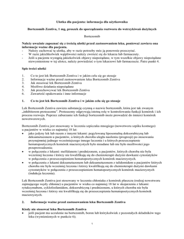 Ulotka dla pacjenta: informacja dla użytkownika Bortezomib Zentiva, 1 mg, proszek do sporządzania roztworu do wstrzykiwań dożylnych Bortezomib Należy uważnie zapoznać się z treścią ulotki przed zastosowaniem leku, ponieważ zawiera ona informacje ważne dla pacjenta. Należy zachować tę ulotkę, aby w razie potrzeby móc ją ponownie przeczytać. W razie jakichkolwiek wątpliwości należy zwrócić się do lekarza lub farmaceuty. Jeśli u pacjenta wystąpią jakiekolwiek objawy niepożądane, w tym wszelkie objawy niepożądane niewymienione w tej ulotce, należy powiedzieć o tym lekarzowi lub farmaceucie. Patrz punkt 4. Spis treści ulotki 1. 2. 3. 4. 5. 6. Co to jest lek Bortezomib Zentiva i w jakim celu się go stosuje Informacje ważne przed zastosowaniem leku Bortezomib Zentiva Jak stosować lek Bortezomib Zentiva Możliwe działania niepożądane Jak przechowywać lek Bortezomib Zentiva Zawartość opakowania i inne informacje 1. Co to jest lek Bortezomib Zentiva i w jakim celu się go stosuje Lek Bortezomib Zentiva zawiera substancję czynną o nazwie bortezomib, która jest tak zwanym „inhibitorem proteasomu”. Proteasomy odgrywają istotną rolę w kontrolowaniu funkcji komórek i ich procesu rozwoju. Poprzez zaburzanie ich funkcji bortezomib może prowadzić do śmierci komórek nowotworowych. Bortezomib Zentiva jest stosowany w leczeniu szpiczaka mnogiego (nowotworu szpiku kostnego) u pacjentów w wieku co najmniej 18 lat: jako jedyny lek lub razem z innymi lekami: pegylowaną liposomalną doksorubicyną lub deksametazonem u pacjentów, u których choroba uległa nasileniu (progresji) po stosowaniu przynajmniej jednego wcześniejszego innego leczenia i u których przeszczepienie hematopoetycznych komórek macierzystych było nieudane lub nie było możliwości jego przeprowadzenia; w połączeniu z lekami: melfalanem i prednizonem, u pacjentów, których choroba nie była wcześniej leczona i którzy nie kwalifikują się do chemioterapii dużymi dawkami cytostatyków w połączeniu z przeszczepieniem hematopoetycznych komórek macierzystych. w połączeniu z lekami deksametazonem lub deksametazonem z talidomidem u pacjentów których choroba nie była wcześniej leczona i którzy kwalifikują się do chemioterapii dużymi dawkami cytostatyków w połączeniu z przeszczepieniem hematopoetycznych komórek macierzystych (indukcja leczenia). Lek Bortezomib Zentiva jest stosowany w leczeniu chłoniaka z komórek płaszcza (rodzaj nowotworu zajmującego węzły chłonne) u pacjentów w wieku co najmniej 18 lat w skojarzeniu z lekami: rytuksymabem, cyklofosfamidem, doksorubicyną i prednizonem, u których choroba nie była wcześniej leczona i którzy nie kwalifikują się do przeszczepienia hematopoetycznych komórek macierzystych. 2. Informacje ważne przed zastosowaniem leku Bortezomib Zentiva Kiedy nie stosować leku Bortezomib Zentiva jeśli pacjent ma uczulenie na bortezomib, boron lub którykolwiek z pozostałych składników tego leku (wymienionych w punkcie 6); 1 jeśli pacjent ma szczególnie ciężkie choroby płuc lub serca. Ostrzeżenia i środki ostrożności Przed rozpoczęciem stosowania leku Bortezomib Zentiva należy omówić to z lekarzem, jeśli u pacjenta: stwierdza się małą liczbę krwinek czerwonych lub białych; stwierdza się zaburzenia krwawienia i (lub) małą liczbę płytek krwi; występują biegunka, zaparcia, nudności lub wymioty; występowały w przeszłości omdlenia, zawroty głowy i zamroczenia; stwierdza się choroby nerek; stwierdza się umiarkowane do ciężkich zaburzenia czynności wątroby; występowały w przeszłości drętwienia, cierpnięcia i bóle rąk oraz stóp (objawy neuropatii); stwierdza się choroby serca lub problemy z ciśnieniem tętniczym krwi; stwierdza się skrócenie oddechu lub kaszel; drgawki; półpasiec (wokół oczu lub rozsiany po całym ciele); objawy zespołu rozpadu guza, takie jak skurcze mięśni, osłabienie mięśni, splątanie, utrata lub zaburzenia widzenia oraz duszność; występuje utrata pamięci, zaburzenia myślenia, trudności z chodzeniem lub utrata widzenia. Mogą być to objawy ciężkiego zakażenia mózgu a lekarz może zalecić dalsze badania i obserwację. U pacjenta muszą być przeprowadzane regularne badania krwi przed i w trakcie leczenia lekiem Bortezomib Zentiva w celu regularnego sprawdzania liczby krwinek. Jeśli pacjent ma chłoniaka z komórek płaszcza a razem z lekiem Bortezomib Zentiva otrzymuje lek zawierający rytuksymab, należy powiedzieć o tym lekarzowi: jeśli pacjent podejrzewa zakażenie wirusem zapalenia wątroby lub miał je w przeszłości. W kilku przypadkach, pacjenci, którzy mieli zakażenie WZW B mogli mieć powtarzające się incydenty zapalenia wątroby, które mogły mieć skutek śmiertelny. Jeśli pacjent ma zakażenie WZW B w wywiadzie, będzie dokładnie obserwowany przez lekarza czy nie występują u niego objawy czynnego WZW B. Przed rozpoczęciem leczenia Bortezomib Zentiva należy dokładnie przeczytać ulotki wszystkich produktów leczniczych przyjmowanych podczas leczenia w celu uzyskania informacji o nich. W przypadku przyjmowania talidomidu, należy wykluczyć ciążę, a następnie stosować skuteczną antykoncepcję (patrz punkt Ciąża i karmienie piersią). Dzieci i młodzież Lek Bortezomib Zentiva nie powinien być stosowany u dzieci i młodzieży, gdyż nie wiadomo jak lek działa w tej grupie osób. Lek Bortezomib Zentiva a inne leki Należy powiedzieć lekarzowi o wszystkich lekach przyjmowanych przez pacjenta obecnie lub ostatnio a także o lekach, które pacjent planuje stosować. W szczególności należy poinformować lekarza prowadzącego, jeżeli pacjent stosuje leki zawierające którąkolwiek z niżej wymienionych substancji czynnych: ketokonazol, stosowany w leczeniu zakażeń grzybiczych; rytonawir, stosowany w leczeniu zakażenia HIV; ryfampicyna, antybiotyk stosowany w leczeniu zakażeń bakteryjnych; karbama