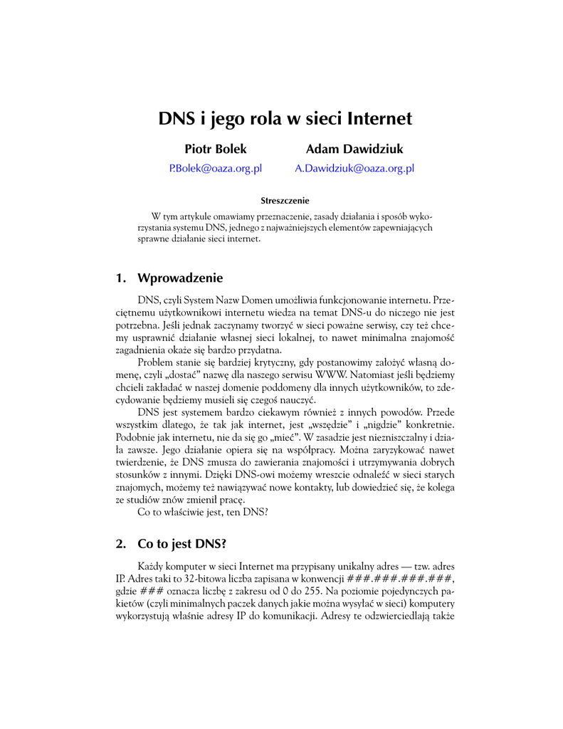 DNS i jego rola w sieci Internet Piotr Bolek Adam Dawidziuk [email protected] [email protected] -Streszczenie W tym artykule omawiamy przeznaczenie, zasady działania i sposób wykorzystania systemu DNS, jednego z najważniejszych elementów zapewniających sprawne działanie sieci internet. 1. Wprowadzenie DNS, czyli System Nazw Domen umożliwia funkcjonowanie internetu. Przeciętnemu użytkownikowi internetu wiedza na temat DNS-u do niczego nie jest potrzebna. Jeśli jednak zaczynamy tworzyć w sieci poważne serwisy, czy też chcemy usprawnić działanie własnej sieci lokalnej, to nawet minimalna znajomość zagadnienia okaże się bardzo przydatna. Problem stanie się bardziej krytyczny, gdy postanowimy założyć własną domenę, czyli „dostać” nazwę dla naszego serwisu WWW. Natomiast jeśli będziemy chcieli zakładać w naszej domenie poddomeny dla innych użytkowników, to zdecydowanie będziemy musieli się czegoś nauczyć. DNS jest systemem bardzo ciekawym również z innych powodów. Przede wszystkim dlatego, że tak jak internet, jest „wszędzie” i „nigdzie” konkretnie. Podobnie jak internetu, nie da się go „mieć”. W zasadzie jest niezniszczalny i działa zawsze. Jego działanie opiera się na współpracy. Można zaryzykować nawet twierdzenie, że DNS zmusza do zawierania znajomości i utrzymywania dobrych stosunków z innymi. Dzięki DNS-owi możemy wreszcie odnaleźć w sieci starych znajomych, możemy też nawiązywać nowe kontakty, lub dowiedzieć się, że kolega ze studiów znów zmienił pracę. Co to właściwie jest, ten DNS? 2. Co to jest DNS? Każdy komputer w sieci Internet ma przypisany unikalny adres — tzw. adres IP. Adres taki to 32-bitowa liczba zapisana w konwencji ###.###.###.###, gdzie ### oznacza liczbę z zakresu od 0 do 255. Na poziomie pojedynczych pakietów (czyli minimalnych paczek danych jakie można wysyłać w sieci) komputery wykorzystują właśnie adresy IP do komunikacji. Adresy te odzwierciedlają także Piotr Bolek, Adam Dawidziuk: DNS i jego rola w sieci Internet 2 fizyczną strukturę sieci internet. Nie będziemy się wdawać w szczegóły techniczne, ale np. na podstawie adresu komputer może stwierdzić czy odbiorca danego pakietu znajduje się w tej samej sieci fizycznej i można mu doręczyć dane bez żadnych pośredników, czy też trzeba przekazać je do innego „mądrzejszego” węzła sieci, który będzie wiedział, co dalej z takim pakietem zrobić. Adresy IP są więc nieodzowne do funkcjonowania sieci w jej najniższych warstwach. Ale przesyłanie pakietów między komputerami już dawno przestało być sztuką dla sztuki, stało się środkiem służącym do komunikacji między ludźmi. A ludzie, jak to ludzie nie są specjalnie biegli w zapamiętywaniu przypadkowych numerów. Za to zwykle wiedzą czego szukają, albo do kogo chcą wysłać list. I dlatego konieczne stało się nadawanie komputerom w sieci nie tylko adresów numerycznych ale także nazw tekstowych, które mówią coś np. na temat właściciela, położenia geograficznego czy przeznaczenia danej maszyny. Możliwe jest także nadawanie podobnych nazw maszynom, które mimo iż mogą być bardzo odległe geograficznie, to spełniają podobne funkcje, albo należą do tego samego właściciela. System DNS (ang. Domain Name System czyli System Nazw Domen) jest, mówiąc najkrócej, bazą danych służącą do odwzorowywania adresów tekstowych w numeryczne i odwrotnie. W tej bazie dostępne są także informacje nieco innego typu, np. jaka maszyna obsługuje pocztę dla danego ośrodka. Stwierdzenie, że DNS jest bazą danych może być nieco mylące nawet dla ludzi, którzy coś o bazach danych słyszeli. Większość użytkowników kojarzy sobie bazę danych z systemami takimi jak MS-Access, Clipper, Oracle, FoxPro, SQL czy Postgress. Czyli ogólnie, że jest jakiś maszyneria, która w sobie znanym formacie i w tajemniczy sposób zarządza danymi, umożliwia wyszukiwanie, robienie raportów, zestawień itd. Baza danych kojarzy się często także z komputerem mającym ogromne dyski, na których zapisane są olbrzymie ilości danych. Inne komputery mogą oczywiście sięgać do zawartości tej dużej bazy danych, ale są od niej zupełnie uzależnione — żeby dotrzeć do jakiejś informacji — muszą skontaktować się z serwerem bazy danych. Wyobrażenia te opierają się na pojęciu centralizacji kompetencji i dostępu. Dane w sieci są dostępne, ale jest jedno miejsce, gdzie znajduje się źródło ich wszystkich. Tego typu schemat ma niestety niezwykle niemiła przypadłość. Jeśli baza danych ma obsługiwać bardzo dużą sieć (np. globalną taką jak internet) to ten centralny serwer staje się niesłychanie wąskim gardłem. Obciążenie jego samego i wszystkich jego łączy błyskawicznie osiągnęłoby niewyobrażalny poziom. Dlatego w systemie DNS zastosowano inne podejście. System adresowych baz danych w internecie jest systemem rozproszonym. I to rozproszonym w sposób niezwykły. Po pierwsze nie ma żadnego centralnego serwera, który zawierałby informacje o wszystkich maszynach w sieci. Po drugie nie ma żadnego centralnego Piotr Bolek, Adam Dawidziuk: DNS i jego rola w sieci Internet 3 ośrodka, który przydzielałby adresy. Nie ma także jednego źródła informacji w tej bazie. Każdy administrator sieci lokalnej dołączonej do internetu jest częściowo odpowiedzialny za system DNS i związane z nim obciążenie sieci. Skoro nie ma żadnego centralnego banku danych, to jak to w ogóle działa? A zwykle działa sprawnie i niezawodnie. Powodem problemów z działaniem DNS-u są właściwie wyłącznie błędy albo niedopatrzenia ludzi. System działa, ponieważ jest przemyślany, starannie zaprojektowany, zestandaryzowany (a jednak jednocześnie otwarty i rozszerzalny) i efektywnie zaimplementowany. Cały system DNS opisany jest w odpowiednich dokumentach (rfc1034 i rfc1035) i wszyscy, którzy implementują
