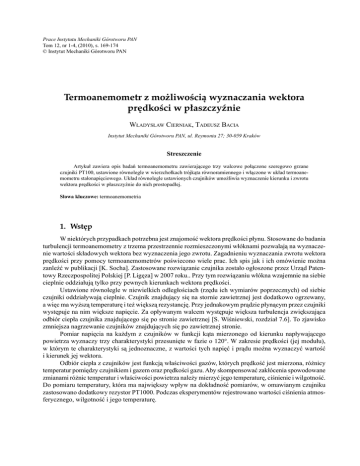 169 Prace Instytutu Mechaniki Górotworu PAN Tom 12, nr 1-4, (2010), s. 169-174 © Instytut Mechaniki Górotworu PAN Termoanemometr z możliwością wyznaczania wektora prędkości w płaszczyźnie WŁADYSŁAW CIERNIAK, TADEUSZ BACIA Instytut Mechaniki Górotworu PAN, ul. Reymonta 27; 30-059 Kraków Streszczenie Artykuł zawiera opis badań termoanemometru zawierającego trzy walcowe połączone szeregowo grzane czujniki PT100, ustawione równolegle w wierzchołkach trójkąta równoramiennego i włączone w układ termoanemometru stałonapięciowego. Układ równolegle ustawionych czujników umożliwia wyznaczenie kierunku i zwrotu wektora prędkości w płaszczyźnie do nich prostopadłej. Słowa kluczowe: termoanemometria 1. Wstęp W niektórych przypadkach potrzebna jest znajomość wektora prędkości płynu. Stosowane do badania turbulencji termoanemometry z trzema przestrzennie rozmieszczonymi włóknami pozwalają na wyznaczenie wartości składowych wektora bez wyznaczenia jego zwrotu. Zagadnieniu wyznaczania zwrotu wektora prędkości przy pomocy termoanemometrów poświecono wiele prac. Ich spis jak i ich omówienie można zanleźć w publikacji [K. Socha]. Zastosowane rozwiązanie czujnika zostało ogłoszone przez Urząd Patentowy Rzeczpospolitej Polskiej [P. Ligęza] w 2007 roku.. Przy tym rozwiązaniu włókna wzajemnie na siebie cieplnie oddziałują tylko przy pewnych kierunkach wektora prędkości. Ustawione równolegle w niewielkich odległościach (rzędu ich wymiarów poprzecznych) od siebie czujniki oddziaływają cieplnie. Czujnik znajdujący się na stornie zawietrznej jest dodatkowo ogrzewany, a więc ma wyższą temperaturę i też większą rezystancję. Przy jednakowym prądzie płynącym przez czujniki występuje na nim większe napięcie. Za opływanym walcem występuje większa turbulencja zwiększająca odbiór ciepła czujnika znajdującego się po stronie zawietrznej [S. Wiśniewski, rozdział 7.6]. To zjawisko zmniejsza nagrzewanie czujników znajdujących się po zawietrznej stronie. Pomiar napięcia na każdym z czujników w funkcji kąta mierzonego od kierunku napływającego powietrza wyznaczy trzy charakterystyki przesunięte w fazie o 120°. W zakresie prędkości (jej modułu), w którym te charakterystyki są jednoznaczne, z wartości tych napięć i prądu można wyznaczyć wartość i kierunek jej wektora. Odbiór ciepła z czujników jest funkcją właściwości gazów, których prędkość jest mierzona, różnicy temperatur pomiędzy czujnikiem i gazem oraz prędkości gazu. Aby skompensować zakłócenia spowodowane zmianami różnic temperatur i właściwości powietrza należy mierzyć jego temperaturę, ciśnienie i wilgotność. Do pomiaru temperatury, która ma największy wpływ na dokładność pomiarów, w omawianym czujniku zastosowano dodatkowy rezystor PT1000. Podczas eksperymentów rejestrowano wartości ciśnienia atmosferycznego, wilgotność i jego temperaturę. 170 Władysław Cierniak, Tadeusz Bacia 2. Budowa przyrządu i stanowiska pomiarowego Rysunek czujnika jest pokazany na rysunku (1), a jego zdjęcie na rysunku (2), a uproszczony schemat ideowy jest pokazany na rysunku (3). Na rysunku (4) został pokazany przykładowy opływ powietrza wokół czujnika. Rys. 1. Rysunek czujnika bez osłony Rys. 2; Zdjęcie czujnika Wzmacniacz Wp, którego wzmocnienie jest większe niż milion wzmacnia różnicę napięć U1 i Uo zasilając swoim napięciem wyjściowym połączone w szereg: rezystor RI oraz trzy rezystory PT 100. Ze względu na bardzo duże wzmocnienie wzmacniacza Wp różnica pomiędzy napięciami U1 i Uo jest bardzo mała i można ją pominąć, przyjmując, że U1 = Uo. W miarę wzrostu prędkości powietrza czujnik nagrzewane prądem są chłodzone i maleje ich rezystancja. Przy stałym napięciu zasilania U1 rośnie płynące przez nie prąd. Występujące na czujnikach PT100 napięcia, wzmocnione przez wzmacniacze Wp1, Wp2 i Wp3, na rysunku oznaczone symbolami U1,U2,U3, razem z napięciem UI pozwalają wyznaczyć wektor prędkości. Aby to było możliwe konieczne jest wyznaczenie charakterystyk kątowych termoanemometru dla różnych prędkości. Czujnik PT1000 zasilany ze źródła prądowego I0 służy do pomiaru temperatury napływającego powietrza. 3. Wzorcowanie termometru czujnika Wzorcowanie termometru czujnik przeprowadzono w piecu OCEANUS 580 z szacowaną niepewnością 0.3°C w nieruchomym powietrzu. Jego charakterystykę opisuje wzór: T = 203.993UT – 264.953 (1) Termoanemometr z możliwością wyznaczania wektora prędkości w płaszczyźnie 171 Rys. 3. Uproszczony schemat termoanemometru Rys. 4. Przykład opływu powietrza wokół czujnika 4. Eksperymenty w tunelu Podczas eksperymentów mierzono na zewnątrz tunelu ciśnienie, temperaturę i wilgotność. W czasie prowadzenia eksperymentu zmiany ciśnienia atmosferycznego wynosiły 0.14%, temperatury około 1.2°C a wilgotności względnej rzędu 2%. Zmienność liczby Reynoldsa wywołana tymi zmianami nie powinna być większa niż 0.5%. Przyjmując w pierwszym przybliżeniu pierwiastkową zależność odbioru ciepła od liczy Reynoldsa, zmienność mocy zasilającej czujnik (prądu) można oszacować na około 0.3%. W tunelu 172 Władysław Cierniak, Tadeusz Bacia aerodynamicznym mierzono temperaturę powietrza termometrem wbudowanym w czujnik. Ponad to z pomiaru prądu płynącego przez trzy czujniki PT100 (napięcie UI /400) składające się na czujnik prędkości oraz z napięcia je zasilającego Uz = 6.21659 V, wyznaczono ich średnią temperaturę. Wykresy tych temper znajdują się na rysunku (5). Rys. 5. Wykresy temperatur na zewnątrz i wewnątrz tunelu aerodynamicznego, oraz średnia temperatura trzech termometrów PT100 (składających się na czujnik prędkości), w funkcji kąta obrotu czujnika przy prędkości powietrza 1 m/s. Ts – średnia temperatura czujnika prędkości, Tw – temperatura wewnątrz tunelu, Tz – temperatura