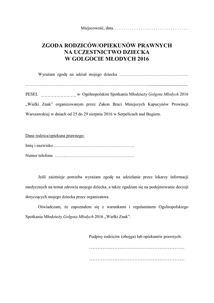 Miejscowość, data. . . . . . . . . . . . . . . . . . . . . . . . . . . . . . . . . . . ZGODA RODZICÓW/OPIEKUNÓW PRAWNYCH NA UCZESTNICTWO DZIECKA W GOLGOCIE MŁODYCH 2016 Wyrażam zgodę na udział mojego dziecka ………………………………………… …………………………………………………………………………....................................... PESEL _ _ _ _ _ _ _ _ _ _ _ w Ogólnopolskim Spotkaniu Młodzieży Golgota Młodych 2016 „Wielki Znak” organizowanym przez Zakon Braci Mniejszych Kapucynów Prowincji Warszawskiej w dniach od 25 do 29 sierpnia 2016 w Serpelicach nad Bugiem. Dane rodzica/opiekuna prawnego: Imię i nazwisko ……………………………………………….. Numer telefonu ……..………………………………………… Jeśli zaistnieje potrzeba wyrażam zgodę na udzielanie przez lekarzy informacji medycznych na temat zdrowia mojego dziecka, a także zgadzam się na podejmowanie decyzji dotyczących mojego dziecka przez organizatora. Oświadczam, że zapoznałem się z warunkami i regulaminem Ogolnopolskiego Spotkania Młodzieży Golgota Młodych 2016 „Wielki Znak”. Podpisy rodziców (obojga) lub opiekunów prawnych: ………………………………………………… …………………………………………………