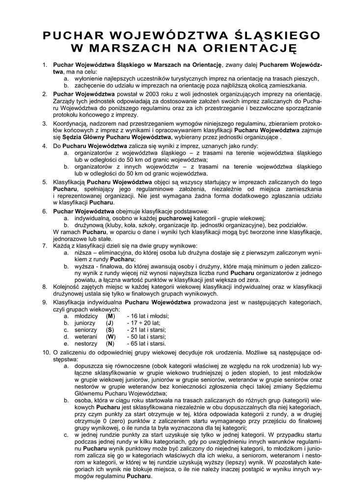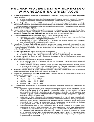 PUCHAR WOJEWÓDZTWA ŚL ĄSKIEGO W MARSZACH NA ORIENT ACJĘ 1. Puchar Województwa Śląskiego w Marszach na Orientację, zwany dalej Pucharem Województwa, ma na celu: a. wyłonienie najlepszych uczestników turystycznych imprez na orientację na trasach pieszych, b. zachęcenie do udziału w imprezach na orientację poza najbliższą okolicą zamieszkania. 2. Puchar Województwa powstał w 2003 roku z woli jednostek organizujących imprezy na orientację. Zarządy tych jednostek odpowiadają za dostosowanie założeń swoich imprez zaliczanych do Pucharu Województwa do poniższego regulaminu oraz za ich przestrzeganie i bezzwłoczne sporządzanie protokołu końcowego z imprezy. 3. Koordynacją, nadzorem nad przestrzeganiem wymogów niniejszego regulaminu, zbieraniem protokołów końcowych z imprez z wynikami i opracowywaniem klasyfikacji Pucharu Województwa zajmuje się Sędzia Główny Pucharu Województwa, wybierany przez jednostki organizujące . 4. Do Pucharu Województwa zalicza się wyniki z imprez, uznanych jako rundy: a. organizatorów z województwa śląskiego – z trasami na terenie województwa śląskiego lub w odległości do 50 km od granic województwa; b. organizatorów z innych województw – z trasami na terenie województwa śląskiego lub w odległości do 50 km od granic województwa. 5. Klasyfikacją Pucharu Województwa objęci są wszyscy startujący w imprezach zaliczanych do tego Pucharu, spełniający jego regulaminowe założenia, niezależnie od miejsca zamieszkania i reprezentowanej organizacji. Nie jest wymagana żadna forma dodatkowego zgłaszania udziału w klasyfikacji Pucharu. 6. Puchar Województwa obejmuje klasyfikacje podstawowe: a. indywidualną, osobno w każdej pucharowej kategorii - grupie wiekowej; b. drużynową (kluby, koła, szkoły, organizacje itp. jednostki organizacyjne), bez podziałów. W ramach Pucharu, w oparciu o dane i wyniki tych klasyfikacji mogą być tworzone inne klasyfikacje, jednorazowe lub stałe. 7. Każdą z klasyfikacji dzieli się na dwie grupy wynikowe: a. niższa – eliminacyjna, do której osoba lub drużyna dostaje się z pierwszym zaliczonym wynikiem z rundy Pucharu; b. wyższa - finałowa, do której awansują osoby i drużyny, które mają minimum o jeden zaliczony wynik z rundy więcej niż wynosi najwyższa liczba rund Pucharu organizatorów z jednego powiatu, a łączna wartość punktów w klasyfikacji jest większa od zera. 8. Kolejność zajętych miejsc w każdej kategorii wiekowej klasyfikacji indywidualnej oraz w klasyfikacji drużynowej ustala się tylko w finałowych grupach wynikowych. 9. Klasyfikacja indywidualna Pucharu Województwa prowadzona jest w następujących kategoriach, czyli grupach wiekowych: a. młodzicy (M) - 16 lat i młodsi; b. juniorzy (J) - 17 ÷ 20 lat; c. seniorzy (S) - 21 lat i starsi; d. weterani (W) - 50 lat i starsi; e. nestorzy (N) - 65 lat i starsi. 10. O zaliczeniu do odpowiedniej grupy wiekowej decyduje rok urodzenia. Możliwe są następujące odstępstwa: a. dopuszcza się równoczesne (obok kategorii właściwej ze względu na rok urodzenia) lub wyłączne sklasyfikowanie w grupie wiekowo trudniejszej o jeden stopień, to jest młodzików w grupie wiekowej juniorów, juniorów w grupie seniorów, weteranów w grupie seniorów oraz nestorów w grupie weteranów bez konieczności zgłoszenia chęci takiej zmiany Sędziemu Głównemu Pucharu Województwa; b. osoba, która w ciągu roku startowała na trasach zaliczanych do różnych grup (kategorii) wiekowych Pucharu jest sklasyfikowana niezależnie w obu dopuszczalnych dla niej kategoriach, przy czym punkty za start otrzymuje w tej, która odpowiada kategorii z rundy, a w drugiej otrzymuje 0 (zero) punktów z zaliczeniem startu wymaganego przy przejściu do finałowej grupy wynikowej, o ile runda ta była wyznaczona dla tej kategorii; c. w jednej rundzie punkty za start uzyskuje się tylko w jednej kategorii. W przypadku startu podczas jednej rundy w kilku kategoriach, gdy po uwzględnieniu innych warunków regulaminu Pucharu wynik punktowy może być zaliczony do niejednej kategorii, to młodzikom i juniorom zalicza się go w kategoriach właściwych dla ich wieku, a seniorom, weteranom i nestorom w kategorii, w której w tej rundzie uzyskują wyższy (lepszy) wynik. W pozostałych kategoriach ich wynik nie blokuje miejsca, o ile nie należy inaczej postąpić w wyniku innych wymogów regulaminu Pucharu. 11. Prawo do zmiany grupy wiekowej na trudniejszą pozwala na dobieranie do składów startujących zespołów osób z różnych pucharowych kategorii – grup wiekowych, jednak w ograniczonym zakresie. Wpływ mieszania składów na zaliczanie wyników do klasyfikacji indywidualnej Pucharu jest następujący: a. w klasyfikacji grupy młodzików pomija się wyniki zespołów o mieszanych składach; b. do klasyfikacji grupy juniorów zalicza się wynik startu młodzika z juniorem; c. do klasyfikacji grupy seniorów zalicza się wynik startu juniora z seniorem, juniora z weteranem, weterana z seniorem; d. do klasyfikacji grupy seniorów zalicza się wynik startu juniora, seniora i weterana w przypadku ich tworzenia zespołu z młodzikiem lub nestorem (partnerowi wyniku nie zalicza się); e. do klasyfikacji grupy weteranów zalicza się wynik startu nestora z weteranem; f. do klasyfikacji grupy weteranów zalicza się wynik startu weterana w przypadku tworzenia zespołu z młodzikiem (młodzikowi wyniku nie zalicza się); g. do klasyfikacji grupy nestorów zalicza się wynik startu nestora w przypadku tworzenia zespołu z młodym partnerem w wieku rocznikowo 13 lat lub młodszym (partnerowi wyniku nie zalicza się). 12. Młodzik oraz junior, startujący w rundzie Pucharu w kategorii w kategorii właściwej dla swojego wieku, z osobą o wieku właściwym dla kategorii starszej ma zaliczony start, za który uzyskuje 0 (zero) punktów, ale startu tego nie ma zaliczonego osoba starsza, a ich wynik jest pomijany w klasyf