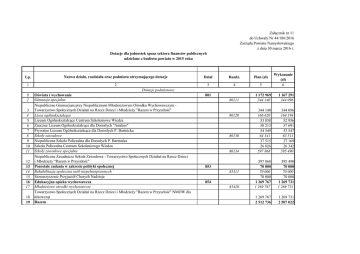 Załącznik nr 11 do Uchwały Nr 44/186/2016 Zarządu Powiatu Namysłowskiego z dnia 30 marca 2016 r. Dotacje dla jednostek spoza sektora finansów publicznych udzielane z budżetu powiatu w 2015 roku Lp. Nazwa działu, rozdziału oraz podmiotu otrzymującego dotacje Dział Rozdz. Plan (zł) 1 2 3 4 5 Wykonanie (zł) 6 Dotacje podmiotowe 1 2 3 4 5 6 7 8 9 10 11 12 13 14 15 16 17 18 19 Oświata i wychowanie Gimnazja specjalne Niepubliczne Gimnazjum przy Niepublicznym Młodzieżowym Ośrodku Wychowawczym Towarzystwo Społecznych Działań na Rzecz Dzieci i Młodzieży "Razem w Przyszłość" Licea ogólnokształcące Liceum Ogólnokształcące Centrum Szkoleniowe Wiedza Zaoczne Liceum Ogólnokształcące dla Dorosłych "Amikus" Prywatne Liceum Ogólnokształcące dla Dorosłych P. Bartnicka Szkoły zawodowe Niepubliczna Szkoła Policealna dla Dorosłych P. Bartnicka Szkoła Policealna Centrum Szkoleniowgo Wiedza Szkoły zawodowe specjalne Niepubliczna Zasadnicza Szkoła Zawodowa - Towarzystwo Społecznych Działań na Rzecz Dzieci i Młodzieży "Razem w Przyszłość" Pozostałe zadania w zakresie polityki społecznej Rehabilitacja społeczna osób niepełnosprawnych Stowarzyszenie Przyjaciół Chorych Nadzieja Edukacyjna opieka wychowawcza Młodzieżowe ośrodki wychowawcze Towarzystwo Społecznych Działań na Rzecz Dzieci i Młodzieży "Razem w Przyszłość" NMOW dla dziewcząt Razem 801 80111 80120 80130 80134 853 85311 854 85420 1 172 969 344 140 1 167 291 344 096 344 140 166 620 53 858 58 213 54 549 64 341 37 515 26 826 597 868 344 096 164 194 52 956 57 691 53 547 63 511 37 169 26 342 595 490 597 868 70 000 70 000 70 000 1 269 767 1 269 767 595 490 70 000 70 000 70 000 1 269 731 1 269 731 1 269 767 2 512 736 1 269 731 2 507 022 27 28 29 Dotacje celowe Bezpieczeństwo publiczne i ochrona przeciwpożarowa Ochotnicze straże pożarne Ochotnicza Straż Pożarna w Domaradzu Ochotnicza Straż Pożarna w Rychnowie Ochrona zdrowia Szpitale ogólne Namysłowskie Centrum Zdrowia S.A. Składki na ubezpieczenie zdrowowotne oraz świadczenia dla osób nieobjętych obowiązkiem ubezpieczenia zdrowotnego Towarzystwo Społecznych Działań na Rzecz Dzieci i Młodzieży "Razem w Przyszłość" Pomoc społeczna 30 31 32 33 32 33 34 35 36 Jednostki specjalistyczne poradnictwa, mieszkania chronione i ośrodki interwencji kryzysowej Towarzystwo Społecznych Działań na Rzecz Dzieci i Młodzieży "Razem w Przyszłość" Pozostała działalność Bank Żywności Edukacyjna opieka wychowawcza Młodzieżowe ośrodki wychowawcze Towarzystwo Społecznych Działań na Rzecz Dzieci i Młodzieży "Razem w Przyszłość" Kultura i ochrona dziedzctwa narodowego Ochrona zabytków i opieka nad zabytkami 37 38 39 40 41 42 Parafia Rzymsko - Katolicka p.w. Wniebowzięcia Najświętszej Maryi Panny w Ligocie Ksiażęcej Parafia Rzymsko - Katolicka p.w. Św. Jana Chrzciciela w Rychnowie Parafia Rzymsko - Katolicka p.w. Najświętszego Serca Pana Jezusa w Przeczowie Parafia Rzymsko - Katolicka p.w. Św. Michała Archanioła w Michalicach Parafia Rzymsko - Katolicka p.w. Św. Jana Chrzciciela w Smogorzowie Parafia Rzymsko - Katolicka p.w. Wszystkich Świetych w Głuszynie Parafia Rzymsko - Katolicka p.w. Niepokalanego Poczęcia Najświętszej Maryi Panny w Kowalowicach Razem Ogółem 20 21 22 23 24 25 26 754 6 000 6 000 1 000 5 000 201 358 200 000 200 000 6 000 6 000 1 000 5 000 200 187 200 000 200 000 85156 1 358 1 358 17 000 187 187 16 978 85220 14 000 14 000 3 000 3 000 2 220 937 2 220 937 2 220 937 136 454 136 454 13 978 13 978 3 000 3 000 2 212 073 2 212 073 2 212 073 134 454 134 454 25 000 10 000 12 000 24 454 30 000 5 000 25 000 10 000 10 000 24 454 30 000 5 000 30 000 2 581 749 5 094 485 30 000 2 569 692 5 076 714 75412 851 85111 852 85295 854 85420 921 43 44 45 * w 2015 r. z budżetu powiatu dla jednostek spoza sektora finansów publicznych nie udzielano dotacji przedmiotowych 92120