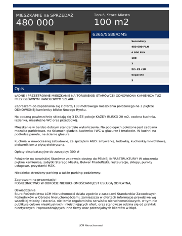 Toruń, Stare Miasto MIESZKANIE na SPRZEDAŻ 100 m2 480 000 6365/5588/OMS Secondary 480 000 PLN 4 800 PLN 100 3 22+22+18 Separate 3 Opis ŁADNE I PRZESTRONNE MIESZKANIE NA TORUŃSKIEJ STARÓWCE! ODNOWIONA KAMIENICA TUŻ PRZY GŁÓWNYM HANDLOWYM SZLAKU. Zapraszam do zapoznania się z ofertą 100 metrowego mieszkania położonego na 3 piętrze ODNOWIONEJ kamienicy blisko Nowego Rynku. Na podaną powierzchnię składają się 3 DUŻE pokoje KAŻDY BLISKO 20 m2, osobna kuchnia, łazienka, niezależne WC oraz przedpokój. Mieszkanie w bardzo dobrym standardzie wykończenia. Na podłogach położona jest zadbana mozaika parkietowa, na ścianach gładzie. Łazienka i WC w glazurze i terakocie. W kuchni na podłodze panele, na ścianie glazura. Kuchnia w nowoczesnej zabudowie, ze sprzętem AGD: zmywarką, lodówką, kuchenką mikrofalową, piekarnikiem z płytą elektryczną. Opłaty eksploatacyjne do zarządcy: 300 zł Położenie na toruńskiej Starówce zapewnia dostęp do PEŁNEJ INFRASTRUKTURY! W otoczeniu piękne kamienice, zabytki Starego Miasta, Bulwar Filadelfijski, restauracje, sklepy, punkty usługowe, przystanki MZK. Niedaleko strzeżony parking a także parking podziemny. Zapraszam na prezentację! POŚREDNICTWO W OBROCIE NIERUCHOMOŚCIAMI JEST USŁUGĄ ODPŁATNĄ. Oświadczenie Biuro Pośrednictwa LCM Nieruchomości działa zgodnie z zasadami Standardów Zawodowych Pośredników w Obrocie Nieruchomościami, zamieszcza w ofertach informacje prawdziwe wg wszelkiej wiedzy i starania, nie łamie regulaminów serwisów nieruchomościowych, w tym nie publikuje celowo nieaktualnych i nieistniejących ofert, oraz stanowczo odcina się od praktyk nieetycznych i wprowadzających inne firmy oraz potencjalnych klientów w błąd. LCM Nieruchomosci ZAPEWNIAMY BEZPŁATNE I PROFESJONALNE DORADZTWO W ZAKRESIE POZYSKIWANIA KREDYTÓW HIPOTECZNYCH NA ZAKUP NIERUCHOMOŚCI Powyższe informacje zostały sporządzone na podstawie oświadczeń i nie są ofertą w rozumieniu przepisów Kodeksu Cywilnego. Mają one jedynie charakter informacyjny. Joanna Bucewicz tel. 793941092 email: [email protected] LCM Nieruchomosci Powered by TCPDF (www.tcpdf.org)