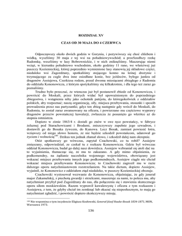 ROZDZIAŁ XV CZAS OD 30 MAJA DO 4 CZERWCA Odpocząwszy około dwóch godzin w Goryniu, i pożywiwszy się choć chlebem i wódką, wyszliśmy 30 maja z tej wsi na południowywschód; a przeSzedłszy rzekę Radomkę, weszliśmy w lasy Bobrownickie, i w nich zniknęliśmy. Maszerując niemi wciąż, w kierunku południowo wschodnim, około godziny 11 rano, we właściwej już puszczy Kozienieckiej, której poprzednio wymienione lasy stanowią jej składowe części, niedaleko wsi Zagożdżany, spotkaliśmy stojącego konno na leśnej drożynie i trzymającego za cugle dwa inne osiodłane konie, bez jeźdzców, byłego junkra od dragonów Assiejewa, Czerkiesa rodem, przed dwoma miesiącami zbiegłego z Radomia do oddziału Kononowicza, z którym spotykaliśmy się kilkakrotnie, i dla tego też zaraz go poznaliśmy. Trudno było przeczuć, że wtenczas już był postanowił zbiedz od Kononowicza, i powrócić do Moskali, przez których widać był upoważnionym do poprzedniego zbiegostwa, i wstąpienia niby jako ochotnik patrjota, do któregokolwiek z oddziałów polskich, aby rozpoznać; naszą organizację, siły, miejsca przebywania, stosunki i sposób prowadzenia przez nas partyzantki; gdyz ten zbieg następnie gdy wrócił do Moskali, do Radomia, to został zaraz awansowany na oficera, i powierzano mu częściowe wyprawy dragonów przeciw powstańczej kawalerji, zwłaszcza że posunięto go wkrótce aż do stopnia rotmistrza. Dopiero w zimie 1863/4 r. dostali go znów w swe ręce powstańcy, w fabryce żelaznej pod Starachowicami i Brodami, zniszczywszy zupełnie jego szwadron, i dostawili go do Bosaka żywcem, do Kunowa. Lecz Bosak, zamiast powiesić łotra, wziąwszy od niego słowo honoru, ze nie będzie szkodził powstańcom, udarował go życiem i wolnością100. Dzikus ten jednak złamał słowo, i szkodził dalej nam okropnie. Otóż spotkawszy go wówczas, zapytał Czachowski, co tu robił? Assiejew zmięszany, odpowiedział, ze czekał tu z rozkazu Kononowicza. Gdzie był wówczas oddział Kononowicza, badał go dalej nasz dowódzca. Assiejew wzbraniał się atoli dać na to wyjaśnienia, tłumacząc się, że mu to zakazano. A gdy mimo objaśnienia, że podkomendny, na żądianie naczelnika wojennego województwa, obowiązany jest wskazać miejsce przebywania innych jego podkomendnych, Assiejew ciągle nie chciał wskazać miejsca przebywania Kononowicza; to Czachowski zagroził mu w razie dalszego oporu natychmiastowem rozstrzelaniem. Na takie dictum, dopiero Assiejew, wyjaśnił, że Kononowicz z oddziałem ztąd niedaleko, w puszczy Kozienieckiej obozuje. Czachowski wystosował wezwanie do Kononowicza, objaśniając, że gdy jenerał major Zakamelskij, z piechotą gwardji i strzelcami, maszeruje za nami, to poleca mu, aby natychmiast przybył pod Zagożdżany do nas, dla połączenia się i stawienia skutecznego oporu siłom moskiewskim. Razem wyprawił kawalerzystę i oficera z tym rozkazem i Assiejewa, z tem, że gdyby chciał im zemknąć lub okazać się nieposłusznym, to mają go natychmiast zgładzić, i powrócić dopiero skończywszy missję. 100 Nie wspomina o tym incydencie Eligiusz Kozłowski, Generał Józef Hauke-Bosak 1834-1871, MON, Warszawa 1973. 136 Po odjechaniu powyższych wysłańców, pomaszerowaliśmy w poprzednim kierunku dalej, i około godziny 11 rano, stanęliśmy w starym a rzadkim dębowym lesie, na skraju, od północnej strony wsi, obstawiwszy się wedetami, czatami i podjazdami. Był upał. Znużeni wczorajszą bitwą i całonocnym marszem, do tego nadzwyczaj głodni i spragnieni, mimo to gdyśmy ustawiwszy się szeregami w miejscu spoczęli - sen nas tak zmorzył, że mimo palącego słońca, kamieniem usnęliśmy. Dopiero około 1, popołudniu, zbudziła nas ze snu, grzmiąca komenda Czachowskiego w gniewie: - Wstawać, w tej chwili pod broń! A następnie gdyśmy stanęli. - Oddział formuj się! Kawalerja rozdziel się, i stań na skrzydłach! Kosynjerzy i furgony w środek frontu! A gdyśmy powyższe komendy wykonali. Wydawszy jeszcze komendę: - Piechota i strzelcy w tyraljery! W jedną linję, w prawo i w lewo o pięć kroków odstępu: rozsyp się! - następnie zagrzmiał do nas: - pójdziemy naprzód obławą, i otoczymy tych malkontentów; a gdyby potrzeba była, to i bagnetem ich zmusimy, aby albo się bili z wrogiem, albo z województwa ustąpili, i tegoż darmo nie objadali. Przyzwawszy teraz do boku swego wysłanych poprzednio z Assiejewem kawalerzystów, którzy przed chwilą powrócili, rzekł do nich: - Prowadźcie teraz do obozu tego łotra! - a do rozwiniętej, naszej długiej linji dodał: -oddział frontem naprzód za mną - marsz! Przyczyną gniewu i wydanych powyższysh dyspozycyj, była odpowiedź Kononowicza. A była ona taka: że jeżeli oddział Czachowskiego czuje się osłabionym i znużonym, odbytemi bitwami i marszami, oraz zogrożonym przewagą sił postępujących za nim Moskali; to niech stanie w puszczy tej obozem, a on, mając obecnie oddział z tysiąca przeszło ludzi, weźmie go pod swoją opiekę, i obstawi tak swemi wedetami i czatami, że pod osłoną ich, będzie magł dłuższy czas wypocząć i się zreorganizować. O połączeniu się bowiem, do wspólnego działania przeciw wrogowi, mowy być więcej nie może; a on o tem nawet ani myśli. Ironja, obelga i nieposłuszeństwo okazane Czachowskiemu, jako naczelnikowi województwa, na którego terytorjum Kononowicz wciąż się ukrywał, siłami tegoż organizował się i żywił swój oddział spowodowały powyższe słuszne uniesienie naszego wodza. Maszerowaliśmy więc w rozwiniętej linji borami, przeszło półtory mili. Lecz Kononowicza w ostatniem jego obozowisku, już nie zastaliśmy. Wyszedłszy pod nadleśnictwo Augustow, i powziąwszy tam wiadomości, że Kononowicz pomaszerował ku Kozienicom, zwinęliśmy się w kolumnę pochodową, i za nim podążyliśmy. Gdyśmy znów wyszli z puszczy na pola, już należące do wymienionego miasta,