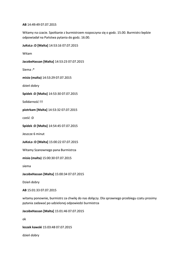 AB 14:49:49 07.07.2015 Witamy na czacie. Spotkanie z burmistrzem