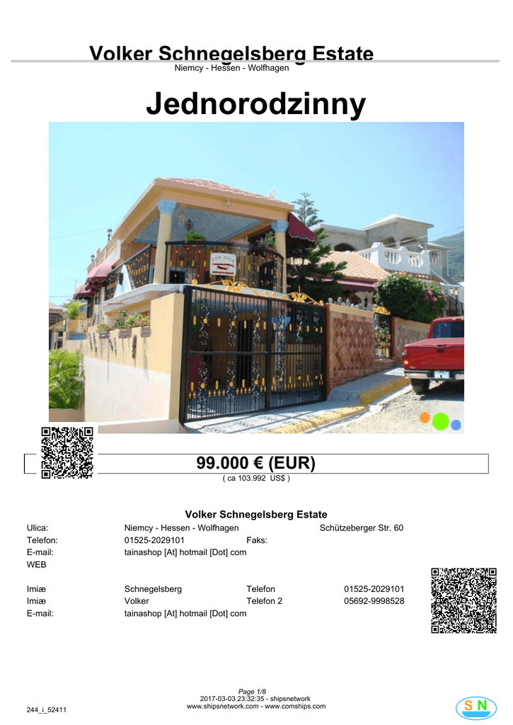 Volker Schnegelsberg Estate Niemcy - Hessen - Wolfhagen Jednorodzinny Poùoýenie obiektu : Dominikana - Puerto Plata - S.F.d. Puerto Plata 99.000 € (EUR) ( ca 103.992 US$ ) Volker Schnegelsberg Estate Ulica: Telefon: E-mail: WEB Niemcy - Hessen - Wolfhagen 01525-2029101 Faks: tainashop [At] hotmail [Dot] com Imiæ Imiæ E-mail: Schnegelsberg Telefon Volker Telefon 2 tainashop [At] hotmail [Dot] com 244_i_52411 Schützeberger Str. 60 Page 1/8 2017-03-03 23:32:35 - shipsnetwork www.shipsnetwork.com - www.comships.com 01525-2029101 05692-9998528 Volker Schnegelsberg Estate Niemcy - Hessen - Wolfhagen Numer kodu Typ budynku Poùoýenie Materiaùy Property Address 244_i_52411 Jednorodzinny Úródmieúcie Beton Los Maestros, Puerto Plata Numer kodu Nr referencyjny Status objektet Rok Powierzchnia dziaùki Firma Ýycie Kuchnia Sypialnie Zùy Opinie Toaleta 145 m2 Powierzchnia 1 1 3 2 1 Biznes Inne Usùugi Garaý Carport zadaszony taras Dojazd: 3 km 15 km 3 km 2 km 4 km 2 km 1 Protokoùy 2 km 2 km Samochód Samochód Samochód Samochód Samochód Samochód Pieszo Pieszo Samochód Centrum Lotnisko Plaýa Szpital Port Szkoùa Supermarket Uniwersytet Przedszkole Akcesoria Dzierýawa Taras Balkon Jetty Pokój Party Klimatyzacja Resort Ogród Pralnia Goràcy zadaszony taras ogrodzony / murem 244_i_52411 Page 2/8 2017-03-03 23:32:35 - shipsnetwork www.shipsnetwork.com - www.comships.com natychmiast 2006 110 m2 1 Volker Schnegelsberg Estate Niemcy - Hessen - Wolfhagen 244_i_52411 Page 3/8 2017-03-03 23:32:35 - shipsnetwork www.shipsnetwork.com - www.comships.com Volker Schnegelsberg Estate Niemcy - Hessen - Wolfhagen Front Roof Terrace with sea view 244_i_52411 Page 4/8 2017-03-03 23:32:35 - shipsnetwork www.shipsnetwork.com - www.comships.com Volker Schnegelsberg Estate Niemcy - Hessen - Wolfhagen Livingroom Bathroom 244_i_52411 Page 5/8 2017-03-03 23:32:35 - shipsnetwork www.shipsnetwork.com - www.comships.com Volker Schnegelsberg Estate Niemcy - Hessen - Wolfhagen Dining area Front 244_i_52411 Page 6/8 2017-03-03 23:32:35 - shipsnetwork www.shipsnetwork.com - www.comships.com Volker Schnegelsberg Estate Niemcy - Hessen - Wolfhagen Entrance of the house Sidefront 244_i_52411 Page 7/8 2017-03-03 23:32:35 - shipsnetwork www.shipsnetwork.com - www.comships.com Volker Schnegelsberg Estate Niemcy - Hessen - Wolfhagen Roof with ancient figures 244_i_52411 Page 8/8 2017-03-03 23:32:35 - shipsnetwork www.shipsnetwork.com - www.comships.com