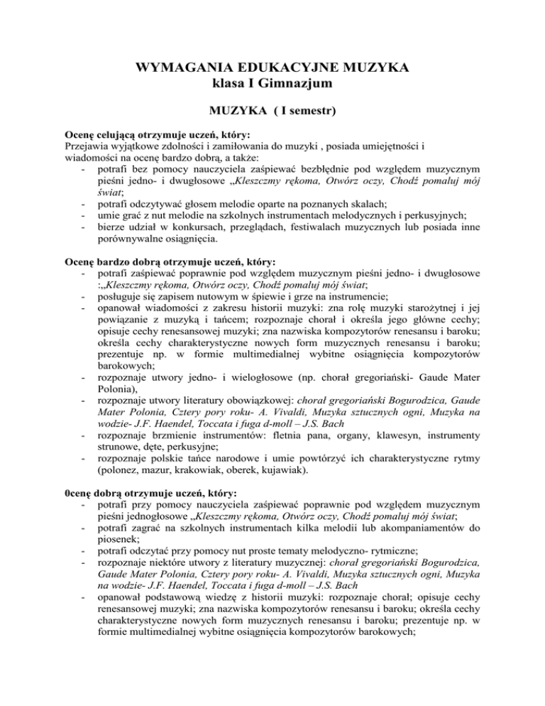 WYMAGANIA EDUKACYJNE MUZYKA klasa I Gimnazjum MUZYKA ( I semestr) Ocenę celującą otrzymuje uczeń, który: Przejawia wyjątkowe zdolności i zamiłowania do muzyki , posiada umiejętności i wiadomości na ocenę bardzo dobrą, a także: - potrafi bez pomocy nauczyciela zaśpiewać bezbłędnie pod względem muzycznym pieśni jedno- i dwugłosowe „Kleszczmy rękoma, Otwórz oczy, Chodź pomaluj mój świat; - potrafi odczytywać głosem melodie oparte na poznanych skalach; - umie grać z nut melodie na szkolnych instrumentach melodycznych i perkusyjnych; - bierze udział w konkursach, przeglądach, festiwalach muzycznych lub posiada inne porównywalne osiągnięcia. Ocenę bardzo dobrą otrzymuje uczeń, który: - potrafi zaśpiewać poprawnie pod względem muzycznym pieśni jedno- i dwugłosowe :„Kleszczmy rękoma, Otwórz oczy, Chodź pomaluj mój świat; - posługuje się zapisem nutowym w śpiewie i grze na instrumencie; - opanował wiadomości z zakresu historii muzyki: zna rolę muzyki starożytnej i jej powiązanie z muzyką i tańcem; rozpoznaje chorał i określa jego główne cechy; opisuje cechy renesansowej muzyki; zna nazwiska kompozytorów renesansu i baroku; określa cechy charakterystyczne nowych form muzycznych renesansu i baroku; prezentuje np. w formie multimedialnej wybitne osiągnięcia kompozytorów barokowych; - rozpoznaje utwory jedno- i wielogłosowe (np. chorał gregoriański- Gaude Mater Polonia), - rozpoznaje utwory literatury obowiązkowej: chorał gregoriański Bogurodzica, Gaude Mater Polonia, Cztery pory roku- A. Vivaldi, Muzyka sztucznych ogni, Muzyka na wodzie- J.F. Haendel, Toccata i fuga d-moll – J.S. Bach - rozpoznaje brzmienie instrumentów: fletnia pana, organy, klawesyn, instrumenty strunowe, dęte, perkusyjne; - rozpoznaje polskie tańce narodowe i umie powtórzyć ich charakterystyczne rytmy (polonez, mazur, krakowiak, oberek, kujawiak). 0cenę dobrą otrzymuje uczeń, który: - potrafi przy pomocy nauczyciela zaśpiewać poprawnie pod względem muzycznym pieśni jednogłosowe „Kleszczmy rękoma, Otwórz oczy, Chodź pomaluj mój świat; - potrafi zagrać na szkolnych instrumentach kilka melodii lub akompaniamentów do piosenek; - potrafi odczytać przy pomocy nut proste tematy melodyczno- rytmiczne; - rozpoznaje niektóre utwory z literatury muzycznej: chorał gregoriański Bogurodzica, Gaude Mater Polonia, Cztery pory roku- A. Vivaldi, Muzyka sztucznych ogni, Muzyka na wodzie- J.F. Haendel, Toccata i fuga d-moll – J.S. Bach - opanował podstawową wiedzę z historii muzyki: rozpoznaje chorał; opisuje cechy renesansowej muzyki; zna nazwiska kompozytorów renesansu i baroku; określa cechy charakterystyczne nowych form muzycznych renesansu i baroku; prezentuje np. w formie multimedialnej wybitne osiągnięcia kompozytorów barokowych; - rozpoznaje brzmienie niektórych instrumentów; rozpoznaje polskie tańce narodowe. Ocenę dostateczną otrzymuje uczeń, który: - potrafi przy pomocy nauczyciela zaśpiewać kilka pieśni„Kleszczmy rękoma, Otwórz oczy, Chodź pomaluj mój świat; - potrafi zagrać z grupą uczniów kilka prostych akompaniamentów do piosenek (ostinato rytmiczne); - opanował podstawowe wiadomości z historii muzyki: wymienia cechy chorału gregoriańskiego; wymienia cechy renesansowej muzyki; zna nazwiska kompozytorów renesansu i baroku; wymienia nowe formy muzyczne renesansu i baroku; - rozpoznaje niektóre motywy muzyczne z twórczości słynnych kompozytorów chorał gregoriański Bogurodzica, Gaude Mater Polonia, Cztery pory roku- A. Vivaldi, Muzyka sztucznych ogni, Muzyka na wodzie- J.F. Haendel, Toccata i fuga d-moll – J.S. Bach - rozpoznaje brzmienia niektórych instrumentów; - rozpoznaje niektóre tańce narodowe. Ocenę dopuszczającą otrzymuje uczeń, który: - potrafi, z pomocą nauczyciela, zaśpiewać fragmenty piosenek: Kleszczmy rękoma, Otwórz oczy, Chodź pomaluj mój świat; - potrafi głosem powtórzyć kilka prostych wzorów melodycznych; - potrafi powtórzyć proste ostinato rytmiczne; - opanował w ograniczonym zakresie wiedzę z historii muzyki: wymienia epoki; potrafi wymienić kilka nowych form muzycznych; zna nazwiska kilku kompozytorów; - potrafi wymienić nazwy niektórych instrumentów; - potrafi wskazać polskie tańce narodowe; Ocenę niedostateczną otrzymuje uczeń, który: - pomimo starań nauczyciela nie przejawiał zainteresowania przedmiotem oraz żadnej aktywności na lekcjach muzyki; - nie opanował żadnych umiejętności muzycznych; - nie potrafi i nie chce, nawet przy pomocy nauczyciela, zaśpiewać żadnej piosenki; - nie opanował minimum wiadomości określonych programem nauczania (nie zna epok, nie potrafi wymienić nazwisk kompozytorów renesansu i baroku, nie zna form muzycznych charakterystycznych dla epok od średniowiecza do baroku, nie zna instrumentów muzycznych i tańców); - nie prowadzi zeszytu przedmiotowego; - nie bierze udziału w lekcjach; - opuszcza zajęcia. MUZYKA ( II semestr) Ocenę celującą otrzymuje uczeń, który: Przejawia wyjątkowe zdolności i zamiłowania do muzyki , posiada umiejętności i wiadomości na ocenę bardzo dobrą, a także: - potrafi bez pomocy nauczyciela zaśpiewać bezbłędnie pod względem muzycznym pieśni jedno- i dwugłosowe - potrafi odczytywać głosem melodie oparte na poznanych skalach; - umie grać z nut melodie na szkolnych instrumentach melodycznych i perkusyjnych; - bierze udział w konkursach, przeglądach, festiwalach muzycznych lub posiada inne porównywalne osiągnięcia. Ocenę bardzo dobrą otrzymuje uczeń, który: - potrafi zaśpiewać poprawnie pod względem muzycznym pieśni jedno- i dwugłosowe: Kurdesz, Mazurek Trzeciego Maja, Francis Villon, Nie zadzieraj nosa; - posługuje się zapisem nutowym; - opanował wiadomości z zakresu historii muzyki: charakteryzuje rozwój muzyki klasycznej, przedstawia ważne fakty biograficzne określa główne nurty muzyczne epoki romantyzmu; omawia rozw