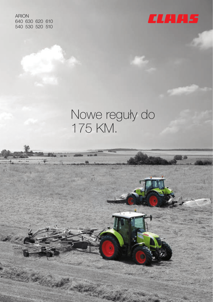 ARION 640 630 620 610 540 530 520 510 Nowe reguły do 175 KM. ARION. Nowe zasady w ciągnikach do 175 KM. Proponując trzy nowe typoszeregi ciągników ARION od 100 do 170 KM firma CLAAS otwiera interesujące perspektywy; już od 105 KM ciągnik jest wyposażony we wszystkie opcje, które dotąd były zarezerwowane dla mocy rzędu 200 KM. Gospodarstwa, które wymagają silniejszych ciągników będą także optymalnie obsłużone: Nowym typoszeregiem ARION 600 C. Komfort jedyny w swoim rodzaju. Komfort ciągników CLAAS sprawia, że codzienna praca mocnym ciągnikiem ARION staje się prawdziwą przyjemnością. Niezwykła uniwersalność. Najlepszy przykład: topowy model ARION 640, z systemem CPM Powerboost dostarcza w razie potrzeby do 175 KM, Są to rezerwy mocy otwierające zupełnie nowe możliwości zastosowania. Wysoka efektywność. Nowoczesne silniki typoszeregu ARION, doskonała technologia przekładni i koncepcja siły uciągu to najlepsza baza dla wyjątkowo efektywnej i ekonomicznej pracy. Także niezależne testy przemawiają za ARION. Wśród 7 ciągników ARION uznany został za najlepszy w przeciąganiu przyczep: ARION 530, najlepszy w testach ciągnik do holowania przyczep (top agrar 12/08).* „Serce rynku ciągników“ – tak często określa się ciągniki o średniej klasie mocy. Tutaj rolnicy, gospodarstwa rolne i przedsiębiorcy świadczący usługi znajdują największy wybór modeli oraz opcji wyposażenia. Każdy z praktyków może tu także zestawić sobie ciągnik ARION idealnie dopasowany do swoich życzeń. Spis treści Kompletna seria ARION 6-cylindrowy ARION 4-cylindrowy 6 8 10 Wyjątkowy komfort Koncepcja komfortu CLAAS DRIVESTICK i wielofunkcyjny podłokietnik CLAAS INFORMATION SYSTEM – CIS CEBIS 12 14 Niezwykła uniwersalność Osiągi i wymiary Silniki Przekładnie Hydraulika i napęd W.O.M. Ładowacz czołowy 22 24 26 28 32 34 Wysoka wydajność Oszczędność paliwa Konserwacja CSM, ISOBUS GPS PILOT, CAM PILOT Wzrost produktywności Wysoka jakość obsługi 36 38 40 42 44 46 48 Dane techniczne 50 16 18 20 ARION – klasa mocy od 112 do 175 KM*. XERION AXION ARION 600 ARION 600 C ARION 500 ARION 400 AXOS NECTIS 50 100 150 *Moc maksymalną wszędzie podano wg normy ECE R 24. 6 200 250 300 350 KM W zakresie mocy od 112 do 175 KM można wymagać bardzo wiele. Trzy typoszeregi między 112 a 175 KM. Nowa seria ciągników CLAAS ARION jest przeznaczona na rynek ciągników o średniej klasie mocy. Nowe modele pokrywają szeroki zakres mocy i spełnią oczekiwania wielu użytkowników. Szukają Państwo kompaktowego, zwrotnego i silnego ciągnika? ARION serii 500 będzie świetnym wyborem. A może ciągnika 6 cylindrowy? Jeśli tak, to warto wybrać ARION serii 600. Jeśli ktoś nie szuka ciągnika o najwyższym możliwym komforcie, to jest dla niego ekonomiczna alternatywa: nazywa się ARION 600C. Dla tego ciągnika mamy oddzielny prospekt ze wszystkimi informacjami oraz interesującymi szczegółami! Ciągniki 6 cylindrowe z rodziny ARION i typoszeregu 600. Zwykły ciągnik z 38’’ kołami tylnymi i masą od 5 do 6 t zwykle osiąga granicę mocy przy 150 KM. W topowym modelu ARION 640, CLAAS podniósł tę granicę o 25 KM i tym samym ustanowił nowy wymiar. Ciągnik z CLAAS POWER MANAGEMENT (CPM) osiąga maksymalnie 175 KM mocy silnika. Ciągniki 4 cylindrowe z rodziny ARION: typoszereg 500. Trzy modele ciągników ARION: 510, 520 i 530 rozwijają maksymalną moc w zakresie od 112 do 128 KM wg normy ECE R24. Model ARION 540 dzięki systemowi CLAAS POWER MANAGEMENT osiąga aż 155 KM, z którą może być wykorzystany praktycznie w każdej pracy. Wszechstronność silników 7 ARION serii 500. 6 cylindrów o mocy od 125 do 175 KM. 8 Ciągniki 150 KM poszerzone o model ARION 640 z CPM Powerboost z mocą do 175 KM. Jeśli ktoś interesuje się ciągnikiem musi się także zainteresować informacjami dotyczącymi mocy. Sprawa nie zawsze jest całkiem prosta. Często trzeba się tu przedzierać przez górę liczb i skomplikowanych pojęć: różne normy, podniesienia mocy, moc znamionowa, maksymalna, moc na WOM itd. Może się też okazać, że kupiona i zapłacona moc nie jest przydatna w polu. Zatem należy dokładnie przyjrzeć się ciągnikowi przed jego zakupem. To naprawdę się opłaca. Model ARION 640 wyposażono w CPM Powerboost. Daje to do dyspozycji kierowcy dokładnie 20 KM dodatkowej mocy wtedy, gdy jest ona potrzebna. Jest tak już od prędkości 6 km/h w orce. W ten sposób można optymalnie wykorzystać możliwości swojego ciągnika. Bez ekstra tuningu, przy którym ryzykuje się utratę gwarancji i homologacji. Osiągi silników typoszeregu ARION 600 ARION Moc kW/KM przy 2.200 Max. kW/KM Boost kW/ przy 2.000 KM przy obr/min obr/min 2.000 obr/ 85/115 92/125 – min 610 620 96/130 99/135 – 630 103/140 110/150 – 640 110/150 114/155 129/175 Wartośći wg ECE R 24 6 cylindrów 9 Model typoszeregu 4 cylindrowych: ARION 540 o mocy silnika 155 KM. W wielu gospodarstwach zawsze myśli się o ciągniku z silnikiem 4 cylindrowym. Jego zalety są oczywiste: jest kompaktowy i zwrotny, doskonale współpracuje z ładowaczem czołowym a przy tym wszystkim ma niewielką masę całkowitą. Często chodzi także o to, że można nim wykonywać prace przeznaczone zwykle dla ciągników 6 cylindrowych. Pojawia się też pytanie o więcej mocy. CLAAS ma na to prostą odpowiedź: Ta odpowiedź, to ARION 540. Dzięki CPM Powerboost na polu i na drodze do dyspozycji jest w tym modelu 155 KM. Wykracza to poza zwykły, czterocylindrowy silnik i otwiera wiele nowych możliwości zastosowania. Osiągi silników typoszeregu ARION 500. ARION Moc kW/KM przy 2.200 Max. kW/KM Boost kW/ przy 2.000 KM przy obr/min obr/min 2.000 obr/ 77/105 82/112 – min 510 520 85/115 90/122 – 530 92/125 94/128 – 540 96/130 99/135 114/155 Wartośći wg ECE R 24 CPM: używany podczas prac z WOM 10 CPM Boost: używany przy pracach pociągowych powyżej 6 km/h ARION serii 500. 4-c