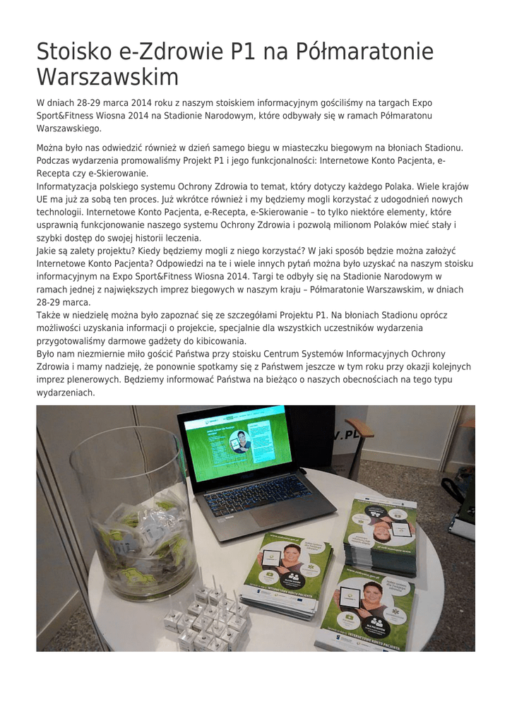 Stoisko e-Zdrowie P1 na Półmaratonie Warszawskim W dniach 28-29 marca 2014 roku z naszym stoiskiem informacyjnym gościliśmy na targach Expo Sport&Fitness Wiosna 2014 na Stadionie Narodowym, które odbywały się w ramach Półmaratonu Warszawskiego. Można było nas odwiedzić również w dzień samego biegu w miasteczku biegowym na błoniach Stadionu. Podczas wydarzenia promowaliśmy Projekt P1 i jego funkcjonalności: Internetowe Konto Pacjenta, eRecepta czy e-Skierowanie. Informatyzacja polskiego systemu Ochrony Zdrowia to temat, który dotyczy każdego Polaka. Wiele krajów UE ma już za sobą ten proces. Już wkrótce również i my będziemy mogli korzystać z udogodnień nowych technologii. Internetowe Konto Pacjenta, e-Recepta, e-Skierowanie – to tylko niektóre elementy, które usprawnią funkcjonowanie naszego systemu Ochrony Zdrowia i pozwolą milionom Polaków mieć stały i szybki dostęp do swojej historii leczenia. Jakie są zalety projektu? Kiedy będziemy mogli z niego korzystać? W jaki sposób będzie można założyć Internetowe Konto Pacjenta? Odpowiedzi na te i wiele innych pytań można było uzyskać na naszym stoisku informacyjnym na Expo Sport&Fitness Wiosna 2014. Targi te odbyły się na Stadionie Narodowym w ramach jednej z największych imprez biegowych w naszym kraju – Półmaratonie Warszawskim, w dniach 28-29 marca. Także w niedzielę można było zapoznać się ze szczegółami Projektu P1. Na błoniach Stadionu oprócz możliwości uzyskania informacji o projekcie, specjalnie dla wszystkich uczestników wydarzenia przygotowaliśmy darmowe gadżety do kibicowania. Było nam niezmiernie miło gościć Państwa przy stoisku Centrum Systemów Informacyjnych Ochrony Zdrowia i mamy nadzieję, że ponownie spotkamy się z Państwem jeszcze w tym roku przy okazji kolejnych imprez plenerowych. Będziemy informować Państwa na bieżąco o naszych obecnościach na tego typu wydarzeniach.