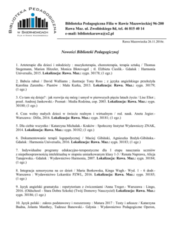Biblioteka Pedagogiczna Filia w Rawie Mazowieckiej 96-200 Rawa Maz. ul. Zwolińskiego 8d, tel. 46 815 40 14 e-mail: [email protected] Rawa Mazowiecka 26.11.2016r. Nowości Biblioteki Pedagogicznej 1. Arteterapie dla dzieci i młodzieży : muzykoterapia, choreoterapia, terapia sztuką / Thomas Stegemann, Marion Hitzeler, Monica Blotevogel ; tł. Elżbieta Cieslik.- Gdańsk : Harmonia Universalis, 2015. Lokalizacja: Rawa. Maz.: sygn. 30178; (1 egz.) 2. Babcia rabuś / David Walliams ; ilustracje Tony Ross ; z języka angielskiego przełożyła Karolina Zaremba.- Piastów : Mała Kurka, 2013. Lokalizacja: Rawa. Maz.: sygn. 30179; (1 egz.) 3. Co tam się dzieje? : jak rozwija się mózg i umysł w pierwszych pięciu latach życia / Lise Eliot ; przeł. Andrzej Jankowski.- Poznań : Media Rodzina, cop. 2003. Lokalizacja: Rawa. Maz.: sygn. 30180; (1 egz.) 4. Czas wolny małych dzieci w świecie realnym i wirtualnym / red. nauk. Aneta Jegier.Warszawa : Difin, 2016. Lokalizacja: Rawa. Maz.: sygn. 30181; (1 egz.) 5. Dla ciebie wszystko / Katarzyna Michalak.- Kraków : Społeczny Instytut Wydawniczy ZNAK, 2014. Lokalizacja: Rawa. Maz.: sygn. 30182; (1 egz.) 6. Dokumentowanie terapii logopedycznej / Maciej Gibiński, Agnieszka Bzdyk-Gibińska.Gdańsk : Harmonia Universalis, 2016. Lokalizacja: Rawa. Maz.: sygn. 30183; (1 egz.) 7. Indywidualne programy edukacyjno-terapeutyczne dla I etapu nauczania uczniów z niepełnosprawnością intelektualną w stopniu umiarkowanym klasy 1-3 / Renata Naprawa, Alicja Tanajewska.- Gdańsk : Wydawnictwo Harmonia, 2007. Lokalizacja: Rawa. Maz.: sygn. 30184; (1 egz.) 8. Integracja sensoryczna na co dzień / Maria Borkowska, Kinga Wagh.- Wyd. 1 - 6 dodr.Warszawa : Wydawnictwo Lekarskie PZWL, 2016. Lokalizacja: Rawa. Maz.: sygn. 30185; (1 egz.) 9. Język angielski gramatyka : repetytorium z ćwiczeniami /Anna Treger.- Warszawa : Lingo, 2016. (Oldschool - Stara Dobra Szkoła) (Twój Domowy Nauczyciel) Lokalizacja: Rawa. Maz.: sygn. 30186; (1 egz.) 10. Język polski : zakres podstawowy i rozszerzony : Matura 2017 : Testy i arkusze / Katarzyna Budna, Jolanta Manthey, Tadeusz Banowski.- Gdynia : Wydawnictwo Pedagogiczne Operon, 2016. (Matura z Operonem) Lokalizacja: Rawa. Maz.: sygn. 30195; 30167; (2 egz.) 11. Kramik : ćwiczenia korekcyjno-kompensacyjne / Małgorzata Barańska.- Wyd. 2.- Gdańsk : Wydawnictwo Harmonia, 2014. Lokalizacja: Rawa. Maz.: sygn. 30187; (1 egz.) 12. Książka wszystkich rzeczy / Guus Kuijer ; z niderlandzkiego przełożyła Jadwiga Jędryas.Wyd. 2.- Warszawa : Dwie Siostry, 2016. Lokalizacja: Rawa. Maz.: sygn. 30188; (1 egz.) 13. Która to Malala ? / Renata Piątkowska ; il. Maciej Szymanowicz.- Łódź : Wydawnictwo Literatura, 2015. (Wojny Dorosłych - Historie Dzieci) Lokalizacja: Rawa. Maz.: sygn. 30189 14. Małymi kroczkami : ćwiczenia do zajęć wyrównawczych dla klas 1-2 / Monika Kraszewska.Kraków : Wydawnictwo WiR, 2007. Lokalizacja: Rawa. Maz.: sygn. 30190; (1 egz.) 15. Matematyka : zakres rozszerzony : vademecum matura 2017 / Kinga Gałązka.- Gdynia : Wydawnictwo Pedagogiczne Operon, 2016. (Matura z Operonem.) Lokalizacja: Rawa. Maz.: sygn. 30196; (1 egz.) 16. Mój Czarny Pies Depresja / Matthew Johnstone ; tł. Joanna Nowakowska.- Poznań : Media Rodzina, cop. 2010. Lokalizacja: Rawa. Maz.: sygn. 30191; (1 egz.) 17. Mutyzm wybiórczy : trzy spojrzenia / Monika Cabała, Agnieszka Leśniak-Stępień, Renata Szot, Katarzyna Szyszka.- Kraków : Oficyna Wydawnicza IMPULS, 2016. Lokalizacja: Rawa. Maz.: sygn. 30192; (1 egz.) 18. Myślę, rozwiązuję i... wiem! : ćwiczenia korekcyjno-kompensacyjne dla uczniów klas IV-VI / oprac. Magdalena Hinz ; il. Krzysztof Spychał.- Gdańsk : Wydawnictwo HARMONIA, 2014. Lokalizacja: Rawa. Maz.: sygn. 30193; (1 egz.) 19. Niepełnosprawność intelektualna : mowa, język, komunikacja : czy iloraz inteligencji wyjaśnia wszystko? / Jacek J. Błeszyński.- Gdańsk : Harmonia Uniwersalis, 2013. Lokalizacja: Rawa. Maz.: sygn. 30194; (1 egz.) 20. Paluszkowa tabliczka mnożenia / Rościsław Andrzejczak.- Gdańsk : Harmonia, 2015. Lokalizacja: Rawa. Maz.: sygn. 30197; (1 egz.) 21. Poznaję matematykę krok po kroku : ćwiczenia terapeutyczne dla uczniów klas młodszych szkoły podstawowej mających specyficzne trudności w uczeniu się matematyki : materiały / Alicja Małasiewicz.- Gdańsk : Harmonia, 2015.Lokalizacja: Rawa. Maz.: sygn. T-24; (1 egz.) 22. Poznaję matematykę krok po kroku : ćwiczenia terapeutyczne dla uczniów klas młodszych szkoły podstawowej mających specyficzne trudności w uczeniu się matematyki : podręcznik / Alicja Małasiewicz.- Gdańsk : Harmonia, 2015. Lokalizacja: Rawa. Maz. : sygn. 30198; (1 egz.) 23. Rozwój dziecka od 0 do 3 lat / T. Berry Brazelton, Joshua D. Sparrow ; tł. Agata Błaż.- Sopot : Gdańskie Wydawnictwo Psychologiczne, 2013. Lokalizacja: Rawa. Maz.: sygn. 30199 (1 egz.) 24. Spełnienia marzeń! / Katarzyna Michalak.- Kraków : Wydaw. Literackie, 2016. Lokalizacja: Rawa. Maz.: sygn. 30200; (1 egz.) 25. Uwaga! Koncentruję się! : ćwiczenia na koncentrację i spostrzegawczość dla najmłodszych / [oprac. Magdalena Hinz].- Wyd. 2.- Gdańsk : Wydawnictwo Harmonia, 2014. Lokalizacja: Rawa. Maz.: sygn. 30204; (1 egz.) 26. Uwaga! Koncentruję się! : ćwiczenia na koncentrację i spostrzegawczość dla uczniów gimnazjum. 3 / [oprac. Magdalena Hinz].- Gdańsk : Wydawnictwo Harmonia, 2013. Lokalizacja: Rawa. Maz.: sygn. 30202; (1 egz.) 27. Uwaga! Koncentruję się! : ćwiczenia na koncentrację i spostrzegawczość dla uczniów klas IVVI. 2 / [oprac. Magdalena Hinz].- Wyd. 2.- Gdańsk : Wydawnictwo Harmonia, 2015.Lokalizacja: Rawa. Maz.: sygn. 30201; (1 egz.) 28. Uwaga! Koncentruję się! : ćwiczenia na koncentrację i spostrzegawczość dla uczniów liceum i technikum. 4 / [oprac. Magdalena Hinz].- Gdańsk : Wydawnictwo Harmonia, 2013.Lokalizacja: Rawa. Maz.: sygn. 30203; (1 egz.) 29. Wczesna interwencja logopedyczna / redakcja naukowa: Katarzyna Kaczorowsk