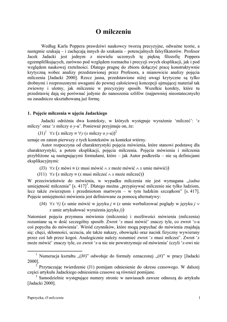 O milczeniu Według Karla Poppera prawdziwi naukowcy tworzą precyzyjne, odważne teorie, a następnie szukają – i zachęcają innych do szukania – potencjalnych falsyfikatorów. Profesor Jacek Jadacki jest jednym z niewielu uczonych tę piękną filozofię Poppera egzemplifikujących, zarówno pod względem rozmachu i precyzji swych eksplikacji, jak i pod względem naukowej rzetelności. Dlatego pragnę do zbioru dołączyć pracę konstruktywnie krytyczną wobec analizy przedstawionej przez Profesora, a mianowicie analizy pojęcia milczenia [Jadacki 2000]. Rzecz jasna, przedstawione niżej uwagi krytyczne są tylko drobnymi i rozproszonymi uwagami do pewnej całościowej koncepcji ujmującej materiał tak zwiewny i ulotny, jak milczenie w precyzyjny sposób. Wszelkie korekty, które tu przedstawię dają się porównać jedynie do nanoszenia szlifów (najpewniej nieostatecznych) na zasadniczo ukształtowaną już formę. 1. Pojęcie milczenia w ujęciu Jadackiego Jadacki odróżnia dwa konteksty, w których występuje wyrażenie ‘milczeć’: ‘x milczy’ oraz ‘x milczy o y-u’. Ponieważ przyjmuje on, że: (J1)1 ∀x (x milczy ≡ ∀y (x milczy o y-u))2 uznaje on zatem pierwszy z tych kontekstów za kontekst wtórny. Autor rozpoczyna od charakterystyki pojęcia mówienia, które stanowi podstawę dla charakterystyki, a potem eksplikacji, pojęcia milczenia. Pojęcia mówienia i milczenia przybliżone są następującymi formułami, które – jak Autor podkreśla – nie są definicjami eksplikacyjnymi: (J3) ∀x (x mówi ≡ (x musi mówić ∧ x może mówić ∧ x umie mówić)) (J11) ∀x (x milczy ≡ (x musi milczeć ∧ x może milczeć)) W przeciwieństwie do mówienia, w wypadku milczenia nie jest wymagana „żadna umiejętność milczenia” [s. 417]3. Dlatego można „przypisywać milczenie nie tylko ludziom, lecz także zwierzętom i przedmiotom martwym – w tym ludzkim szczątkom” [s. 417]. Pojęcie umiejętności mówienia jest definiowane za pomocą alternatywy: (J4) ∀x ∀j (x umie mówić w języku j ≡ (x umie werbalizować poglądy w języku j ∨ x umie artykułować wyrażenia języka j)) Natomiast pojęcia przymusu mówienia (milczenia) i możliwości mówienia (milczenia) rozumiane są w dość szczególny sposób. Zwrot ‘x musi mówić’ znaczy tyle, co zwrot ‘x-a coś popycha do mówienia’. Wśród czynników, które mogą popychać do mówienia znajdują się: chęci, skłonności, uczucia, ale także nakazy, obowiązki oraz nacisk fizyczny wywierany przez coś lub przez kogoś. Analogicznie należy rozumieć zwrot ‘x musi milczeć’. Zwrot ‘x może mówić’ znaczy tyle, co zwrot ‘x-a nic nie powstrzymuje od mówienia’ (czyli ‘x-owi nic 1 Numeracja kształtu „(J#)” odwołuje do formuły oznaczonej „(#)” w pracy [Jadacki 2000]. 2 Przytaczając twierdzenie (J1) pomijam odniesienie do okresu czasowego. W dalszej części artykułu Jadackiego odniesienia czasowe są również pomijane. 3 Samodzielnie występujące numery stronic w nawiasach zawsze odnoszą do artykułu [Jadacki 2000]. Paprzycka, O milczeniu 1 nie uniemożliwia mówienia’). Te same czynniki, które mogą popychać do mówienia mogą również od mówienia powstrzymywać. Ostateczna analityczna definicja milczenia jest zaproponowana tak, aby spełniała dwa wymagania. Po pierwsze, definicja ta musi zadośćuczynić intuicji, że z faktu, iż ktoś nie mówi nie wynika jeszcze, że milczy. Nie można powiedzieć, iż milczymy w czasie snu, mimo że wówczas nie mówimy: „milczymy dopiero wtedy, kiedy nie mówimy mimo przymusu mówienia” [s. 418]. Po drugie, Jadacki przestrzega przed ujęciem tej intuicji w następującą formę: (J15*)4 ∀x (x milczy ≡ (x musi mówić ∧ ~ x mówi)) dlatego, że nie należy według niego przyjąć konsekwencji twierdzenia (J15), a mianowicie: (J18*) ∀x (x milczy → x musi mówić) Autor nie przyjmuje zdania (J18) ze względu na to, że uznaje za prawdziwe twierdzenie (J11) – warunkiem niezbędnym milczenia jest przymus milczenia, a nie przymus mówienia. Ostateczna analityczna definicja milczenia przybiera postać definicji warunkowej: (J19) ∀x (x musi mówić → (x milczy ≡ ~ x mówi)) Warto podkreślić, że w całości swej analizy milczenia Jadacki przeciwstawia się – w moim przekonaniu, słusznie – analizie przedstawionej przez Dąmbską [1975], która proponuje zanadto intencjonalistyczną analizę milczenia, dopatrując się w nim zawsze powstrzymywania się od mówienia. 2. Milczenie† a milczenie Wzbudza jednak niejaką wątpliwość konsekwencja mająca płynąć już z przyjęcia twierdzenia (J11) (przy słabej interpretacji zarówno warunków przymusu, jak i warunku możliwości), a mianowicie, że możemy przypisywać milczenie „zwierzętom i przedmiotom martwym” [s. 417]. Ta intuicyjna niezgoda wiąże się – jak sądzę – z tym, że Jadacki analizuje pojęcie milczenia w kontekście ‘x milczy’, a nie w kontekście ‘x milczy o y-u’. Być może warto rozpocząć od przytoczenia przykładów y’ów. Można milczeć: o tym, czy ostatnie twierdzenie Fermata zostało udowodnione; o tym, kto jest odpowiedzialny za odwołanie Modrzejewskiego; o tym, gdzie znaleziono rottweilera; o tym, o której godzinie przyniosą pocztę; o tym, w jaki sposób zarobić fortunę; o tym, czy gdyby zastąpić sacharozę fruktozą, to ciasto biszkoptowe by wyrosło etc. Wysoce wątpliwa wydaje się sugestia, że zwierzętom, roślinom, czy przedmiotom martwym można przypisać milczenie w tym sensie, w jakim słowo ‘milczeć’ występuje w powyższych kontekstach. Co znaczyłoby powiedzieć, że kamień milczy o tym, czy udowodniono jakieś twierdzenie, czy też, że milczy w sprawie afery Orlenu? Oczywiście kamień nic nie mówi i w tym bardzo słabym sensie «milczy», ale trudno przypuszczać, że chcielibyśmy przypisywać milczenie (w mocniejszym sensie) kamieniom, drzewom, czy 