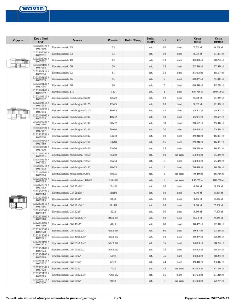 Zdjęcie Kod / Kod SAP Nazwa Wymiar Kolor/Uwagi Jedn. miary SP ABC Cena netto Cena brutto 3252503070 / 4027660 Złączka zacisk. 25 25 szt. 10 dost 7.52 zł 9.25 zł 3252503080 / 4027661 Złączka zacisk. 32 32 szt. 10 dost 8.95 zł 11.01 zł 3252503090 / 4027662 Złączka zacisk. 40 40 szt. 40 dost 15.23 zł 18.73 zł 3252503100 / 4027663 Złączka zacisk. 50 50 szt. 25 dost 22.36 zł 27.50 zł 3252503110 / 4027664 Złączka zacisk. 63 63 szt. 15 dost 31.03 zł 38.17 zł 3252503120 / 4027665 Złączka zacisk. 75 75 szt. 8 dost 58.37 zł 71.80 zł 3252503130 / 4027666 Złączka zacisk. 90 90 szt. 5 dost 66.90 zł 82.29 zł 3252503140 / 4027667 Złączka zacisk. 110 110 szt. 3 dost 154.60 zł 190.16 zł 3252103415 / 4027682 Złączka zacisk. redukcyjna 32x20 32x20 szt. 10 dost 9.02 zł 11.09 zł 3252103411 / 4027683 Złączka zacisk. redukcyjna 32x25 32x25 szt. 10 dost 9.02 zł 11.09 zł 3252103470 / 4027684 Złączka zacisk. redukcyjna 40x25 40x25 szt. 45 dost 15.91 zł 19.57 zł 3252103465 / 4027685 Złączka zacisk. redukcyjna 40x32 40x32 szt. 40 dost 15.91 zł 19.57 zł 3252103530 / 4027686 Złączka zacisk. redukcyjna 50x32 50x32 szt. 30 dost 20.62 zł 25.36 zł 3252103520 / 4027687 Złączka zacisk. redukcyjna 50x40 50x40 szt. 30 dost 19.09 zł 23.48 zł 3252633550 / 4027688 Złączka zacisk. redukcyjna 63x32 63x32 szt. 10 dost 29.28 zł 36.01 zł 3252103560 / 4027689 Złączka zacisk. redukcyjna 63x40 63x40 szt. 15 dost 29.28 zł 36.01 zł 3252103580 / 4027690 Złączka zacisk. redukcyjna 63x50 63x50 szt. 15 dost 29.28 zł 36.01 zł 3252103630 / 4027691 Złączka zacisk. redukcyjna 75x50 75x50 szt. 10 na zam 53.24 zł 65.49 zł 3252103635 / 4027692 Złączka zacisk. redukcyjna 75x63 75x63 szt. 8 dost 53.24 zł 65.49 zł 3252103711 / 4027693 Złączka zacisk. redukcyjna 90x63 90x63 szt. 6 dost 70.49 zł 86.70 zł 3252103700 / 4027694 Złączka zacisk. redukcyjna 90x75 90x75 szt. 6 na zam 70.49 zł 86.70 zł 3252103760 / 4027695 Złączka zacisk. redukcyjna 110x90 110x90 szt. 3 na zam 147.77 zł 181.76 zł 3252023371 / 4027613 Złączka zacisk. GW 25x1/2" 25x1/2 szt. 10 dost 4.76 zł 5.85 zł 3252053070 / 4027614 Złączka zacisk. GW 25x3/4" 25x3/4 szt. 10 dost 4.76 zł 5.85 zł 3252023361 / 4027615 Złączka zacisk. GW 25x1" 25x1 szt. 10 dost 4.76 zł 5.85 zł 3252033410 / 4027616 Złączka zacisk. GW 32x3/4" 32x3/4 szt. 10 dost 5.80 zł 7.13 zł 3252033081 / 4027617 Złączka zacisk. GW 32x1" 32x1 szt. 10 dost 5.80 zł 7.13 zł 3252033400 / 4027618 Złączka zacisk. GW 32x1.1/4" 32x1.1/4 szt. 10 dost 8.04 zł 9.89 zł 3252043460 / 4027619 Złączka zacisk. GW 40x1" 40x1 szt. 60 dost 10.47 zł 12.88 zł 3252043091 / 4027620 Złączka zacisk. GW 40x1.1/4" 40x1.1/4 szt. 60 dost 10.47 zł 12.88 zł 3252043095 / 4027621 Złączka zacisk. GW 40x1.1/2" 40x1.1/2 szt. 50 dost 10.47 zł 12.88 zł 3252053105 / 4027623 Złączka zacisk. GW 50x1.1/4" 50x1.1/4 szt. 35 dost 14.83 zł 18.24 zł 3252053100 / 4027624 Złączka zacisk. GW 50x1.1/2" 50x1.1/2 szt. 35 dost 14.83 zł 18.24 zł 3252053107 / 4027625 Złączka zacisk. GW 50x2" 50x2 szt. 35 dost 14.83 zł 18.24 zł 3252063111 / 4027627 Złączka zacisk. GW 63x2" 63x2 szt. 24 dost 19.40 zł 23.86 zł 3252073640 / 4027628 Złączka zacisk. GW 75x2" 75x2 szt. 15 na zam 41.63 zł 51.20 zł 3252073120 / 4027629 Złączka zacisk. GW 75x2.1/2" 75x2.1/2 szt. 15 dost 41.63 zł 51.20 zł 3252093711 / 4027630 Złączka zacisk. GW 90x2" 90x2 szt. 8 na zam 51.03 zł 62.77 zł Cennik nie stanowi oferty w rozumieniu prawa cywilnego 1/5 Wygenerowano: 2017-02-27 Zdjęcie Kod / Kod SAP Nazwa Jedn. miary SP ABC Cena netto Cena brutto 90x2.1/2 szt. 8 dost 51.03 zł 62.77 zł Wymiar Kolor/Uwagi 3252093135 / 4027631 Złączka zacisk. GW 90x2.1/2" 3252093130 / 4027632 Złączka zacisk. GW 90x3" 90x3 szt. 8 dost 51.03 zł 62.77 zł 3252113145 / 4027633 Złączka zacisk. GW 110x3" 110x3 szt. 6 na zam 121.00 zł 148.83 zł 3252113144 / 4027634 Złączka zacisk. GW 110x4" 110x4 szt. 6 na zam 121.00 zł 148.83 zł 3252953371 / 4027582 Złączka zacisk. GZ 25x1/2" 25x1/2 szt. 10 dost 4.13 zł 5.08 zł 3252953073 / 4027583 Złączka zacisk. GZ 25x3/4" 25x3/4 szt. 10 dost 4.13 zł 5.08 zł 3252953361 / 4027584 Złączka zacisk. GZ 25x1" 25x1 szt. 10 dost 4.13 zł 5.08 zł 3252953410 / 4027585 Złączka zacisk. GZ 32x3/4" 32x3/4 szt. 10 dost 5.27 zł 6.48 zł 3252953081 / 4027586 Złączka zacisk. GZ 32x1" 32x1 szt. 10 dost 5.27 zł 6.48 zł 3252953401 / 4027587 Złączka zacisk. GZ 32x1.1/4" 32x1.1/4 szt. 10 dost 5.80 zł 7.13 zł 3252953405 / 4027588 Złączka zacisk. GZ 32x1.1/2" 32x1.1/2 szt. 10 dost 6.42 zł 7.90 zł 3252953461 / 4027589 Złączka zacisk. GZ 40x1" 40x1 szt. 60 dost 10.17 zł 12.51 zł 3252953091 / 4027590 Złączka zacisk. GZ 40x1.1/4" 40x1.1/4 szt. 60 dost 10.17 zł 12.51 zł 3252953451 / 4027591 Złączka zacisk. GZ 40x1.1/2" 40x1.1/2 szt. 55 dost 9.42 zł 11.59 zł 3252953472 / 4027592 Złączka zacisk. GZ 40x2" 40x2 szt. 50 dost 10.61 zł 13.05 zł 3252953520 / 4027594 Złączka zacisk. GZ 50x1.1/4" 50x1.1/4 szt. 35 dost 13.37 zł 16.45 zł 3252953101 / 4027595 Złączka zacisk. GZ 50x1.1/2" 50x1.1/2 szt. 35 dost 13.37 zł 16.45 zł 3252953513 / 4027596 Złączka zacisk. GZ 50x2" 50x2 szt. 35 dost 13.37 zł 16.45 zł 3252953580 / 4027597 Złączka zacisk. GZ 63x1.1/2" 63x1.1/2 szt. 24 dost 19.07 zł 23.46 zł 3252953111 / 4027598 Złączka zacisk. GZ 63x2" 63x2 szt. 24 dost 19.07 zł 23.46 zł 3252953570 / 4027599 Złączka zacisk. GZ 63x2.1/2" 63x2.1/2 szt. 20 dost 19.07 zł 23.46 zł 3252953640 / 4027600 Złączka zacisk. GZ 75x2" 75x2 szt. 15 dost 37.85 zł 46.56 zł 3252953122 / 4027601 Złączka zacisk. GZ 75x2.1/2" 75x2.1/2 szt. 15 dost 37.85 zł 46.56 zł 3252953630 / 4027602 Złączka zacisk. GZ 75x3" 75x3 szt. 12 na zam 37.85 zł 46.56 zł 3252953711 / 4027603 Złączka zacisk. GZ 90x2" 90x2 szt. 8 na zam 44.72 zł 55.01 zł 3252953721 / 4027604 Złączka zacisk. GZ 90x2.1/2" 90x2.1/2 szt. 8 na zam 44.72 zł 55.01 zł 3252953124 / 4027605