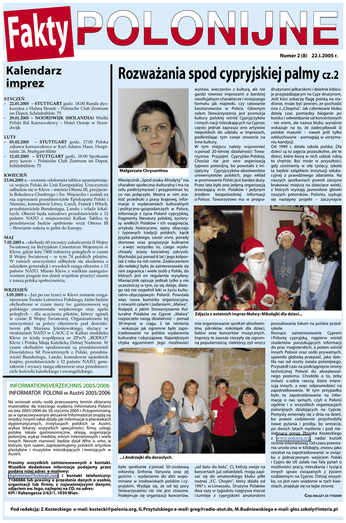 Numer 2 (8) 22.I.2005 r. Kalendarz imprez Rozważania spod cypryjskiej palmy cz.2 STYCZEŃ - 22.01.2005 – STUTTGART godz. 18.00 Runda dyskusyjna z Haliną Straub – Polnische Club Zentrum im Depot, Schönbühlstr. 75 - 29.01.2005 – NOORDWIJK (HOLANDIA) Wielki Polski Bal Karnawałowy – Hotel Oranje w Noordwijk LUTY - 05.02.2005 – STUTTGART godz. 17.00 Polska zabawa karnawałowa w Karl Adams Haus, Hospitalstr. 26, Stuttgart-Mitte - 12.02.2005 – STUTTGART godz. 18.00 Spotkanie przy kawie – Polnische Club Zentrum im Depot, Schönbühlstr. 75 KWIECIEŃ 23.04.2005 r. - zostanie odsłonięta tablica upamiętniająca wejście Polski do Unii Europejskiej. Uroczystość odbędzie się w Kleve – mieście Ottona III, przyjaciela Bolesława Chrobrego i Św. Wojciecha i zostali na nią zaproszeni przedstawiciele Episkopatu Polski i Niemiec, konsulowie Litwy, Czech, Francji i Włoch, przedstawiciele Bundestagu, Landu i władz lokalnych. Obecni będą narodowi przedstawiciele z 12 państw NATO z miejscowości Kalkar. Tablica ta przedstawiać będzie spełnienie wizji Ottona III – Słowianie należą w pełni do Europy. MAJ 7.05.2005 r. - obchody 60 rocznicy zakończenia II Wojny Światowej na Brytyjskim Cmentarzu Wojennym w Kleve, gdzie leży 7400 żołnierzy poległych w czasie II Wojny Światowej – w tym 74 polskich pilotów. W ramach uroczystości odbędzie się akademia z udziałem generalicji i wysokich rangą oficerów z 12 państw NATO. Miasto Kleve z wielkim zaangażowaniem pragnie ten dzień wspólnie przeżyć razem z naszą polską społecznością. WRZESIEŃ 3.09.2005 r. - Już po raz trzeci w Kleve zostanie zorganizowane Święto Lotnictwa Polskiego, które będzie obchodzone w czasie mszy św. garnizonowej wg polskiego ceremoniału wojskowego oraz apelu poległych – dla uczczenia pilotów, którzy zginęli w czasie II Wojny Światowej. Organizatorami tej uroczystości są polscy oficerowie pod dowództwem płk Mariana Jeleniewskiego, służący w strukturach NATO w CAOC-2 w Kalkar niedaleko Kleve ze ścisłą współpracą ze ZPwN „RODŁO” Kleve i Polską Misją Katolicką Dolnej Nadrenii. W czasie obchodów spodziewani są przedstawicieli Dowództwa Sił Powietrznych z Polski, przedstawiciel Bundestagu, Landu, konsulowie sąsiednich krajów, przedstawiciele z 12 państw NATO, generałowie i wysocy rangą oficerowie oraz przedstawiciele kościoła katolickiego i ewangelickiego. Małgorzata Chrysanthou Miesięcznik „Spod znaku Afrodyty” ma charakter społeczno-kulturalny i ma na celu podtrzymywać i przypominać to, co nas połączyło. Można w nim znaleźć przedruki z prasy krajowej, informacje o wydarzeniach kulturalnych i polityczno-gospodarczych w Polsce, informacje z życia Polonii cypryjskiej, fragmenty literatury polskiej, życiorysy wielkich Polaków i ich osiągnięcia, artykuły historyczne, opisy obyczaju i typowych tradycji polskich, kącik języka polskiego, savoir vivre, porady domowe oraz propozycje kulinarne – a więc wszystko to, czego wysłuchiwały ściany kościelnej zakrystii. Wychodzi już ponad 6 lat i jego kolportaż z roku na rok rośnie. Zaskoczeniem dla redakcji było, że zainteresowała się nim zagranica i wiele osób z Polski, do których jest on regularnie wysyłany. Miesięcznik opisuje jednak tylko a nie uczestniczy w tym, co się dzieje, dlatego też nie wypełnił luki w życiu kulturalno-obyczajowym Polonii. Powstała więc nowa komórka organizacyjna, z nowymi celami i zadaniami: „Malwa”. Rozpęd, z jakim Stowarzyszenie Kulturalne Polaków na Cyprze „Malwa” rozpoczęło swoją działalność – ponad 30 imprez w ciągu 3 lat istnienia - wskazuje jak ogromne było zapotrzebowanie na polskie wydarzenia kulturalne i obyczajowe. Największym chyba egzaminem jego możliwości wystaw, wieczorów z kulturą, ale nie gardzi również imprezami o bardziej nieoficjalnym charakterze i mniejszego formatu jak majówki, czy ratowanie kasztanowców w Polsce. Głównym celem Stowarzyszenia jest promocja kultury polskiej wśród Cypryjczyków i innych nacji mieszkających na Cyprze; często jednak zaprasza ono artystów niepolskich do udziału w imprezach, podkreślając tym swoje otwarcie na inne kultury. W tym miejscu należy wspomnieć o ponad 20-letniej działalności Towarzystwa Przyjaźni Cypryjsko-Polskiej. Chociaż nie jest ono organizacją typowo polonijną, bo powstało z inicjatywy Cypryjczyków-absolwentów uniwersytetów polskich, jego wkład w promowanie Polski jest bardzo duży. Przez lata było ono jedyną organizacją zrzeszającą m.in. Polaków i jedynym źródłem bezpośredniej informacji o Polsce. Towarzystwo ma w progra- Zdjęcia z ostatnich imprez Malwy: Mikołajki dla dzieci... mie organizowanie spotkań absolwentów, pikników, mikołajek dla dzieci, balów oraz koncertów muzycznych. Imprezy te zawsze cieszyły się ogromną popularnością; niektórzy żyli wręcz INFORMATIONSVERZEICHNIS 2005/2006 INFORMATOR POLONII w Austrii 2005/2006 Na wniosek wielu osób przesuwamy termin zbierania materiałów do trzeciego wydania Informatora Polonii na lata 2005/2006 do 30. stycznia 2005 r. Przypominamy, że w opracowywanym aktualnie Informatorze znajdą się między innymi takie działy jak: informacje o placówkach dyplomatycznych, instytucjach polskich w Austrii, wykaz lekarzy wszystkich specjalności, firmy, usługi, polskie lokale gastronomiczne, sklepy, organizacje polonijne, wykaz mediów, witryn internetowych i wiele innych. Novum stanowić będzie dział Who is who, w którym, tym razem, zaprezentujemy polskich artystów plastyków i muzyków mieszkających i tworzących w Austrii. Prosimy wszystkich zainteresowanych o kontakt. Wszelkie dodatkowe informacje podajemy przez podany niżej adres e-mailowy: [email protected] i kontakt telefoniczny: 7186886 lub prosimy o przesłanie danych o osobie, organizacji lub firmie, z najważniejszymi danymi, zdjęciem ew. logo, najlepiej na CD, na adres: KPI / Rabenga