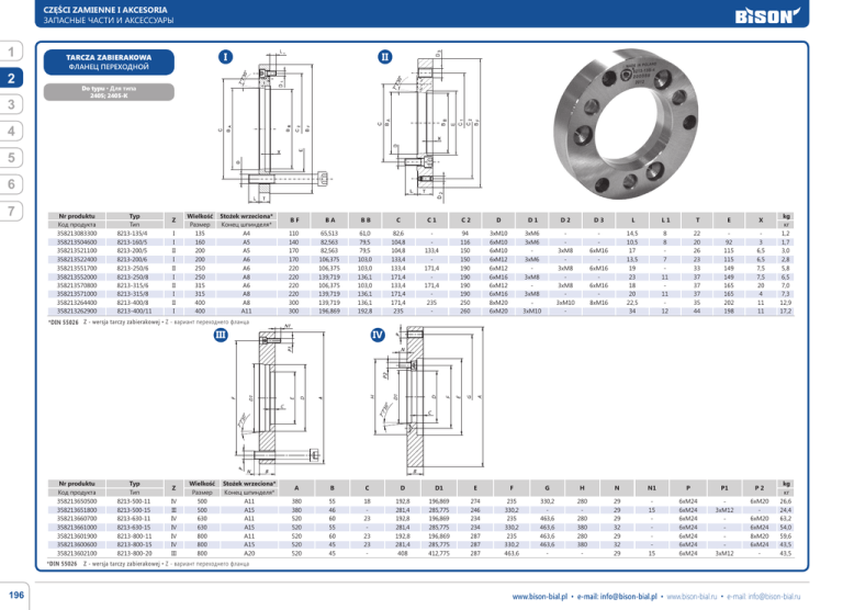 Części zamienne i akcesoria ЗАПАСНЫЕ ЧАСТИ И АКСЕССУАРЫ 1 2 I tarcza zabierakowa Фланец переходной II Do typu ▪ Для типа 2405; 2405-K 3 4 5 6 7 Nr produktu Код продукта 358213083300 358213504600 358213521100 358213522400 358213551700 358213552000 358213570800 358213571000 358213264400 358213262900 Typ Тип 8213-135/4 8213-160/5 8213-200/5 8213-200/6 8213-250/6 8213-250/8 8213-315/6 8213-315/8 8213-400/8 8213-400/11 Z I I II I II I II I II I Wielkość размер 135 160 200 200 250 250 315 315 400 400 Stożek wrzeciona* Конец шпинделя* A4 A5 A5 A6 A6 A8 A6 A8 A8 A11 BF BA BB C C1 C2 D D1 D2 D3 L L1 T E X 110 140 170 170 220 220 220 220 300 300 65,513 82,563 82,563 106,375 106,375 139,719 106,375 139,719 139,719 196,869 61,0 79,5 79,5 103,0 103,0 136,1 103,0 136,1 136,1 192,8 82,6 104,8 104,8 133,4 133,4 171,4 133,4 171,4 171,4 235 133,4 171,4 171,4 235 - 94 116 150 150 190 190 190 190 250 260 3xM10 6xM10 6xM10 6xM12 6xM12 6xM16 6xM12 6xM16 8xM20 6xM20 3xM6 3xM6 3xM6 3xM8 3xM8 3xM8 3xM8 3xM8 3xM10 - 6xM16 6xM16 6xM16 8xM16 14,5 10,5 17 13,5 19 23 18 20 22,5 34 8 8 7 11 11 12 22 20 26 23 33 37 37 37 35 44 92 115 115 149 149 165 165 202 198 3 6,5 6,5 7,5 7,5 20 4 11 11 - 3xM10 kg кг 1,2 1,7 3,0 2,8 5,8 6,5 7,0 7,3 12,9 17,2 *DIN 55026 Z - wersja tarczy zabierakowej ▪ Z - вариант переходнего фланца IV III Nr produktu Код продукта 358213650500 358213651800 358213660700 358213661000 358213601900 358213600600 358213602100 *DIN 55026 196 Typ Тип 8213-500-11 8213-500-15 8213-630-11 8213-630-15 8213-800-11 8213-800-15 8213-800-20 Z IV III IV IV IV IV III Wielkość размер 500 500 630 630 800 800 800 Stożek wrzeciona* Конец шпинделя* A11 A15 A11 A15 A11 A15 A20 A B C D D1 E F G H N N1 P 380 380 520 520 520 520 520 55 46 60 55 60 45 45 18 23 23 23 - 192,8 281,4 192,8 281,4 192,8 281,4 408 196,869 285,775 196,869 285,775 196,869 285,775 412,775 274 246 234 234 287 287 287 235 330,2 235 330,2 235 330,2 463,6 330,2 463,6 463,6 463,6 463,6 - 280 280 380 280 380 - 29 29 29 32 29 32 29 15 15 6xM24 6xM24 6xM24 6xM24 6xM24 6xM24 6xM24 P1 P2 - 6xM20 6xM20 6xM24 8xM20 6xM24 - 3xM12 - 3xM12 kg кг 26,6 24,4 63,2 54,0 59,6 43,5 43,5 Z - wersja tarczy zabierakowej ▪ Z - вариант переходнего фланца www.bison-bial.pl • e-mail: [email protected] • www.bison-bial.ru • e-mail: [email protected]