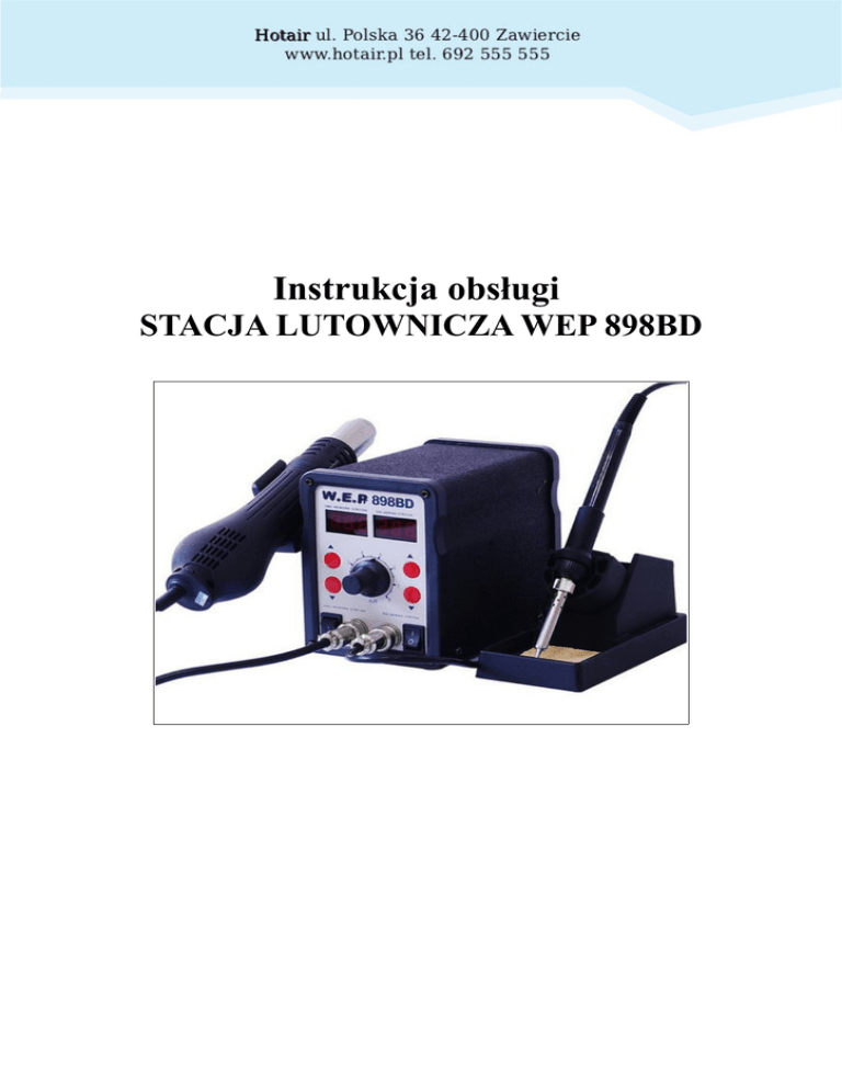 Instrukcja obsługi STACJA LUTOWNICZA WEP 898BD Krótkie wprowadzenie Stacja WEP-898BD została zaprojektowana tak, by przy zachowaniu małych rozmiarów mogła sprawdzać się jako narzędzie profesjonalne i funkcjonalne. Stacja posiada dwa osobne panele sterowania do lutownicy na gorące powietrze i lutownicy grotowej. Dodatkowo mamy możliwość regulacji temperatury oraz mocy nadmuchu powietrza, a oba urządzenia działają niezależnie. W zestawie znajdują się :lutownica grotowa, lutownica na gorące powietrze, zestaw końcówek do dmuchawy, zasilacz oraz niezbędne akcesoria. Właściwości • • • • • Solidna i ergonomiczna obudowa. Sterowanie procesorowe wysoka stabilność pracy, wydłużenie żywotności elementów grzejnych, oszczędność energii. Stan czuwania. Zapamiętuje ostatnio nastawioną temperaturę. Moc stacji 700W. Specyfikacja • • • • napięcie zasilania AC 220-240V 50Hz pobór mocy 700 W wymiary 260x165x148 mm waga 2,6 kg Stacja na gorące powietrze • źródło nadmuchu wentylator • przepływ powietrza max 120L/min • zakres temperatury 100°C~480°C • stabilność temperatury +/-1°C • rodzaj wyświetlacza LCD Stacja grotowa • zakres temperatury 200°C~480°C • stabilność temperatury +/-1°C • napięcie wyjściowe 24V • rodzaj wyświetlacza LCD Widok z przodu Rys 1. Widok z przodu WEP 898BD 1. Wyświetlacz temperatury gorącego powietrza. 2. Wskaźnik kompensacji temperatury gorącego powietrza. 3. Przycisk do zwiększania temperatury gorącego powietrza. 4. Pokrętło do regulacji nawiewu gorącego powietrza. 5. Przycisk do zmniejszania temperatury gorącego powietrza. 6. Przełącznik zasilania gorącego powietrza. 7. Kabel kolby gorącego powietrza. 8. Wyświetlacz temperatury lutownicy grotowej. 9. Wskaźnik kompensacji temperatury lutownicy grotowej. 10. Przycisk do zwiększania temperatury lutownicy grotowej. 11. Przycisk do zmniejszania temperatury lutownicy grotowej. 12. Przełącznik zasilania lutownicy grotowej. 13. Kabel kolby lutownicy grotowej. Zastosowanie Bezpieczne lutowanie elementów QFP, PLCC, BGA oraz innych wrażliwych na temperaturę komponentów. Stacja nadaje się do obkurczania i spawania plastików. Działanie kolba gorącego powietrza : • Ustaw stację na płaskiej powierzchni i odłóż kolbę gorącego powietrza na uchwyt (jeśli tego nie zrobisz stacja nie będzie działać). • Włącz zasilanie, na wyświetlaczu pojawi się "---" co oznacza, że stacja jest w stanie gotowości. • Ustaw wybraną temperaturę i podnieś kolbę z uchwytu stacja przejdzie w stan nagrzewania. Wyregulować nawiew powietrza kiedy temperatura będzie stała. W tym momencie stacja jest gotowa do użycia. • Jeśli kończymy pracę należy odłożyć kolbę na uchwyt, stacja automatycznie zacznie obniżać temperaturę gorącego powietrza. Kiedy temperatura spadnie poniżej 100ºC na wyświetlaczu pojawi się "---", stacja przejdzie w stan czuwania. Kiedy temperatura będzie niższa niż 70ºC stacja przestanie pracować. • Nie używać gorącego powietrza przez zbyt długi czas aby uniknąć przegrzania elementu grzejnego. kolba grotowa : • Podłącz kolbę grotową do stacji i odłóż ją na podstawkę. • Włącz zasilanie, kiedy wskaźnik temperatury (rys. 1 nr 9) miga oznacza to, że temperatura grota jest stała, można zacząć pracę urządzeniem. Ostrzeżenie • • • • Po skończonej pracy urządzeniem nie należy odłączać wtyczki od zasilania kiedy trwa proces automatycznego obniżania temperatury kolby gorącego powietrza. Gdy kolba gorącego powietrza jest włączona jej temperatura wacha się w zakresie od 100 do 450 ºC. Należy zachować szczególną ostrożność podczas użytkowania aby uniknąć obrażeń lub uszkodzenia przedmiotów w obszarze pracy urządzenia. Należy przestrzegać następujących zasad : nie kierować strumienia gorącego powietrza w kierunku personelu, nie dotykać metalowych elementów w pobliżu dyszy. Nie używać urządzenia w pobliżu łatwopalnych gazów i materiałów. Wyłączyć zasilanie kiedy urządzenie nie jest już używane lub pozostawione bez opieki. Przed wymianą cześci lub przed przechowywaniem urządzenia należy postawić urządzenie do ostygnięcia a następnie odłączyć zasilanie. Ustawianie temperatury Kiedy urządzenie jest włączone wyreguluj za pomocą przycisków 3 i 5 (rys. 1) temperaturę gorącego powietrza lub przy pomocy przycisków 10 i 11 (rys. 1) temperaturę lutownicy grotowej. Naciśnięcie przycisku 3 lub 10 (rys. 1) zwiększa temperaturę o 1 ºC, na wyświetlaczu pojawia się zadana temperatura. Naciśnięcie przycisku 5 lub 11 (rys. 1) zmniejsza temperaturę o 1 ºC. Przytrzymując dłużej wyżej wymienione przyciski następuje szybki przyrost lub spadek zadanej temperatury. Po zwolnienu przycisku wyświetlacz po około 2s pokazuje ustawioną temperaturę. Komunikaty A. Na wyświetlaczu pojawia się "---" wyraża to temperaturę mniejszą niż 100 ºC stacja przechodzi w stan czuwania, należy umieścić kolbę gorącego powietrza w uchwycie. B. Na wyświetlaczu pojawia się "SE" oznacza to problem z czujnikiem ciepła, należy go wymienić. C. Na wyświetlaczu pojawia się "SA" oznacza to problem z pamięcią stacji, należy ją wymienić. D. Kiedy stacja pracuje i jej temperatura jest niższa niż 50 ºC i nie podnosi się może to oznaczać, że element grzejny jest uszkodzony, należy wymienić element grzejny. Zalecenia • • • • • • • Po podłączeniu urządzenia do zasilania kolba gorącego powietrza powinna być odłożona na uchwyt. Upewnić się czy wylot gorącego powietrza jest czysty i niczym nie zablokowany. Po użyciu kolba gorącego powietrza musi być odłożona na uchwyt, wtedy temperatura nawiewu automatycznie zacznie maleć aż na wyświetlaczu pojawią się "---", wtedy nawiew się zatrzymuje i można bezpiecznie wyłączyć gorące powietrze przyciskiem. W odniesieniu do wymogów u
