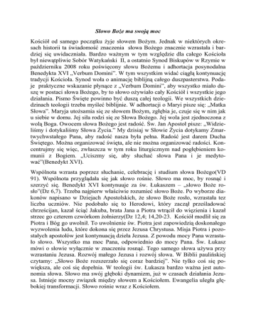 Słowo BoŜe ma swoją moc Kościół od samego początku Ŝyje słowem BoŜym. Jednak w niektórych okresach historii ta świadomość znaczenia słowa BoŜego znacznie wzrastała i bardziej się uwidaczniała. Bardzo waŜnym w tym względzie dla całego Kościoła był niewątpliwie Sobór Watykański II, a ostatnio Synod Biskupów w Rzymie w październiku 2008 roku poświęcony słowu BoŜemu i adhortacja posynodalna Benedykta XVI „Verbum Domini”. W tym wszystkim widać ciągłą kontynuację tradycji Kościoła. Synod woła o animację biblijną całego duszpasterstwa. Podaje praktyczne wskazanie płynące z „Verbum Domini”, aby wszystko miało duszę w postaci słowa BoŜego, by to słowo oŜywiało cały Kościół i wszystkie jego działania. Pismo Święte powinno być duszą całej teologii. We wszystkich dziedzinach teologii trzeba myśleć biblijnie. W adhortacji o Maryi pisze się: „Matka Słowa”. Maryja utoŜsamia się ze słowem BoŜym, zgłębia je, czuje się w nim jak u siebie w domu. Jej siła rodzi się ze Słowa BoŜego. Jej wola jest zjednoczona z wolą Boga. Owocem słowa BoŜego jest radość. Św. Jan Apostoł pisze: „Widzieliśmy i dotykaliśmy Słowa śycia.” My dzisiaj w Słowie śycia dotykamy Zmartwychwstałego Pana, aby radość nasza była pełna. Radość jest darem Ducha Świętego. MoŜna organizować święta, ale nie moŜna organizować radości. Koncentrujmy się więc, zwłaszcza w tym roku liturgicznym nad pogłębieniem komunii z Bogiem. „Uciszmy się, aby słuchać słowa Pana i je medytować”(Benedykt XVI). Wspólnota wzrasta poprzez słuchanie, celebrację i studium słowa BoŜego(VD 91). Wspólnota przyglądała się jak słowo rośnie. Słowo ma moc, by rosnąć i szerzyć się. Benedykt XVI kontynuuje za św. Łukaszem – „słowo BoŜe rosło”(Dz 6,7). Trzeba najpierw właściwie rozumieć słowo BoŜe. Po wyborze diakonów napisano w Dziejach Apostolskich, Ŝe słowo BoŜe rosło, wzrastała tez liczba uczniów. Nie podobało się to Herodowi, który zaczął prześladować chrześcijan, kazał ściąć Jakuba, brata Jana a Piotra wtrącił do więzienia i kazał strzec go czterem czwórkom Ŝołnierzy(Dz 12,4; 14,20-23. Kościół modlił się za Piotra i Bóg go uwolnił. To uwolnienie św. Piotra jest zapowiedzią doskonałego wyzwolenia ludu, które dokona się przez Jezusa Chrystusa. Misja Piotra i pozostałych apostołów jest kontynuacją dzieła Jezusa. Z powodu mocy Pana wzrastało słowo. Wszystko ma moc Pana, odpowiednio do mocy Pana. Św. Łukasz mówi o słowie wyłącznie w znaczeniu rosnąć. Tego samego słowa uŜywa przy wzrastaniu Jezusa. Rozwój małego Jezusa i rozwój słowa. W Biblii paulińskiej czytamy: „Słowo BoŜe rozszerzało się coraz bardziej”. Nie tylko coś się powiększa, ale coś się dopełnia. W teologii św. Łukasza bardzo waŜna jest autonomia słowa. Słowo ma swój głęboki dynamizm, juŜ w czasach działania Jezusa. Istnieje mocny związek między słowem a Kościołem. Ewangelia uległa głębokiej transformacji. Słowo rośnie wraz z Kościołem. Warto zauwaŜyć moc słowa BoŜego u św. Pawła. W tamtych czasach Korynt był synonimem grzechów. ChociaŜ dzisiaj mówi się, Ŝe to sąsiadujące miasta opowiadały o sobie nawzajem złe rzeczy. To co działo się w mieście dotyczyło teŜ chrześcijan. To czyni nauczanie Pawła reprezentatywnym. W takiej sytuacji, kiedy jest duŜo zła moŜna zawsze uciec się do groźby. Odwołanie się do ustalonych zasad, do przykazań, powiedzenie - „nie wolno” - kładzie kres wszelkim dyskusjom. Nie wymaga teŜ uzasadnienia, bo ktoś wyŜszy ode mnie to powiedział. Jednak moŜe być odebrane jako traktowanie z góry. My częściej niŜ śydzi domagamy się wyjaśnień. Kiedy pojawia się problem cudzołóstwa, kazirodztwa, św. Paweł nie odwołuje się do przykazań, lecz stosuje inną argumentację. W 1 Liście do Koryntian(6) rozpustę porównuje do prostytutki. Ci chrześcijanie w Koryncie moŜe nie dawniej niŜ 5 lat temu byli jeszcze poganami. Cudzołóstwo zasługiwało na ostrą reprymendę. Apostoł niczego nie wyrzuca, nie grozi. Uświadamia jednak wyniesienie do stanu Ŝycia w Chrystusie. Zjednoczenie z Chrystusem wyklucza Ŝycie z kimś innym. Więź z prostytutką rozbija jedność z Chrystusem. Św. Paweł nie stawia tego na jednej linii. To wskazanie istotnej róŜnicy tych relacji. Chrześcijanie nie są satelitami krąŜącymi wokół Boga, to jest zjednoczenie o wiele wyŜsze. Łączenie się z nierządnicą wyklucza więź z Chrystusem. „Ciało nasze jest świątynią Ducha Świętego, juŜ nie naleŜymy do samych siebie.” Więź małŜeńska – dwoje tworzy jedno ciało. Dzielimy się nim z Bogiem. „Za wielką cenę zostaliście odkupieni.” Tą ceną jest Krew Chrystusa. Chwalcie więc Boga w waszym ciele. Nasze ciała naleŜą do Boga. Do tego zobowiązują przykazania. Tego, który to rozumie nie trzeba pilnować. Więź z Chrystusem „participationis” – trwanie, czy pozostanie w Chrystusie? Apostoł nie namawia do przykazań, nic nie cytuje, mówi o właściwych i niewłaściwych postawach. Rodzice tłumaczą to swoim dzieciom – „nie rób tego bo, Bogu będzie przykro, Bóg będzie się smucić”. WaŜne są relacje osobowe. Rodzice dobrze to tłumaczą swoim dzieciom. Przykazania są dobre, ale nie powinny być pokazywane jako zobowiązanie, lecz jako odpowiedź Bogu. Wolimy świadomość daru. zachowywanie przykazań nie jest zasadą zjednoczenia z Bogiem. Kiedy pojawia się zdrada w małŜeństwie, wtedy się mówi: „zdradziłeś mnie”, nie to jest najpierw, Ŝe przekroczyłeś przykazanie, ale zraniłeś mnie. Zranienie współmałŜonka jest zranieniem Chrystusa. Przykazanie zawsze będzie miało coś z nakazu. Relacje z Bogiem to dar Ŝycia w zjednoczeniu z Bogiem. Człowiek nie wnosi nic w relacje z Bogiem, tylko ciągle grzeszy. Apostoł odwodzi od rozpusty uświadamiaj