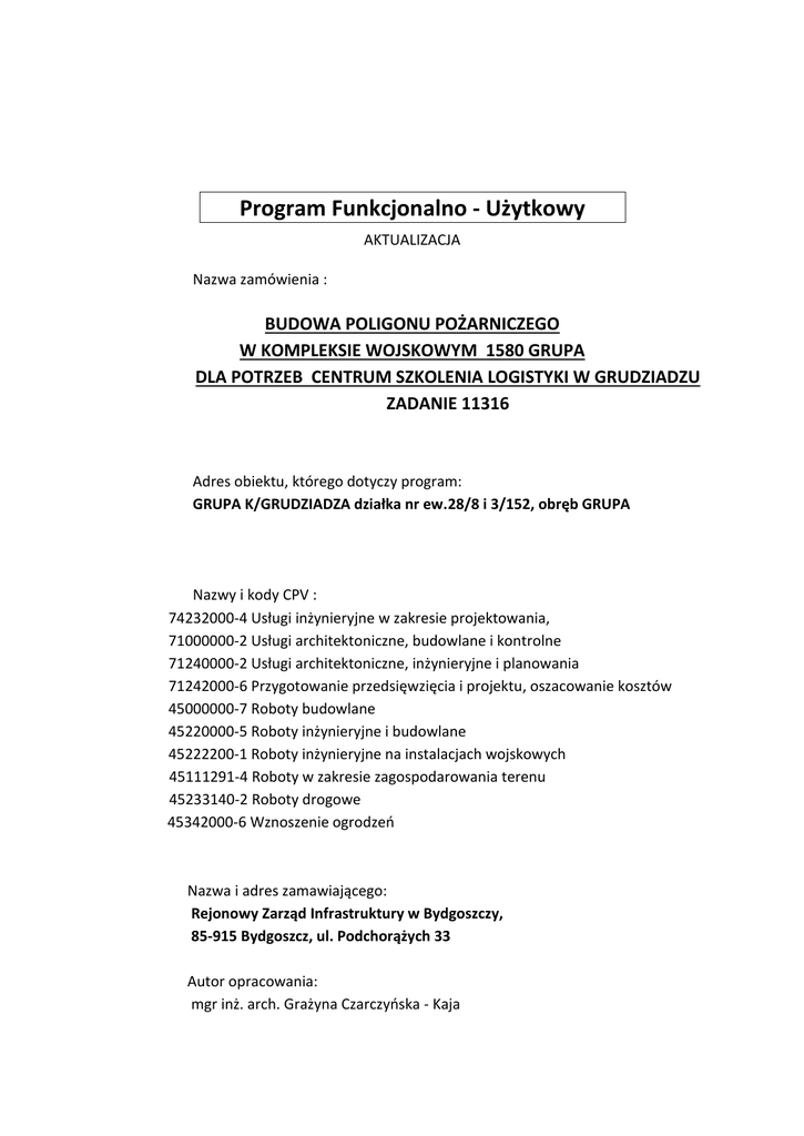 Program Funkcjonalno - Użytkowy AKTUALIZACJA Nazwa zamówienia : BUDOWA POLIGONU POŻARNICZEGO W KOMPLEKSIE WOJSKOWYM 1580 GRUPA DLA POTRZEB CENTRUM SZKOLENIA LOGISTYKI W GRUDZIADZU ZADANIE 11316 Adres obiektu, którego dotyczy program: GRUPA K/GRUDZIADZA działka nr ew.28/8 i 3/152, obręb GRUPA Nazwy i kody CPV : 74232000-4 Usługi inżynieryjne w zakresie projektowania, 71000000-2 Usługi architektoniczne, budowlane i kontrolne 71240000-2 Usługi architektoniczne, inżynieryjne i planowania 71242000-6 Przygotowanie przedsięwzięcia i projektu, oszacowanie kosztów 45000000-7 Roboty budowlane 45220000-5 Roboty inżynieryjne i budowlane 45222200-1 Roboty inżynieryjne na instalacjach wojskowych 45111291-4 Roboty w zakresie zagospodarowania terenu 45233140-2 Roboty drogowe 45342000-6 Wznoszenie ogrodzeń Nazwa i adres zamawiającego: Rejonowy Zarząd Infrastruktury w Bydgoszczy, 85-915 Bydgoszcz, ul. Podchorążych 33 Autor opracowania: mgr inż. arch. Grażyna Czarczyńska - Kaja ZADANIE 11316 RZI BYDGOSZCZ Spis zawartości programu funkcjonalno – użytkowego I. część opisowa 1. Ogólny opis przedmiotu zamówienia 2. Podstawa opracowania programu 3. Zakres dokumentacji projektowej i robót budowlanych 4. Charakterystyczne parametry określające wielkość obiektu 5. Aktualne uwarunkowania wykonania przedmiotu zamówienia 6. Ogólne właściwości funkcjonalno-użytkowe obiektu 7. Szczegółowe właściwości funkcjonalno - użytkowe 8. Wymagania Zamawiającego w stosunku do przedmiotu zamówienia 9. Cechy obiektu i wskaźniki ekonomiczne 10. Ogólne warunki wykonania i odbioru robót 11. Wymagania szczegółowe II. część informacyjna 1. Wytyczne inwestorskie i uwarunkowania związane z budową i jej prowadzeniem 2. Przepisy prawne i normy związane z projektowaniem i wykonaniem zamierzenia budowlanego Załączniki: 1. rysunek koncepcji zagospodarowania terenu Poligonu Pożarniczego 2. rysunek koncepcji planszy zbiorczej sieci Poligonu Pożarniczego 3. legenda do koncepcji planszy zbiorczej sieci POLIGON POŻARNICZY GRUPA 2 ZADANIE 11316 RZI BYDGOSZCZ I. Cześć opisowa 1 . Ogólny opis przedmiotu zamówienia Przedmiotem zamówienia jest zaprojektowanie i wykonanie (wybudowanie) POLIGONU POŻARNICZEGO DLA POTRZEB CENTRUM SZKOLENIA LOGISTYKI W GRUDZIADZUNA TERENIE KOMPLEKSU WOJSKOWEGO 1580 GRUPA Przedmiot zamówienia obejmuje kompleksowe wykonanie w systemie „zaprojektuj i wybuduj” tj.: - opracowanie projektu budowlanego - uzyskanie wymaganych przepisami opinii i uzgodnień wraz uzyskaniem w imieniu inwestora pozwolenia na budowę, - opracowanie projektów wykonawczych, specyfikacji technicznych wykonania i odbioru robót, przedmiaru robót i kosztorysu inwestorskiego - wykonanie robót budowlanych, montażowych, drogowych, w zakresie infrastruktury technicznej oraz zagospodarowania terenu w oparciu o opracowaną dokumentacje, - dostawa oraz montaż urządzeń i elementów wchodzących w skład zagospodarowania terenu i ich uruchomienie, - wykonanie dokumentacji powykonawczej oraz uzyskanie pozwolenia na użytkowanie - przekazanie zamawiającemu gotowego do użytkowania obiektu wraz z dokumentacją. POLIGON POŻARNICZY GRUPA 3 ZADANIE 11316 RZI BYDGOSZCZ 2. Podstawa opracowania programu • Umowa SPiP/PN/6/U/9 z dnia 6.12.2013 r. zlecenie nr 2/WB/SPiP/2014 z dnia 16.04.2014 r. na aktualizację programów; • Minimalne Wojskowe Wymagania Organizacyjno – Użytkowe – zatwierdzone • Koncepcja programowo – przestrzenna zagospodarowania kompleksów 1580 i 1501 w Grupie k. Grudziądza dla potrzeb Centrum Szkolenia Logistyki z dnia 18.09.2012 r. • Rozporządzenie Ministra Infrastruktury w sprawie warunków technicznych jakim powinny odpowiadać budynki i ich usytuowanie z dnia 12.04.2002 r. (Dz.U. 2002.75.563) z późniejszymi zmianami. • Rozporządzenie Ministra Spraw Wewnętrznych i Administracji w sprawie ochrony przeciwpożarowej budynków, innych obiektów budowlanych i terenów z dnia 7.06.2010 r. (Dz.U. 2010.109.719) • Rozporządzenie Rady Ministrów w sprawie szczegółowego sposobu i trybu finansowania inwestycji z budżetu państwa z dnia 2.12.2010 r. (Dz.U. 2010.238.1579) • Zarządzeniem Nr 42 MON z dnia 16.08.2011 r. (Dz.Urz.MON z 2011 r., nr 17, poz.236) • Instrukcja o ochronie obiektów wojskowych OIN 5/2011: • wizja lokalna i uzgodnienia robocze z użytkownikiem; • inne przepisy szczegółowe i zasady wiedzy technicznej związane z procesem budowlanym. 3. Zakres dokumentacji projektowej i robót budowlanych 3.1. Zakres dokumentacji projektowej. 3.1.1.Wykonanie projektu wstępnego zagospodarowania terenu wraz z koncepcją tras instalacji zewnętrznych oraz obiektów występujących na terenie opracowania zgodnie z wytycznymi i dokumentacjami producenta urządzeń treningowych. Projekt wstępny należy uzgodnić z użytkownikiem i inwestorem oraz na jego podstawie uzyskać wymagane prawomocne decyzje administracyjne. Projekt wstępny Wykonawca opracuje na podstawie Koncepcji Programowo – Przestrzennej CSLog dostarczonej przez Inwestora oraz zgodnie z zapisami niniejszego Programu Funkcjonalno – Użytkowego oraz Wymaganiami Techniczno – Użytkowymi zatwierdzonymi 22.04.2014 r. będącymi załącznikiem do niniejszego programu. Na podstawie projektu wstępnego Poligonu Pożarniczego Wykonawca uzyska prawomocną decyzję o lokalizacji celu publicznego POLIGON POŻARNICZY GRUPA 4 ZADANIE 11316 RZI BYDGOSZCZ 3.1.2.Wykonanie projektu budowlanego w zakresie niezbędnym do uzyskania decyzji o pozwoleniu na budowę i zgłoszenia robót budowlanych. Projekt budowlany Wykonawca opracuje na podstawie Koncepcji Programowo – Przestrzennej CSLog dostarczonej przez Inwestora oraz zgodnie z zapisami niniejszego programu funkcjonalno – użytkowego opracowanego przez Wykonawcę i uzgodnionego z Inwestorem i Użytkownikiem projektu wstępnego, a także zapisów wynikających z decyzji administracyjnych. Na podstawie Projektu budowlanego Wykonawca uzyska w 