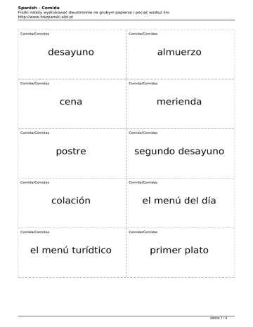 Spanish - Comida Fiszki należy wydrukować dwustronnie na grubym papierze i pociąć wzdłuż lini. http://www.hiszpanski.alol.pl Comida/Comidas Comida/Comidas desayuno Comida/Comidas almuerzo Comida/Comidas cena Comida/Comidas merienda Comida/Comidas postre Comida/Comidas segundo desayuno Comida/Comidas colación Comida/Comidas el menú turídtico el menú del día Comida/Comidas primer plato strona 1 / 4 Spanish - Comida Fiszki należy wydrukować dwustronnie na grubym papierze i pociąć wzdłuż lini. http://www.hiszpanski.alol.pl Comida/Comidas Comida/Comidas lanch Comida/Comidas śniadanie Comida/Comidas podwieczorek Comida/Comidas kolacja Comida/Comidas drugie śniadanie Comida/Comidas menu dnia Comida/Comidas pierwsze danie deser Comida/Comidas przekąska Comida/Comidas menu regionalne strona 2 / 4 Spanish - Comida Fiszki należy wydrukować dwustronnie na grubym papierze i pociąć wzdłuż lini. http://www.hiszpanski.alol.pl Comida/Comidas Comida/Comidas última comida Comida/Comidas varios platos Comida/Comidas día de campo banquete Comida/Comidas bufé strona 3 / 4 Spanish - Comida Fiszki należy wydrukować dwustronnie na grubym papierze i pociąć wzdłuż lini. http://www.hiszpanski.alol.pl Comida/Comidas Comida/Comidas wielodaniowy Comida/Comidas ostatni posiłek Comida/Comidas bankiet piknik Comida/Comidas szwedzki stół strona 4 / 4 Powered by TCPDF (www.tcpdf.org)