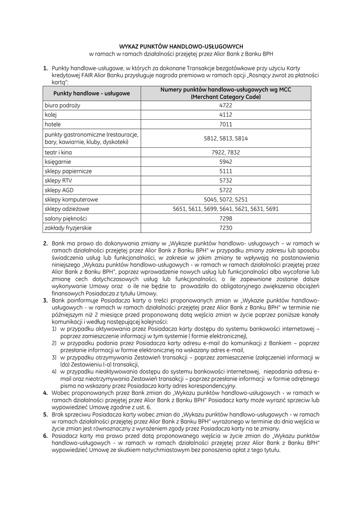 WYKAZ PUNKTÓW HANDLOWO-USŁUGOWYCH w ramach w ramach działalności przejętej przez Alior Bank z Banku BPH 1. Punkty handlowe-usługowe, w których za dokonane Transakcje bezgotówkowe przy użyciu Karty kredytowej FAIR Alior Banku przysługuje nagroda premiowa w ramach opcji „Rosnący zwrot za płatności kartą”: Numery punktów handlowo-usługowych wg MCC Punkty handlowe - usługowe (Merchant Category Code) biura podroży 4722 kolej 4112 hotele 7011 punkty gastronomiczne (restauracje, bary, kawiarnie, kluby, dyskoteki) 5812, 5813, 5814 teatr i kina 7922, 7832 księgarnie 5942 sklepy papiernicze 5111 sklepy RTV 5732 sklepy AGD 5722 sklepy komputerowe 5045, 5072, 5251 sklepy odzieżowe 5651, 5611, 5699, 5641, 5621, 5631, 5691 salony piękności 7298 zakłady fryzjerskie 7230 2. Bank ma prawo do dokonywania zmiany w „Wykazie punktów handlowo- usługowych – w ramach w ramach działalności przejętej przez Alior Bank z Banku BPH” w przypadku zmiany zakresu lub sposobu świadczenia usług lub funkcjonalności, w zakresie w jakim zmiany te wpływają na postanowienia niniejszego „Wykazu punktów handlowo-usługowych - w ramach w ramach działalności przejętej przez Alior Bank z Banku BPH”, poprzez wprowadzenie nowych usług lub funkcjonalności albo wycofanie lub zmianę cech dotychczasowych usług lub funkcjonalności, o ile zapewnione zostanie dalsze wykonywanie Umowy oraz o ile nie będzie to prowadziło do obligatoryjnego zwiększenia obciążeń finansowych Posiadacza z tytułu Umowy. 3. Bank poinformuje Posiadacza karty o treści proponowanych zmian w „Wykazie punktów handlowousługowych - w ramach w ramach działalności przejętej przez Alior Bank z Banku BPH” w terminie nie późniejszym niż 2 miesiące przed proponowaną datą wejścia zmian w życie poprzez poniższe kanały komunikacji i według następującej kolejności: 1) w przypadku aktywowania przez Posiadacza karty dostępu do systemu bankowości internetowej – poprzez zamieszczenie informacji w tym systemie ( formie elektronicznej), 2) w przypadku podania przez Posiadacza karty adresu e-mail do komunikacji z Bankiem – poprzez przesłanie informacji w formie elektronicznej na wskazany adres e-mail, 3) w przypadku otrzymywania Zestawień transakcji – poprzez zamieszczenie (załączenie) informacji w (do) Zestawieniu (-a) transakcji, 4) w przypadku nieaktywowania dostępu do systemu bankowości internetowej, niepodania adresu email oraz nieotrzymywania Zestawień transakcji – poprzez przesłanie informacji w formie odrębnego pisma na wskazany przez Posiadacza karty adres korespondencyjny. 4. Wobec proponowanych przez Bank zmian do „Wykazu punktów handlowo-usługowych - w ramach w ramach działalności przejętej przez Alior Bank z Banku BPH” Posiadacz karty może wyrazić sprzeciw lub wypowiedzieć Umowę zgodnie z ust. 6. 5. Brak sprzeciwu Posiadacza karty wobec zmian do „Wykazu punktów handlowo-usługowych - w ramach w ramach działalności przejętej przez Alior Bank z Banku BPH” wyrażonego w terminie do dnia wejścia w życie zmian jest równoznaczny z wyrażeniem zgody przez Posiadacza karty na te zmiany. 6. Posiadacz karty ma prawo przed datą proponowanego wejścia w życie zmian do „Wykazu punktów handlowo-usługowych - w ramach w ramach działalności przejętej przez Alior Bank z Banku BPH” wypowiedzieć Umowę ze skutkiem natychmiastowym bez ponoszenia opłat z tego tytułu. 7. W przypadku, gdy Posiadacz karty zgłosi sprzeciw, o którym mowa w ust. 4, ale nie dokona wypowiedzenia, o którym mowa w ust. 6, Umowa wygasa z dniem poprzedzającym dzień wejścia w życie proponowanych zmian, bez ponoszenia przez Posiadacza karty żadnych opłat z tego tytułu. 8. W przypadku zmiany „Wykazu punktów handlowo-usługowych - w ramach w ramach działalności przejętej przez Alior Bank z Banku BPH” i podjęcia w jej wyniku przez Posiadacza karty decyzji o zmianie opcji, zmiana taka będzie bezpłatna. Nie wyłącza to możliwości skorzystania przez Posiadacza karty z uprawnienia, o którym mowa w par. 1 ust 11 Umowy.