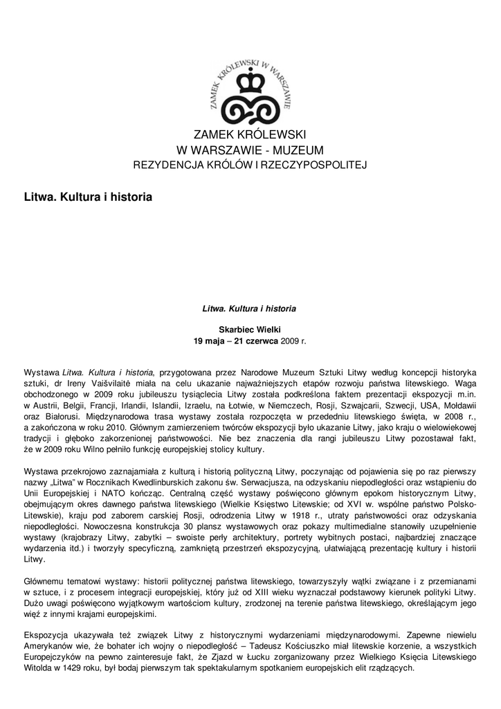 ZAMEK KRÓLEWSKI W WARSZAWIE - MUZEUM REZYDENCJA KRÓLÓW I RZECZYPOSPOLITEJ Litwa. Kultura i historia Litwa. Kultura i historia Skarbiec Wielki 19 maja – 21 czerwca 2009 r. Wystawa Litwa. Kultura i historia, przygotowana przez Narodowe Muzeum Sztuki Litwy według koncepcji historyka sztuki, dr Ireny Vaišvilaitė miała na celu ukazanie najważniejszych etapów rozwoju państwa litewskiego. Waga obchodzonego w 2009 roku jubileuszu tysiąclecia Litwy została podkreślona faktem prezentacji ekspozycji m.in. w Austrii, Belgii, Francji, Irlandii, Islandii, Izraelu, na Łotwie, w Niemczech, Rosji, Szwajcarii, Szwecji, USA, Mołdawii oraz Białorusi. Międzynarodowa trasa wystawy została rozpoczęta w przededniu litewskiego święta, w 2008 r., a zakończona w roku 2010. Głównym zamierzeniem twórców ekspozycji było ukazanie Litwy, jako kraju o wielowiekowej tradycji i głęboko zakorzenionej państwowości. Nie bez znaczenia dla rangi jubileuszu Litwy pozostawał fakt, że w 2009 roku Wilno pełniło funkcję europejskiej stolicy kultury. Wystawa przekrojowo zaznajamiała z kulturą i historią polityczną Litwy, poczynając od pojawienia się po raz pierwszy nazwy „Litwa” w Rocznikach Kwedlinburskich zakonu św. Serwacjusza, na odzyskaniu niepodległości oraz wstąpieniu do Unii Europejskiej i NATO kończąc. Centralną część wystawy poświęcono głównym epokom historycznym Litwy, obejmującym okres dawnego państwa litewskiego (Wielkie Księstwo Litewskie; od XVI w. wspólne państwo PolskoLitewskie), kraju pod zaborem carskiej Rosji, odrodzenia Litwy w 1918 r., utraty państwowości oraz odzyskania niepodległości. Nowoczesna konstrukcja 30 plansz wystawowych oraz pokazy multimedialne stanowiły uzupełnienie wystawy (krajobrazy Litwy, zabytki – swoiste perły architektury, portrety wybitnych postaci, najbardziej znaczące wydarzenia itd.) i tworzyły specyficzną, zamkniętą przestrzeń ekspozycyjną, ułatwiającą prezentację kultury i historii Litwy. Głównemu tematowi wystawy: historii politycznej państwa litewskiego, towarzyszyły wątki związane i z przemianami w sztuce, i z procesem integracji europejskiej, który już od XIII wieku wyznaczał podstawowy kierunek polityki Litwy. Dużo uwagi poświęcono wyjątkowym wartościom kultury, zrodzonej na terenie państwa litewskiego, określającym jego więź z innymi krajami europejskimi. Ekspozycja ukazywała też związek Litwy z historycznymi wydarzeniami międzynarodowymi. Zapewne niewielu Amerykanów wie, że bohater ich wojny o niepodległość – Tadeusz Kościuszko miał litewskie korzenie, a wszystkich Europejczyków na pewno zainteresuje fakt, że Zjazd w Łucku zorganizowany przez Wielkiego Księcia Litewskiego Witolda w 1429 roku, był bodaj pierwszym tak spektakularnym spotkaniem europejskich elit rządzących. Organizatorami polskiej edycji wystawy stały się Zamek Królewski w Warszawie i Ambasada Republiki Litewskiej w Rzeczypospolitej Polskiej. Oprac. Izabela Witkowska-Martynowicz Wystawa była czynna dla zwiedzających od poniedziałku do soboty w godz. 10.00 – 18.00, w niedziele od 11.00 do 18.00. Wstęp – na podstawie biletu na zwiedzanie Zamku. Zamek Królewski w Warszawie - Muzeum. Rezydencja Królów i Rzeczypospolitej www.zamek-krolewski.pl