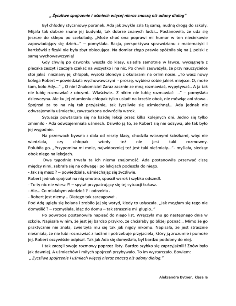 „ Życzliwe spojrzenie i uśmiech więcej nieraz znaczą niż udany dialog” Był chłodny styczniowy poranek. Ada jak zwykle szła tą samą, nudną drogą do szkoły. Mijała tak dobrze znane jej budynki, tak dobrze znanych ludzi… Postanowiła, że uda się jeszcze do sklepu po czekoladę. „Może chod ona poprawi mi humor w ten nieciekawie zapowiadający się dzieo…” – pomyślała. Racja, perspektywa sprawdzianu z matematyki i kartkówki z fizyki nie była zbyt obiecująca. Na domiar złego prawie spóźniła się na j. polski z samą wychowawczynią! Gdy chwilę po dzwonku weszła do klasy, usiadła samotnie w ławce, wyciągnęła z plecaka zeszyt i zaczęła czekad na wszystko i na nic. Po chwili zauważyła, że przy nauczycielce stoi jakiś nieznany jej chłopak, wysoki blondyn z okularami na orlim nosie. „To wasz nowy kolega Robert – powiedziała wychowawczyni - proszę, wybierz sobie jakieś miejsce. O, może tam, koło Ady...” „ O nie! Znakomicie! Zaraz zacznie ze mną rozmawiad, wypytywad.. A ja tak nie lubię rozmawiad z obcymi.. Właściwie.. Z nikim nie lubię rozmawiad ..” – pomyślała dziewczyna. Ale ku jej zdumieniu chłopak tylko usiadł na krześle obok, nie mówiąc ani słowa . Spojrzał za to na nią tak przyjaźnie, tak życzliwie się uśmiechnął... Ada jednak nie odwzajemniła uśmiechu, zawstydzona odwróciła wzrok. Sytuacja powtarzała się na każdej lekcji przez kilka kolejnych dni. Jedno się tylko zmieniło - Ada odwzajemniała uśmiech. Dziwiło ją to, że Robert się nie odzywa, ale tak było jej wygodnie. Na przerwach bywała z dala od reszty klasy, chodziła własnymi ścieżkami, więc nie wiedziała, czy chłopak wtedy też nie jest taki rozmowny. Polubiła go. „Przypomina mi mnie, najwidoczniej też jest taki nieśmiały...”- myślała, siedząc obok niego na lekcjach. Dwa tygodnie trwała ta ich niema znajomośd. Ada postanowiła przerwad ciszę między nimi, zebrała się na odwagę i po lekcjach podeszła do niego. - Jak się masz ? – powiedziała, uśmiechając się życzliwie. Robert jednak spojrzał na nią smutno, spuścił wzrok i szybko odszedł. - To ty nic nie wiesz ?! – spytał przypatrujący się tej sytuacji Łukasz. - Ale... Co miałabym wiedzied ? - odrzekła . - Robert jest niemy .. Dlatego tak zareagował . Pod Adą ugięły się kolana i zrobiło jej się wstyd, kiedy to usłyszała. „Jak mogłam się tego nie domyślid ? – rozmyślała, idąc do domu – tak strasznie mi głupio..” Po powrocie postanowiła napisad do niego list. Wręczyła mu go następnego dnia w szkole. Napisała w nim, że jest jej bardzo przykro, że chciałaby go bliżej poznad… Mimo że go praktycznie nie znała, zwierzyła mu się tak jak nigdy nikomu. Napisała, że jest strasznie nieśmiała, że nie lubi rozmawiad z ludźmi i potrzebuje przyjaciela, który ją zrozumie i pomoże jej. Robert oczywiście odpisał. Tak jak Ada się domyślała, był bardzo podobny do niej. I tak zaczęli swoje rozmowy poprzez listy. Bardzo szybko się zaprzyjaźnili! Znów było jak dawniej. A uśmiechów i miłych spojrzeo przybywało. To im wystarczało. Bowiem: „ Życzliwe spojrzenie i uśmiech więcej nieraz znaczą niż udany dialog.” Aleksandra Bytner, klasa Ia