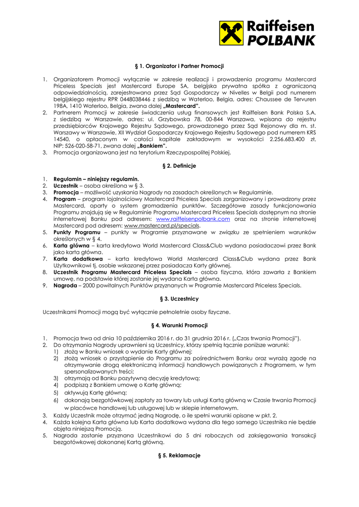 § 1. Organizator i Partner Promocji 1. 2. 3. Organizatorem Promocji wyłącznie w zakresie realizacji i prowadzenia programu Mastercard Priceless Specials jest Mastercard Europe SA, belgijska prywatna spółka z ograniczoną odpowiedzialnością, zarejestrowana przez Sąd Gospodarczy w Nivelles w Belgii pod numerem belgijskiego rejestru RPR 0448038446 z siedzibą w Waterloo, Belgia, adres: Chaussee de Tervuren 198A, 1410 Waterloo, Belgia, zwana dalej „Mastercard”. Partnerem Promocji w zakresie świadczenia usług finansowych jest Raiffeisen Bank Polska S.A. z siedzibą w Warszawie, adres: ul. Grzybowska 78, 00-844 Warszawa, wpisana do rejestru przedsiębiorców Krajowego Rejestru Sądowego, prowadzonego przez Sąd Rejonowy dla m. st. Warszawy w Warszawie, XII Wydział Gospodarczy Krajowego Rejestru Sądowego pod numerem KRS 14540, o opłaconym w całości kapitale zakładowym w wysokości 2.256.683.400 zł, NIP: 526-020-58-71, zwana dalej „Bankiem”. Promocja organizowana jest na terytorium Rzeczypospolitej Polskiej. § 2. Definicje 1. 2. 3. 4. 5. 6. 7. 8. 9. Regulamin – niniejszy regulamin. Uczestnik – osoba określona w § 3. Promocja – możliwość uzyskania Nagrody na zasadach określonych w Regulaminie. Program – program lojalnościowy Mastercard Priceless Specials zorganizowany i prowadzony przez Mastercard, oparty o system gromadzenia punktów. Szczegółowe zasady funkcjonowania Programu znajdują się w Regulaminie Programu Mastercard Priceless Specials dostępnym na stronie internetowej Banku pod adresem: www.raiffeisenpolbank.com oraz na stronie internetowej Mastercard pod adresem: www.mastercard.pl/specials. Punkty Programu – punkty w Programie przyznawane w związku ze spełnieniem warunków określonych w § 4. Karta główna – karta kredytowa World Mastercard Class&Club wydana posiadaczowi przez Bank jako karta główna. Karta dodatkowa – karta kredytowa World Mastercard Class&Club wydana przez Bank Użytkownikowi tj. osobie wskazanej przez posiadacza Karty głównej. Uczestnik Programu Mastercard Priceless Specials – osoba fizyczna, która zawarła z Bankiem umowę, na podstawie której zostanie jej wydana Karta główna. Nagroda – 2000 powitalnych Punktów przyznanych w Programie Mastercard Priceless Specials. § 3. Uczestnicy Uczestnikami Promocji mogą być wyłącznie pełnoletnie osoby fizyczne. § 4. Warunki Promocji 1. 2. 3. 4. 5. Promocja trwa od dnia 10 października 2016 r. do 31 grudnia 2016 r. („Czas trwania Promocji”). Do otrzymania Nagrody uprawnieni są Uczestnicy, którzy spełnią łącznie poniższe warunki: 1) złożą w Banku wniosek o wydanie Karty głównej; 2) złożą wniosek o przystąpienie do Programu za pośrednictwem Banku oraz wyrażą zgodę na otrzymywanie drogą elektroniczną informacji handlowych powiązanych z Programem, w tym spersonalizowanych treści; 3) otrzymają od Banku pozytywną decyzję kredytową; 4) podpiszą z Bankiem umowę o Kartę główną; 5) aktywują Kartę główną; 6) dokonają bezgotówkowej zapłaty za towary lub usługi Kartą główną w Czasie trwania Promocji w placówce handlowej lub usługowej lub w sklepie internetowym. Każdy Uczestnik może otrzymać jedną Nagrodę, o ile spełni warunki opisane w pkt. 2. Każda kolejna Karta główna lub Karta dodatkowa wydana dla tego samego Uczestnika nie będzie objęta niniejszą Promocją. Nagroda zostanie przyznana Uczestnikowi do 5 dni roboczych od zaksięgowania transakcji bezgotówkowej dokonanej Kartą główną. § 5. Reklamacje 1. Wszelkie reklamacje dotyczące spełnienia warunków opisanych w § 4 ust. 2 oraz związanych ze świadczeniem usługi finansowej można składać za pośrednictwem Banku: 1) osobiście – w każdej placówce Banku, przy czym wymaga to zachowania formy pisemnej; 2) telefonicznie – w Centrum Telefonicznym; 3) listownie – za pośrednictwem poczty do dowolnej placówki Banku lub przesyłając na adres Banku: Raiffeisen Bank Polska S.A., Zespół Obsługi Reklamacji, ul. Grzybowska 78, 00-844 Warszawa, z dopiskiem „Punkty powitalne MC Priceless Specials”; 4) za pośrednictwem elektronicznych kanałów dostępu lub innych kanałów komunikowania się na odległość – o ile Bank udostępnił Klientowi taką usługę. 2. Wszelkie reklamacje dotyczące Punktów w Programie Mastercard Priceless Specials można składać: 1) telefonicznie – w Centrum Telefonicznego Mastercard (Numer Tel. 61 664 60 14); 2) listownie – za pośrednictwem poczty przesyłając na adres: skrytka pocztowa 20, 62-056 Komorniki; z dopiskiem "Priceless Specials”. 3. Rozpatrzenie reklamacji przez Mastercard nastąpi zgodnie z postanowieniami Regulaminu Programu Mastercard Priceless Specials. 4. Klient powinien zgłosić reklamację najszybciej jak to możliwe po uzyskaniu informacji o zaistnieniu okoliczności budzących zastrzeżenia, w celu umożliwienia rzetelnego rozpatrzenia reklamacji. 5. Jeżeli na podstawie treści reklamacji nie można należycie ustalić jej przedmiotu, Bank lub odpowiednio Mastercard występuje do Klienta o przedstawienie wyjaśnień lub dodatkowych informacji. 6. Reklamacje dotyczące usług finansowych rozpatrywane są przez Bank bez zbędnej zwłoki, nie później niż w terminie 30 dni kalendarzowych od daty jej otrzymania. Termin rozpatrzenia reklamacji może ulec przedłużeniu w przypadku spraw szczególnie skomplikowanych lub wymagających dodatkowych wyjaśnień. W takim przypadku, odpowiednio, Bank lub Mastercard poinformuje składającego reklamację o opóźnieniu w jej rozpatrywaniu oraz jego przyczynach. 7. Odpowiedź na reklamację Klienta przekazywana jest w formie pisemnej na adres korespondencyjny Klienta. 8. Podmiot rozpatrujący zastrzega sobie prawo do innej formy kontaktu z Klientem ze względu na specyfikę rozpatrywanej reklamacji, np.: 1) telefonicznie lub w postaci wiadomości SMS na ostatni podany Bankowi/Mastercard przez Klienta numer telefonu komórkowego. Bank/Ma