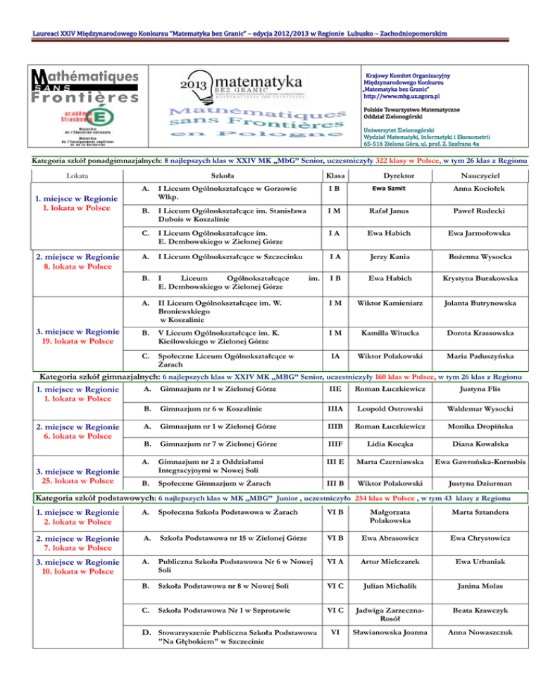 Laureaci XXIV Międzynarodowego Konkursu ”Matematyka bez Granic” – edycja 2012/2013 w Regionie Lubusko – Zachodniopomorskim Krajowy Komitet Organizacyjny Międzynarodowego Konkursu „Matematyka bez Granic” http://www.mbg.uz.zgora.pl Polskie Towarzystwo Matematyczne Oddział Zielonogórski Uniwersytet Zielonogórski Wydział Matematyki, Informatyki i Ekonometrii 65-516 Zielona Góra, ul. prof. Z. Szafrana 4a Kategoria szkół ponadgimnazjalnych: 8 najlepszych klas w XXIV MK „MbG” Senior, uczestniczyły 322 klasy w Polsce, w tym 26 klas z Regionu Lokata 1. miejsce w Regionie 1. lokata w Polsce 2. miejsce w Regionie 8. lokata w Polsce 3. miejsce w Regionie 19. lokata w Polsce Szkoła Klasa Dyrektor Nauczyciel A. I Liceum Ogólnokształcące w Gorzowie Wlkp. IB Ewa Szmit Anna Kociołek B. I Liceum Ogólnokształcące im. Stanisława Dubois w Koszalinie IM Rafał Janus Paweł Rudecki C. I Liceum Ogólnokształcące im. E. Dembowskiego w Zielonej Górze IA Ewa Habich Ewa Jarmołowska A. I Liceum Ogólnokształcące w Szczecinku IA Jerzy Kania Bożenna Wysocka B. I Liceum Ogólnokształcące E. Dembowskiego w Zielonej Górze IB Ewa Habich Krystyna Burakowska A. II Liceum Ogólnokształcące im. W. Broniewskiego w Koszalinie IM Wiktor Kamieniarz Jolanta Butrynowska B. V Liceum Ogólnokształcące im. K. Kieślowskiego w Zielonej Górze IM Kamilla Witucka Dorota Krassowska C. Społeczne Liceum Ogólnokształcące w Żarach IA Wiktor Polakowski Maria Paduszyńska im. Kategoria szkół gimnazjalnych: 6 najlepszych klas w XXIV MK „MBG” Senior, uczestniczyły 160 klas w Polsce, w tym 26 klas z Regionu 1. miejsce w Regionie 1. lokata w Polsce 2. miejsce w Regionie 6. lokata w Polsce 3. miejsce w Regionie 25. lokata w Polsce A. Gimnazjum nr 1 w Zielonej Górze IIE Roman Łuczkiewicz Justyna Flis B. Gimnazjum nr 6 w Koszalinie IIIA Leopold Ostrowski Waldemar Wysocki A. Gimnazjum nr 1 w Zielonej Górze IIIB Roman Łuczkiewicz Monika Dropińska B. Gimnazjum nr 7 w Zielonej Górze IIIF Lidia Kocąka Diana Kowalska A. Gimnazjum nr 2 z Oddziałami Integracyjnymi w Nowej Soli III E Marta Czerniawska Ewa Gawrońska-Kornobis B. Społeczne Gimnazjum w Żarach III B Wiktor Polakowski Justyna Dziurman Kategoria szkół podstawowych: 6 najlepszych klas w MK „MBG” Junior , uczestniczyło 254 klas w Polsce , w tym 43 klasy z Regionu 1. miejsce w Regionie 2. lokata w Polsce A. Społeczna Szkoła Podstawowa w Żarach VI B Małgorzata Polakowska Marta Sztandera 2. miejsce w Regionie 7. lokata w Polsce A. Szkoła Podstawowa nr 15 w Zielonej Górze VI B Ewa Abrasowicz Ewa Chrystowicz 3. miejsce w Regionie 10. lokata w Polsce A. Publiczna Szkoła Podstawowa Nr 6 w Nowej Soli VI A Artur Mielczarek Ewa Urbaniak B. Szkoła Podstawowa nr 8 w Nowej Soli VI C Julian Michalik Janina Molas C. Szkoła Podstawowa Nr 1 w Szprotawie VI C Jadwiga ZarzecznaRosół Beata Krawczyk VI Sławianowska Joanna Anna Nowaszczuk D. Stowarzyszenie Publiczna Szkoła Podstawowa "Na Głębokiem" w Szczecinie