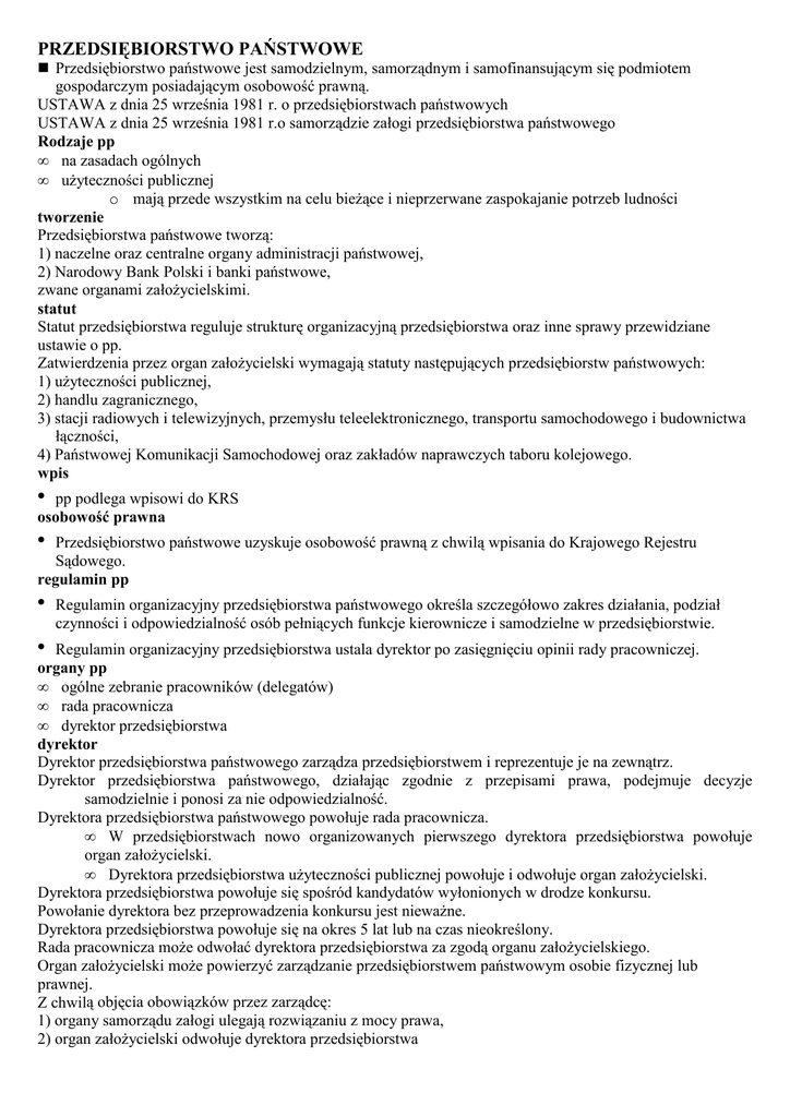 PRZEDSIĘBIORSTWO PAŃSTWOWE Przedsiębiorstwo państwowe jest samodzielnym, samorządnym i samofinansującym się podmiotem gospodarczym posiadającym osobowość prawną. USTAWA z dnia 25 września 1981 r. o przedsiębiorstwach państwowych USTAWA z dnia 25 września 1981 r.o samorządzie załogi przedsiębiorstwa państwowego Rodzaje pp • na zasadach ogólnych • użyteczności publicznej o mają przede wszystkim na celu bieżące i nieprzerwane zaspokajanie potrzeb ludności tworzenie Przedsiębiorstwa państwowe tworzą: 1) naczelne oraz centralne organy administracji państwowej, 2) Narodowy Bank Polski i banki państwowe, zwane organami założycielskimi. statut Statut przedsiębiorstwa reguluje strukturę organizacyjną przedsiębiorstwa oraz inne sprawy przewidziane ustawie o pp. Zatwierdzenia przez organ założycielski wymagają statuty następujących przedsiębiorstw państwowych: 1) użyteczności publicznej, 2) handlu zagranicznego, 3) stacji radiowych i telewizyjnych, przemysłu teleelektronicznego, transportu samochodowego i budownictwa łączności, 4) Państwowej Komunikacji Samochodowej oraz zakładów naprawczych taboru kolejowego. wpis • pp podlega wpisowi do KRS osobowość prawna • Przedsiębiorstwo państwowe uzyskuje osobowość prawną z chwilą wpisania do Krajowego Rejestru Sądowego. regulamin pp • Regulamin organizacyjny przedsiębiorstwa państwowego określa szczegółowo zakres działania, podział czynności i odpowiedzialność osób pełniących funkcje kierownicze i samodzielne w przedsiębiorstwie. • Regulamin organizacyjny przedsiębiorstwa ustala dyrektor po zasięgnięciu opinii rady pracowniczej. organy pp • ogólne zebranie pracowników (delegatów) • rada pracownicza • dyrektor przedsiębiorstwa dyrektor Dyrektor przedsiębiorstwa państwowego zarządza przedsiębiorstwem i reprezentuje je na zewnątrz. Dyrektor przedsiębiorstwa państwowego, działając zgodnie z przepisami prawa, podejmuje decyzje samodzielnie i ponosi za nie odpowiedzialność. Dyrektora przedsiębiorstwa państwowego powołuje rada pracownicza. • W przedsiębiorstwach nowo organizowanych pierwszego dyrektora przedsiębiorstwa powołuje organ założycielski. • Dyrektora przedsiębiorstwa użyteczności publicznej powołuje i odwołuje organ założycielski. Dyrektora przedsiębiorstwa powołuje się spośród kandydatów wyłonionych w drodze konkursu. Powołanie dyrektora bez przeprowadzenia konkursu jest nieważne. Dyrektora przedsiębiorstwa powołuje się na okres 5 lat lub na czas nieokreślony. Rada pracownicza może odwołać dyrektora przedsiębiorstwa za zgodą organu założycielskiego. Organ założycielski może powierzyć zarządzanie przedsiębiorstwem państwowym osobie fizycznej lub prawnej. Z chwilą objęcia obowiązków przez zarządcę: 1) organy samorządu załogi ulegają rozwiązaniu z mocy prawa, 2) organ założycielski odwołuje dyrektora przedsiębiorstwa ogólne zebranie pracowników • • Prawo udziału w ogólnym zebraniu przysługuje wszystkim pracownikom przedsiębiorstwa. • Uchwały ogólnego zebrania pracowników (delegatów) podjęte w wymienionych sprawach są wiążące dla dyrektora i rady pracowniczej. • • posiedzenie min. 2 razy w roku W przedsiębiorstwach, w których liczba zatrudnionych przekracza trzysta osób, pracownicy uczestniczą w ogólnym zebraniu za pośrednictwem swych delegatów, których wybierają na okres dwóch lat. Uchwały w sprawie: - przyjęcia statutu przedsiębiorstwa (na wniosek dyrektora), - podziału zysku przeznaczonego dla załogi, - rocznej oceny działalności rady pracowniczej i dyrektora, - przyjęcia wieloletnich planów przedsiębiorstwa, - przyjęcia statutu samorządu załogi przedsiębiorstwa, - wyrażania opinii we wszelkich sprawach dotyczących przedsiębiorstwa. rada pracownicza zwołuje zebranie , gdy wniosek podpisała 1/5 pracowników rada pracownicza • W skład rady pracowniczej wchodzi piętnastu członków, o ile statut samorządu załogi nie stanowi inaczej. – Wewnętrznym organem rady jest prezydium. – Rada pracownicza może również powoływać ze swego grona komisje i zespoły. kompetencje: - powoływanie i odwoływanie dyrektora przedsiębiorstwa i innych osób wykonujących kierownicze funkcje w przedsiębiorstwie, - podejmowanie uchwał w sprawie podziału i zasad wykorzystania dochodu netto przedsiębiorstwa, - uchwalanie oraz zmiana rocznego planu przedsiębiorstwa, - podejmowanie uchwał w sprawie inwestycji, - wyrażanie zgody na udział przedsiębiorstwa w spółkach prawa handlowego, - podejmowanie uchwał w sprawie łączenia i podziału przedsiębiorstwa, - wyrażanie zgody na zbywanie niektórych środków trwałych i dokonywanie darowizn. • nie wolno jej mylić z radą pracowników – rodzajem organu reprezentacji pracowniczej ustanowionego przez ustawę z dnia 7 kwietnia 2006 r. o informowaniu pracowników i przeprowadzaniu z nimi konsultacji – rady pracowników powinny być tworzone u pracodawców, którzy prowadzą działalność gospodarczą i zatrudniają co najmniej 50 pracowników, mienie • Organ założycielski wyposaża przedsiębiorstwo w środki niezbędne do prowadzenia działalności określonej w akcie prawnym o jego utworzeniu. obrót • Przedsiębiorstwo państwowe występuje w obrocie we własnym imieniu i na własny rachunek. działalność Przedsiębiorstwo prowadzi działalność na zasadach racjonalnej gospodarki, samofinansowania oraz rachunku ekonomicznego. Przedsiębiorstwo prowadzi rzetelną rachunkowość oraz sporządza na jej podstawie bilans. • Bilans przedsiębiorstwa podlega weryfikacji przez państwowe organy kontroli na zasadach określonych w przepisach szczególnych. nadzór Organ założycielski dokonuje kontroli i oceny działalności przedsiębiorstwa oraz pracy dyrektora. Organ założycielski, w razie stwierdzenia, że decyzja dyrektora jest sprzeczna z prawem, wstrzymuje jej wykonani
