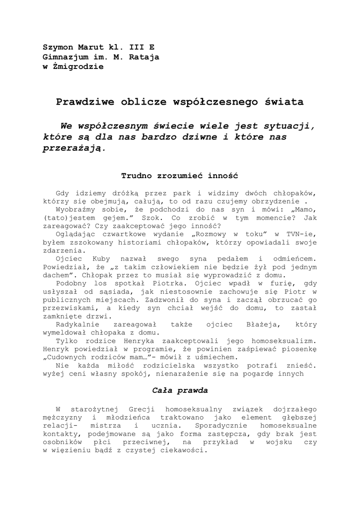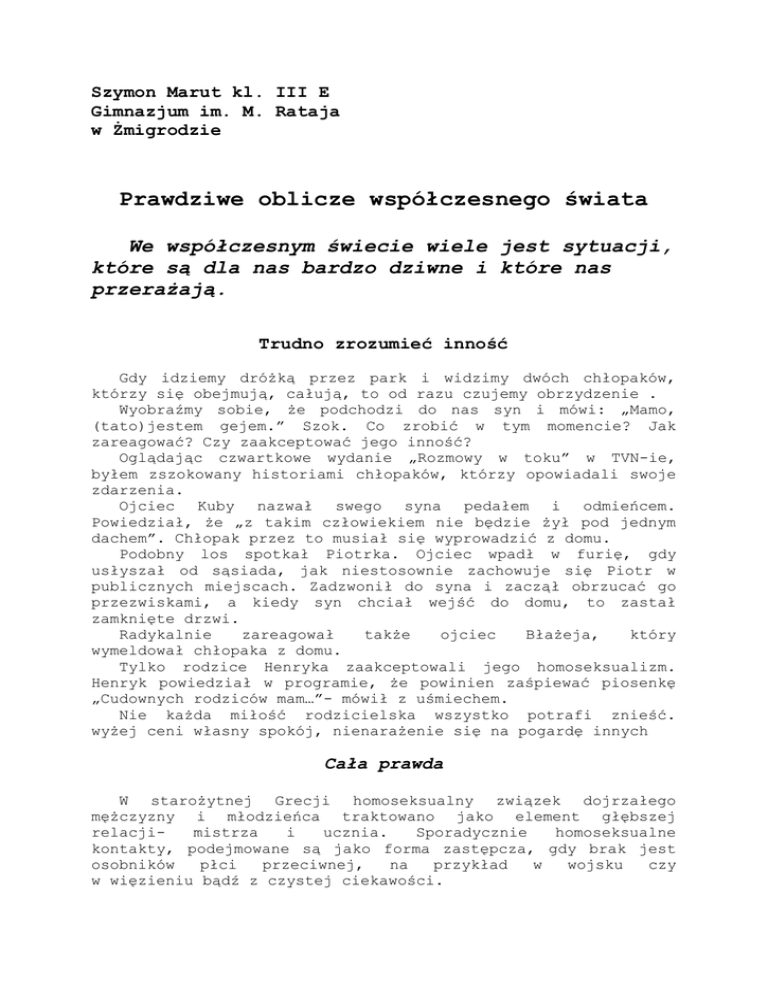 Szymon Marut kl. III E Gimnazjum im. M. Rataja w Żmigrodzie Prawdziwe oblicze współczesnego świata We współczesnym świecie wiele jest sytuacji, które są dla nas bardzo dziwne i które nas przerażają. Trudno zrozumieć inność Gdy idziemy dróżką przez park i widzimy dwóch chłopaków, którzy się obejmują, całują, to od razu czujemy obrzydzenie . Wyobraźmy sobie, że podchodzi do nas syn i mówi: „Mamo, (tato)jestem gejem.” Szok. Co zrobić w tym momencie? Jak zareagować? Czy zaakceptować jego inność? Oglądając czwartkowe wydanie „Rozmowy w toku” w TVN-ie, byłem zszokowany historiami chłopaków, którzy opowiadali swoje zdarzenia. Ojciec Kuby nazwał swego syna pedałem i odmieńcem. Powiedział, że „z takim człowiekiem nie będzie żył pod jednym dachem”. Chłopak przez to musiał się wyprowadzić z domu. Podobny los spotkał Piotrka. Ojciec wpadł w furię, gdy usłyszał od sąsiada, jak niestosownie zachowuje się Piotr w publicznych miejscach. Zadzwonił do syna i zaczął obrzucać go przezwiskami, a kiedy syn chciał wejść do domu, to zastał zamknięte drzwi. Radykalnie zareagował także ojciec Błażeja, który wymeldował chłopaka z domu. Tylko rodzice Henryka zaakceptowali jego homoseksualizm. Henryk powiedział w programie, że powinien zaśpiewać piosenkę „Cudownych rodziców mam…”- mówił z uśmiechem. Nie każda miłość rodzicielska wszystko potrafi znieść. wyżej ceni własny spokój, nienarażenie się na pogardę innych Cała prawda W starożytnej Grecji homoseksualny związek dojrzałego mężczyzny i młodzieńca traktowano jako element głębszej relacjimistrza i ucznia. Sporadycznie homoseksualne kontakty, podejmowane są jako forma zastępcza, gdy brak jest osobników płci przeciwnej, na przykład w wojsku czy w więzieniu bądź z czystej ciekawości. Badania przeprowadzone wśród studentów w USA wskazują, że tego typu kontakty miało 19,4% studentów i 8,2% studentek. Homoseksualizm kobiet zdecydowanie mniej rzuca się w oczy. Tulenie się, chodzenie za rękę czy wspólne zamieszkiwanie uważane są za mieszczące się w konwencji przyjaźni, koleżeństwa. Prawo i medycyna uznają homoseksualizm za pełnoprawną orientację seksualną. Większość ludzi z kolei sądzi, że to choroba. Są terapie ukierunkowane na zmianę orientacji seksualnej. Gros specjalistów twierdzi jednak, że takie leczenie powoduje jedynie stłumienie lub wyparcie prawdziwych potrzeb. Teoretycznie homoseksualizm jest akceptowany. Praktycznie wygląda to inaczej. Tolerancja wobec gejów i lesbijek istnieje dopóty, dopóki funkcjonują oni na obrzeżach społeczeństwa i na co dzień ich nie widać. Tymczasem coraz liczniejsze są organizacje skupiające homoseksualistów. Istnieją kraje, w których ustawodawstwo umożliwia zawieranie małżeństw między osobami tej samej płci. Geje to też ludzie i uczucia też mają. Czasami nie wytrzymują presji otoczenia , w jakim się znajdują. Tracą przez to poczucie bezpieczeństwa i decydują się na zmianę środowiska. Niejednokrotnie kryją się ze swoimi potrzebami, nie chcąc się narazić na wytykanie palcami. Kogo stać na odwagę? Są ludzie znani, którzy przerwali tajemnicę milczenia – przestali ukrywać swoją „odmienność”. Przykładem może być Tomasz Raczek, który nie wstydzi się swojej orientacji: „Tak, jestem gejem. Nie mam zamiaru udawać, że to nieprawda”mówi Faktowi uznany krytyk filmowy i publicysta. „Nie zamierzam robić z tego tajemnicy, ani udawać kogoś innego”- dodaje. Raczek nie jest pierwszą osobą w Polsce, która publicznie przyznała się, że jest homoseksualistą. Jacek Poniedziałek powiedział na łamach pisma Faktu: „Mam już 40 lat. Nie będę się wygłupiał i bredził coś o idealnej kobiecie, której wciąż szukam. Jestem gejem i tyle”. Zbigniew Wodecki, kompozytor i muzyk tak wyraża się w tej kwestii: „Powinno się mówić o tym otwarcie. Jeżeli ktoś się taki urodził, to znaczy, że tak Bóg chciał. I koniec. Są ważniejsze sprawy- trzeba być kulturalnym, uczyć się, być dobrym człowiekiem, a to, jaką ktoś ma orientację seksualną, to zupełnie inna sprawa. Ja jestem tolerancyjny. Wszyscy powinni tacy być.” Przecież „Żyjemy w demokratycznym, wolnym kraju, gdzie każdy człowiek powinien być równy(…)” (Tadeusz Cymański poseł PiS-u). Często się jednak zastanawiam, czy faktycznie żyjemy w wolnym kraju, czy nie ograniczamy wolności innych ludzi… Gdzie nasza tolerancja?