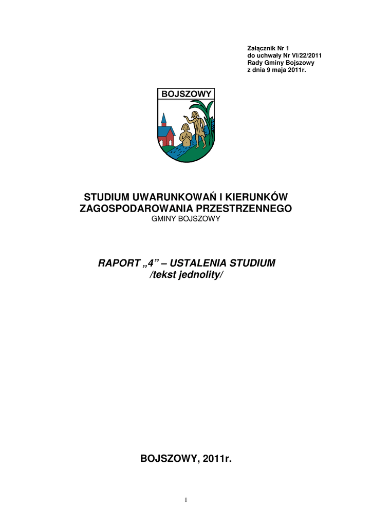 Załącznik Nr 1 do uchwały Nr VI/22/2011 Rady Gminy Bojszowy z dnia 9 maja 2011r. STUDIUM UWARUNKOWAŃ I KIERUNKÓW ZAGOSPODAROWANIA PRZESTRZENNEGO GMINY BOJSZOWY RAPORT „4” – USTALENIA STUDIUM /tekst jednolity/ BOJSZOWY, 2011r. 1 Podstawę formalną prac nad „Studium uwarunkowań i kierunków zagospodarowania przestrzennego gminy Bojszowy", stanowią: – Uchwała Rady Gminy Bojszowy z dnia 23 marca 1998 roku Nr XLIII/178/98, w sprawie przystąpienia do sporządzenia „Studium uwarunkowań i kierunków zagospodarowania przestrzennego gminy Bojszowy”. – Umowa Nr TP/171/98 z dnia 15 czerwca 1998r roku zawarta pomiędzy Zarządem Gminy Bojszowy a Przedsiębiorstwem Projektowania, Studiów, Usług i Realizacji „TERPLAN” Sp. z o.o. z Katowic. Zgodnie z załącznikiem Nr 1 do wlw umowy prace nad „Studium uwarunkowań i kierunków zagospodarowania przestrzennego gminy Bojszowy” podzielono na poszczególne etapy: – – – – – ETAP „0" – Prace wstępne. ETAP „1" – Ocena sytuacji zewnętrznej i wewnętrznej gminy. ETAP „2" – Projekt ustaleń studium. ETAP „3" – Opiniowanie projektu Studium. ETAP „4” – Korekta projektu ustaleń Studium po opiniowaniu przygotowanie do uchwalenia. i Każdy etap opracowania zakończony został raportem przedstawiającym wyniki prac. Raporty były poddawane akceptacji Zarządu Rady Gminy. RAPORT „0" – PRACE WSTĘPNE z 30 lipca 1998 roku zawierał informacje dotyczące wdrażania procesu uspołecznienia Studium oraz zbioru materiałów wejściowych do Studium, ich kompletności i kompleksowości. W porozumieniu z przedstawicielami Urzędu Gminy Bojszowy przyjęto, że prace projektowe nad „Studium uwarunkowań i kierunków zagospodarowania przestrzennego gminy Bojszowy”, prowadzone będą na zasadzie uspołecznienia procesu jego sporządzania. Zasadniczymi celami takiego sposobu opracowania Studium były: – Ustalenie optymalnych rozwiązań rozwoju gminy. – Uzyskanie społecznej akceptacji dla proponowanych celów i kierunków rozwoju. – Pobudzenie lokalnych inicjatyw i uczestnictwa w realizacji proponowanych kierunków zagospodarowania przestrzennego. Dla wdrożenia uspołecznionego procesu sporządzenia Studium dokonano: – Obwieszczenia w prasie i na tablicach ogłoszeń o przystąpieniu do opracowania „Studium uwarunkowań i kierunków zagospodarowania przestrzennego gminy Bojszowy: – Zawiadomienia Wojewody, Sejmiku Samorządowego oraz Zarządów Gmin sąsiednich. – Zawiadomienia instytucji gospodarczych, technicznych, kulturotwórczych itp. RAPORT „1" – OCENA SYTUACJI ZEWNĘTRZNEJ 1 WEWNĘTRZNEJ gminy z 5 listopada 1998r. zawierał wyniki analiz przeprowadzonych przez zespół autorski w następujących obszarach problemowych: – – – – Demografia. Jakość życia mieszkańców. Środowisko przyrodnicze. Przeznaczenie, zagospodarowanie i uzbrojenie terenów. Całość analiz zakończono zbiorczą listą uwarunkowań rozwoju gminy. Do raportu dołączono załączniki zawierające: – Ważniejsze informacje o dzielnicach mieszkaniowych. 2 – Dokumentację fotograficzną. Integralną częścią Raportu „1” stanowiły plansze w skali 1:10.000: – – – – Użytkowanie terenów. Zaopatrzenie w wodę. Odprowadzenie ścieków. Elektroenergetyka. Telekomunikacja. Uwarunkowania. Raport „1” po uzupełnieniu o propozycje i uwagi Zarządu Gminy uzyskał pozytywną opinię (pismo z dnia 16.12.1998r. Nr UGANB 73200/44/98). RAPORT „2" - PROJEKT USTALEŃ STUDIUM został opracowany na podstawie: – Wstępnych uzgodnień autorów z Zarządem Gminy dotyczących wyboru kierunku rozwoju gminy, celów rozwoju i kierunków zagospodarowania przestrzennego (Pismo Zarządu Gminy z 16.12.1998r. Nr UGANB 73200/44/98). – Przeprowadzonej oceny sytuacji zewnętrznej i wewnętrznej zawartej w Raporcie „1 ". – Zaleceń i wskazań ze „Studium zagospodarowania przestrzennego województwa katowickiego" zawartych w piśmie Wojewody Katowickiego z 24 stycznia 1998r. Nr Ar. m/1-4/7322/6-12/98. Raport „2" zawierał następujące części: – Elementy strategii rozwoju gminy. – Strategię przestrzenna. – System obsługi mieszkańców w zakresie usług publicznych i mieszkalnictwa. Oraz załącznik: – Lista proponowanych publicznych przedsięwzięć inwestycyjnych. Integralną częścią raportu „2" była plansza w skali 1:10.000: – Ustalenia Studium. RAPORT „3" – USTALENIA STUDIUM (PROJEKT) z marca 1999r. został opracowany po wniesieniu uwag Zarządu Gminy do raportu „2”. Raport „3” zawierał następujące części: – Elementy strategii rozwoju gminy. – Strategię przestrzenni. – System obsługi mieszkańców w zakresie usług publicznych i mieszkalnictwa. Oraz załączniki: – – – – Lista proponowanych publicznych przedsięwzięć inwestycyjnych. Wytyczne konserwatorskie. Uchwały w sprawie organizacji szkolnictwa. Wykaz drzew kwalifikujących się do ochrony. Integralną częścią Raportu „2" były plansze w skali 1:10.000: – Ustalenia Studium nr 1 – Strategia przestrzenna. – Ustalenia Studium nr 2. Zaopatrzenie w wodę. Odprowadzenie ścieków. – Ustalenia Studium nr 3. Elektroenergetyka. Telekomunikacja. 3 Raport „3" poddano opiniowaniu zgodnie z art. 6 ust. 3 ustawy z dnia 7 lipca 1994r. o zagospodarowaniu przestrzennym (tekst jednolity – Dz.U. Nr 15, poz. 139 z 1999r.) w okresie od 13.07.1999r. do 05.08.1999r. DOKUMENTY FORMALNO – PRAWNE przekazano Zarządowi Gminy dnia 15 listopada 1999r. Zawierały wyniki ustawowego opiniowania projektu Studium. RAPORT „4" – USTALENIA STUDIUM z kwietnia 2000r. został sporządzony w oparciu o pismo Wójta Gminy Bojszowy z dnia 08.02.2000r. Nr UG-ANB. 73200/4/2000 zawierające uwagi do Raportu „3”. Raport „4” składa się z następujących części: – Ustalenia Studium (elaborat). – Projekt uchwały Rady Gminy. – Plansze w skali 1:10.000: Ustalenia Studium nr 1 – Strategia przestrzen