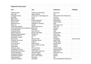 Żuławski 2012 lista utworów Publikacja Autor Tytuł Wydawnictwo Adamiak Sylwia Akab Alan Andrzejak Karolina Bąk Rafał Bełda Adam Błotny Jarosław Bojarski Piotr Borkowska Anna Bujak J.D. Cherezińska Elżbieta Chichowlas Robert, Kyrcz Kazimierz jr Cichowlas Robert Ciszewski Marcin Dębski Eugeniusz Degórska Izabela Marzena Domagalski Dariusz Drogokupiec Tomasz Dukaj Jacek Falandysz Anna Irena Foryś Robert Fronczak Hanna Fuchs Jacek Gajak Marta Góralczyk Jakub Gorgolewska Anna M. Grabowska-Grzyb Ałbena Grzelak Agnieszka Guziakiewicz Edward Guziakiewicz Edward Hałas Agnieszka Jagielnicka Stefania Tajemnica Czarnej Róży Więzień Układu Castus Ignis i nawiedzający sny Ab ovo Edgar Purpura imperatora Kryptonim Posen Szantopierz i archanioł Spadek Pasja według Einara Efemeryda Szósta era www.ru2012.pl Russian Impossible Pamięć krwi Cherem 36 Science Fiction Królewskie ogrody Sztejer II Podróż do tyłu Świat, którego nie znasz Nocni The Czart Show Na granicy snu Julek i Maja w labiryncie Tajemnica Skyle Hurysy z katalogu Obcy z Alfa Centauri Dwie karty Samobójcy Novae Res Ifryt Warszawska Firma Wydawnicza Varsovia Novae Res Fabryka Słów Media Rodzina Znak Prószyński i S-ka Zysk i S-ka Oficynka Replika Znak Fabryka Słów Zysk i S-ka Fabryka Słów Radwan Powergraph Science Fiction Akapit Press Fabryka Słów Fabryka Słów Radwan Radwan Verbum Nobile Papierowy Motyl Akapit Press Prószyński i S-ka Dreams Dreams Ifryt Ludowa Spółdzielnia Wydawnicza Jupowicz-Ginalska Anna Kaczyńska Barbara Koniuk Paulina Kosik Rafał Kosik Rafał Kossak Sebastian Kossakowska Maja Lidia Krauzowicz-Tarczoń Joanna Kumor Agnieszka Lalak Dominik Lewandowski Konrad T. Lewandowski Konrad T. Magdoń Adam Małecki Jakub Małecki Jakub Maleszka Andrzej Matuszek Paweł Miszczuk Katarzyna Berenika Molenda Natalia Mortka Marcin Obuchowski Marcin Pągowski Marcin Piekara Jacek Pilipiuk Andrzej Piskorski Krzysztof Protasiuk Michał Przechrzta Adam Raduchowska Martyna Rogoża Piotr Rowicki Piotr Salik Magdalena Sawicki Andrzej W. Skórska Joanna Sokalska Anna Solanin Michał Solanin Michał Dobrymi intencjami to piekło brukują Udawanki Sztylet krwistej władczyni Felix, Net i Nika oraz Bunt Maszyn Felix, Net i Nika oraz Świat Zero Monster Grillbar Galaktyka Tajemnica Talizman z jeziora Płomienie Lucyfera Anioły muszą odejść Diabłu ogarek. Czarna wierzba Wojny mroku Dżozef W odbiciu Magiczne drzewo. Olbrzym Kamienna Ćma Ja, anielica Anarion Martwe Jezioro Zakochany samuraj. Mistrz Yuan Zima mej duszy Ja, inkwizytor. Bicz boży Oko jelenia. Sfera Armilarna Krawędź czasu Święto rewolucji Demony Leningradu Szamanka od umarlaków Klemens i Kapitan Zło Wszystko przez Amandę Runy Hordów Nadzieja czerwona jak śnieg Dwie dusze Potomstwo Księżyca Strażniczka Zastępu Szaman z Port Royal Esensja Sa Dragonera Novae Res Powergraph Powergraph Warszawska Firma Wydawnicza Fabryka Słów Novae Res G+J Poligraf G+J RM Videograf II W.A.B. Powergraph Znak Mag W.A.B. Novae Res Fabryka Słów Radwan Fabryka Słów Fabryka Słów Fabryka Słów Runa Wydawnictwo Literackie Fabryka Słów Fabryka Słów Powergraph W.A.B. Runa Runa Warszawska Firma Wydawnicza Atut Tryton Tryton Esensja 8-10 (e-book) Strachota Łukasz Szczurek-Maksymiuk Edyta Szczygielski Marcin Szerenos Marcin Szostak Wit Tuchorski Andrzej Tuchorski Andrzej Uznański Sebastian Wełnicki Marcin Wieczorek Dorota Wolski Marcin Wolski Marcin Żak Andrzej Zawada Anna D. Zelman L.H. Zelman L.H. Zembaty Wojciech Ziejewska Malina Żulczyk Jakub Żulczyk Jakub Żytowiecki Maciej Zakłady nowego człowieka Miriada Czarny Młyn Podstęp Dumanowski Rezydent wieży. Księga I Rezydent wieży. Księga II Herrenvolk Testament Damoklesa Dotyk mroku Doktor Styks Ewangelia według Heroda Gwiazda Zero Livria. Kraina artystów Bezsenność anioła Tożsamość anioła Koniec pieśni Słowiańska przygoda wakacyjna Świątynia Zmorojewo Mój prywatny demon Lampa i Iskra Boża Novae Res Stentor Pisze się Lampa i Iskra Boża Prószyński i S-ka Prószyński i S-ka FOX Publishing Runa Zielona Sowa Zysk i S-ka Wydawnictwo M Akapit Press Poligraf Nasza Księgarnia Nasza Księgarnia Znak Poligraf Nasza Księgarnia Nasza Księgarnia Ifryt