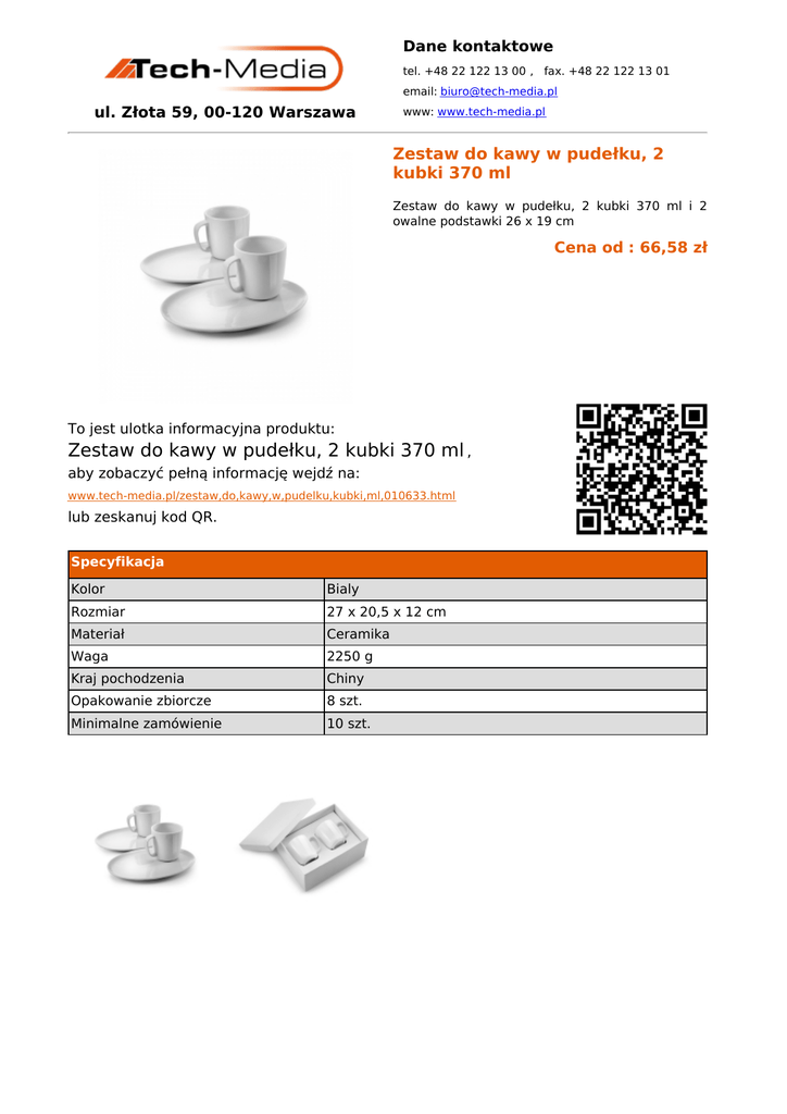 Dane kontaktowe tel. +48 22 122 13 00 , fax. +48 22 122 13 01 email: [email protected] ul. Złota 59, 00-120 Warszawa www: www.tech-media.pl Zestaw do kawy w pudełku, 2 kubki 370 ml Zestaw do kawy w pudełku, 2 kubki 370 ml i 2 owalne podstawki 26 x 19 cm Cena od : 66,58 zł To jest ulotka informacyjna produktu: Zestaw do kawy w pudełku, 2 kubki 370 ml , aby zobaczyć pełną informację wejdź na: www.tech-media.pl/zestaw,do,kawy,w,pudelku,kubki,ml,010633.html lub zeskanuj kod QR. Specyfikacja Kolor Bialy Rozmiar 27 x 20,5 x 12 cm Materiał Ceramika Waga 2250 g Kraj pochodzenia Chiny Opakowanie zbiorcze 8 szt. Minimalne zamówienie 10 szt.