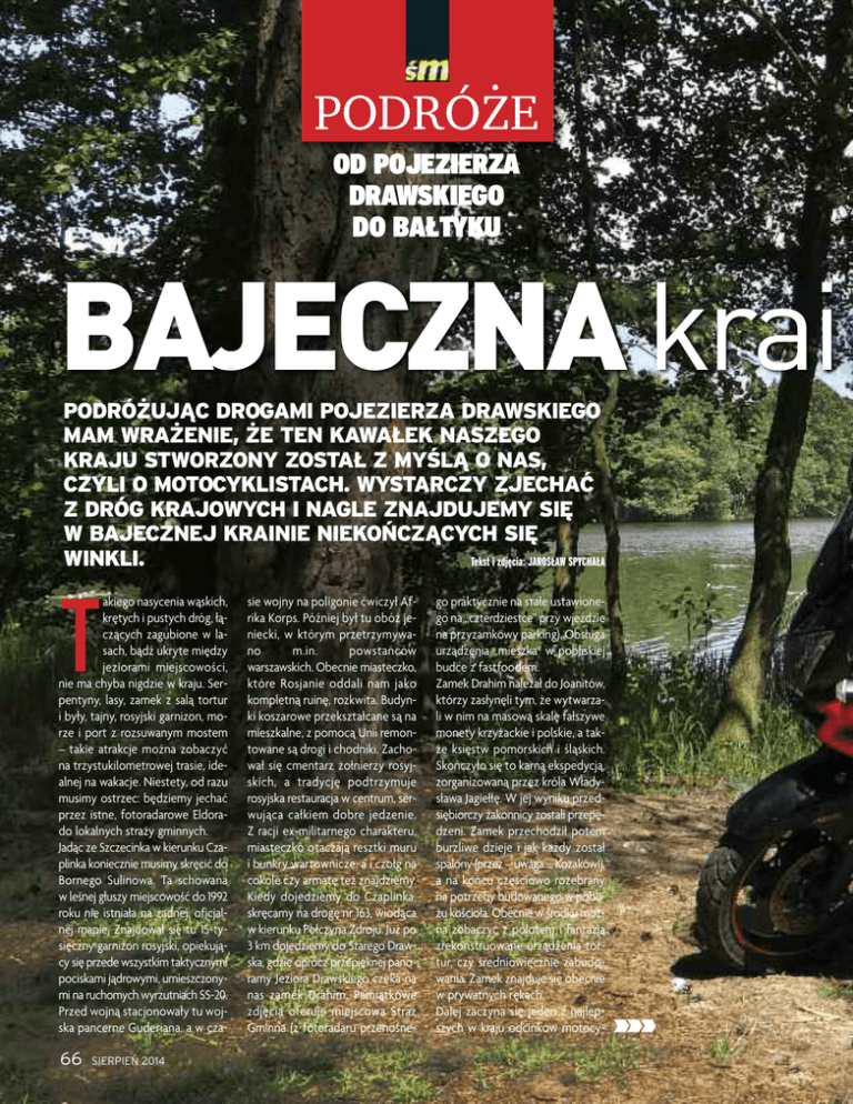 PODRÓŻE OD POJEZIERZA DRAWSKIEGO DO BAŁTYKU BAJECZNA krai PODRÓŻUJĄC DROGAMI POJEZIERZA DRAWSKIEGO MAM WRAŻENIE, ŻE TEN KAWAŁEK NASZEGO KRAJU STWORZONY ZOSTAŁ Z MYŚLĄ O NAS, CZYLI O MOTOCYKLISTACH. WYSTARCZY ZJECHAĆ Z DRÓG KRAJOWYCH I NAGLE ZNAJDUJEMY SIĘ W BAJECZNEJ KRAINIE NIEKOŃCZĄCYCH SIĘ WINKLI. Tekst i zdjęcia: JAROSŁAW SPYCHAŁA akiego nasycenia wąskich, krętych i pustych dróg, łączących zagubione w lasach, bądź ukryte między jeziorami miejscowości, nie ma chyba nigdzie w kraju. Serpentyny, lasy, zamek z salą tortur i były, tajny, rosyjski garnizon, morze i port z rozsuwanym mostem – takie atrakcje można zobaczyć na trzystukilometrowej trasie, idealnej na wakacje. Niestety, od razu musimy ostrzec: będziemy jechać przez istne, fotoradarowe Eldorado lokalnych straży gminnych. Jadąc ze Szczecinka w kierunku Czaplinka koniecznie musimy skręcić do Bornego Sulinowa. Ta schowana w leśnej głuszy miejscowość do 1992 roku nie istniała na żadnej, oficjalnej mapie. Znajdował się tu 15-tysięczny garnizon rosyjski, opiekujący się przede wszystkim taktycznymi pociskami jądrowymi, umieszczonymi na ruchomych wyrzutniach SS-20. Przed wojną stacjonowały tu wojska pancerne Guderiana, a w cza- T 66 SIERPIEŃ 2014 sie wojny na poligonie ćwiczył Afrika Korps. Później był tu obóz jeniecki, w którym przetrzymywano m.in. powstańców warszawskich. Obecnie miasteczko, które Rosjanie oddali nam jako kompletną ruinę, rozkwita. Budynki koszarowe przekształcane są na mieszkalne, z pomocą Unii remontowane są drogi i chodniki. Zachował się cmentarz żołnierzy rosyjskich, a tradycję podtrzymuje rosyjska restauracja w centrum, serwująca całkiem dobre jedzenie. Z racji ex-militarnego charakteru, miasteczko otaczają resztki muru i bunkry wartownicze, a i czołg na cokole czy armatę też znajdziemy. Kiedy dojedziemy do Czaplinka, skręcamy na drogę nr 163, wiodąca w kierunku Połczyna Zdroju. Już po 3 km dojedziemy do Starego Drawska, gdzie oprócz przepięknej panoramy Jeziora Drawskiego czeka na nas zamek Drahim. Pamiątkowe zdjęcia oferuje miejscowa Straż Gminna (z fotoradaru przenośne- go praktycznie na stałe ustawionego na „czterdziestce” przy wjeździe na przyzamkowy parking). Obsługa urządzenia „mieszka” w pobliskiej budce z fastfoodem. Zamek Drahim należał do Joanitów, którzy zasłynęli tym, że wytwarzali w nim na masową skalę fałszywe monety krzyżackie i polskie, a także księstw pomorskich i śląskich. Skończyło się to karną ekspedycją, zorganizowaną przez króla Władysława Jagiełłę. W jej wyniku przedsiębiorczy zakonnicy zostali przepędzeni. Zamek przechodził potem burzliwe dzieje i jak każdy został spalony (przez – uwaga…. Kozaków!), a na końcu częściowo rozebrany na potrzeby budowanego w pobliżu kościoła. Obecnie w środku można zobaczyć z polotem i fantazją zrekonstruowane urządzenia tortur, czy średniowiecznie zabudowania. Zamek znajduje się obecnie w prywatnych rękach. Dalej zaczyna się jeden z najlepszych w kraju odcinków motocy- na winkli 1. SZCZECINEK – 24 KM – 2. BORNE SULINOWO – 29 KM – 3 STARE DRAWSKO – 90 KM – 4. MIELNO – 47 KM – 5. DARŁÓWEK – 106 KM – 6. SZCZECINEK Jezioro Drawskie jest drugim pod względem głębokości jeziorem w Polsce. Gruntu pod nogami możesz szukać 80 metrów poniżej lustra wody. WWW.SWIATMOTOCYKLI.PL I SIERPIEŃ 2014 67 PODRÓŻE Od Pojezierza Drawskiego do Bałtyku klowych, czyli połczyńskie zakręty na drodze nr 163, wiodące między jeziorami aż do Połczyna Zdroju. Ta fantastyczna droga jest sama w sobie warta przyjechania tutaj. Każdy, kto raz ją przejechał, chce jechać nią jeszcze raz i jeszcze raz… Obojętne – motocyklem czy samochodem. Jadąc dalej na północ przez Białogard, na skróty omijając Koszalin, bardzo, ale to bardzo dziurawymi drogami wpadamy do Mielna. Tu proponuję udać się do rybackiego portu mniej więcej w połowie tej miejscowości. Można coś zjeść i nabyć np. świeżo wędzone ryby. Kierując się drogą wiodącą groblą miedzy morzem a jeziorem Jamno, dojedziemy do prawie pustych plaż między Unieściem i Łazami. Dalej, wyremontowaną właśnie drogą nr 203 dojedziemy do Darłowa (gdzie urodził się, a po burzliwym życiu zmarł i został pochowany król Eryk I, rządzący na początku XV wieku Danią, Szwecją i Norwegią), a potem do Darłówka. Warto tutaj zrobić sobie dłuższą przerwę. Miasteczko ma uroczy BORNE SULINOWO Borne Sulinowo to – co nie dziwne – miejsce, gdzie spotykają się miłośnicy pojazdów militarnych. Zlot o nazwie „Gąsienice i Podkowy” w tym roku odbędzie się w dniach 14-17 sierpnia. W jego czasie można będzie podziwiać przejazdy sprzętu po „Tankodromie”, zobaczyć grupy rekonstrukcyjne, posłuchać koncertów (gwiazda jednego z wieczorów – Acid Drinkers) i uczestniczyć w wielu innych atrakcjach. Pełny program na: www.zlot.bornesulinowo.pl/letni. 68 SIERPIEŃ 2014 port, z którego można zrobić sobie wycieczkę morską, ba – nawet na Bornholm czy też – dla miłośników wędkarstwa – na okoliczne łowiska. Darłówek słynie też z rozsuwanego mostu, otwieranego, kiedy do portu wpływa coś większego od kajaka. Mamy tutaj skromną, ale z piękną panoramą latarnię morską oraz możliwość przejścia się falochronem aż do główek portu. No i nie da się ukryć, że okoliczne smażalnie wręcz kuszą świeżymi rybkami. Syci widoków wpływających i wypływających z portu statków i kutrów wsiadamy na motocykle i kierujemy się w kierunku Sławna, a stamtąd drogą 205 do Bobolic. Ten odcinek również zaoferuje miejscami wręcz świetne zakręty, ale przede wszystkim to trasa przez lasy, pustą drogą. Pod Bobolicami należy bardzo uważać. To czterotysięczne miasteczko na skrzyżowaniu dróg krajowych wręcz żyje z przemyślnie ustawianych fotoradarów (straż ma tu pięć urządz