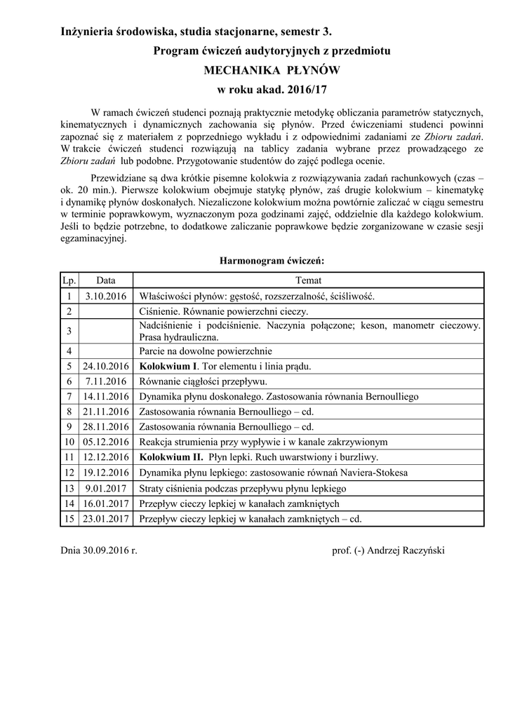 Inżynieria środowiska, studia stacjonarne, semestr 3. Program ćwiczeń audytoryjnych z przedmiotu MECHANIKA PŁYNÓW w roku akad. 2016/17 W ramach ćwiczeń studenci poznają praktycznie metodykę obliczania parametrów statycznych, kinematycznych i dynamicznych zachowania się płynów. Przed ćwiczeniami studenci powinni zapoznać się z materiałem z poprzedniego wykładu i z odpowiednimi zadaniami ze Zbioru zadań. W trakcie ćwiczeń studenci rozwiązują na tablicy zadania wybrane przez prowadzącego ze Zbioru zadań lub podobne. Przygotowanie studentów do zajęć podlega ocenie. Przewidziane są dwa krótkie pisemne kolokwia z rozwiązywania zadań rachunkowych (czas – ok. 20 min.). Pierwsze kolokwium obejmuje statykę płynów, zaś drugie kolokwium – kinematykę i dynamikę płynów doskonałych. Niezaliczone kolokwium można powtórnie zaliczać w ciągu semestru w terminie poprawkowym, wyznaczonym poza godzinami zajęć, oddzielnie dla każdego kolokwium. Jeśli to będzie potrzebne, to dodatkowe zaliczanie poprawkowe będzie zorganizowane w czasie sesji egzaminacyjnej. Harmonogram ćwiczeń: Lp. Data Temat Właściwości płynów: gęstość, rozszerzalność, ściśliwość. Ciśnienie. Równanie powierzchni cieczy. Nadciśnienie i podciśnienie. Naczynia połączone; keson, manometr cieczowy. 3 Prasa hydrauliczna. 4 Parcie na dowolne powierzchnie 5 24.10.2016 Kolokwium I. Tor elementu i linia prądu. 6 7.11.2016 Równanie ciągłości przepływu. 7 14.11.2016 Dynamika płynu doskonałego. Zastosowania równania Bernoulliego 8 21.11.2016 Zastosowania równania Bernoulliego – cd. 9 28.11.2016 Zastosowania równania Bernoulliego – cd. 10 05.12.2016 Reakcja strumienia przy wypływie i w kanale zakrzywionym 11 12.12.2016 Kolokwium II. Płyn lepki. Ruch uwarstwiony i burzliwy. 1 2 3.10.2016 12 19.12.2016 Dynamika płynu lepkiego: zastosowanie równań Naviera-Stokesa 13 9.01.2017 Straty ciśnienia podczas przepływu płynu lepkiego 14 16.01.2017 Przepływ cieczy lepkiej w kanałach zamkniętych 15 23.01.2017 Przepływ cieczy lepkiej w kanałach zamkniętych – cd. Dnia 30.09.2016 r. prof. (-) Andrzej Raczyński