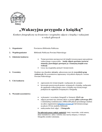 „Wakacyjna przygoda z książką” Konkurs fotograficzny na kreatywne i oryginalne zdjęcie z książką i wakacjami w rolach głównych 1. Organizator Powiatowa Biblioteka Publiczna 2. Współorganizator Biblioteki Publiczne Powiatu Puławskiego 3. Założenia konkursu 4. Uczestnicy Temat powinien nawiązywać do książki towarzyszącej nam podczas wakacyjnego wypoczynku – każde zdjęcie powinno zawierać elementy pozwalające powiązać je z tematyką książki oraz wakacji. Liczy się oryginalny pomysł i kreatywność. Konkurs ma charakter otwarty, adresowany jest do wszystkich grup wiekowych. Do uczestnictwa zapraszamy wszystkich chętnych z terenu Powiatu Puławskiego. 5. Cele konkursu zaproszenie do świata książek i zachęcanie do czytania kreowanie pozytywnych postaw związanych z książką, zachęcanie do spędzania wakacyjnego czasu z książką oraz kreatywnego podejścia do zagadnień związanych z fotografią wykonanie i wywołanie fotografii w formacie 15x21 cm zdjęcie powinno być złożone także w postaci pliku cyfrowego JPG o minimalnej rozdzielczości 2400x3200 pikseli przesłanego mailem na adres organizatora ([email protected]) lub dostarczonego na płycie CD do siedziby biblioteki maksymalna ilość zdjęć – 3 fotografie 6. Warunki uczestnictwa Na odwrocie pracy należy umieścić: imię i nazwisko, wiek autora, dane kontaktowe: adres i telefon oraz nazwę miejsca, w którym fotografia została wykonana. Termin składania prac upływa 30 września 2016 roku. 7. Termin Prace konkursowe należy dostarczyć do Powiatowej Biblioteki Publicznej w Puławach osobiście lub wysłać pocztą tradycyjną na adres: Powiatowa Biblioteka Publiczna w Puławach, ul. 6 Sierpnia 5, 24-100 Puławy, lub złożyć w najbliższej bibliotece należącej do sieci powiatu puławskiego. 8. Nagrody Nagrodami w konkursie są bony prezentowe do sieci salonów EMPiK: 1 miejsce – bon o wartości 300 zł 2 miejsce – bon o wartości 200 zł 3 miejsce – bon o wartości 150 zł 9. Wyniki konkursu Wyniki konkursu zostaną ogłoszone na stronie internetowej www.bib.pulawy.powiat.pl w terminie do 2 listopada 2016 roku, a laureaci konkursu zostaną powiadomieni o wynikach konkursu telefonicznie. 10. Informacje dodatkowe Prace konkursowe przechodzą na własność organizatora konkursu (PBP w Puławach) i nie będą odsyłane. Zgłoszenie pracy na konkurs jest jednoznaczne z: bezpłatnym przeniesieniem na organizatora praw autorskich zgodnie z art. 50 ustawy z dn. 4 lutego 1994 r. (Dz. U. 1994 Nr 24, poz. 83), akceptacją regulaminu konkursu, wyrażeniem zgody na bezpłatne eksponowanie nadesłanych prac, wyrażeniem zgody na przetwarzanie przez Organizatora danych osobowych Uczestnika wyłącznie na potrzeby Konkursu zgodnie z ustawą z dn. 29 sierpnia 1997 r. o ochronie danych osobowych (Dz. U. Nr 101 z 2002 r. poz. 929 z późn. zm.) Regulamin Konkursu dostępny jest w siedzibie Organizatora oraz na stronie internetowej www.bib.pulawy.powiat.pl . Szczegółowe informacje można uzyskać również pod nr tel. 81 886 14 74 lub za pośrednictwem poczty elektronicznej [email protected] .