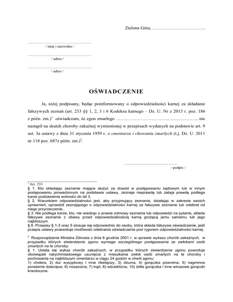 Zielona Góra, ……………………………. …………………………………………. / imię i nazwisko / …………………………………………. / adres / …………………………………………. / adres / OŚWIADCZENIE Ja, niżej podpisany, będąc poinformowany o odpowiedzialności karnej za składanie fałszywych zeznań (art. 233 §§ 1, 2, 3 i 6 Kodeksu karnego – Dz. U. Nr z 2013 r. poz. 186 z późn. zm.)1 oświadczam, że zgon zmarłego …………………………………………….. nie nastąpił na skutek choroby zakaźnej wymienionej w przepisach wydanych na podstawie art. 9 ust. 3a ustawy z dnia 31 stycznia 1959 r. o cmentarzu i chowaniu zmarłych (t.j. Dz. U. 2011 nr 118 poz. 687z późn. zm.)2. ……………………………. / podpis / 1 Art. 233 § 1. Kto składając zeznanie mające służyć za dowód w postępowaniu sądowym lub w innym postępowaniu prowadzonym na podstawie ustawy, zeznaje nieprawdę lub zataja prawdę podlega karze pozbawienia wolności do lat 3. § 2. Warunkiem odpowiedzialności jest, aby przyjmujący zeznanie, działając w zakresie swoich uprawnień, uprzedził zeznającego o odpowiedzialności karnej za fałszywe zeznanie lub odebrał od niego przyrzeczenie.. § 3. Nie podlega karze, kto, nie wiedząc o prawie odmowy zeznania lub odpowiedzi na pytanie, składa fałszywe zeznanie z obawy przed odpowiedzialnością karną grożącą jemu samemu lub jego najbliższym. § 6. Przepisy § 1-3 oraz 5 stosuje się odpowiednio do osoby, która składa fałszywe oświadczenie, jeśli przepis ustawy przewiduje możliwość odebrania oświadczenia pod rygorem odpowiedzialności karnej. 2 Rozporządzenie Ministra Zdrowia z dnia 6 grudnia 2001 r. w sprawie wykazu chorób zakaźnych, w przypadku których stwierdzenie zgonu wymaga szczególnego postępowania ze zwłokami osób zmarłych na te choroby. § 1. Ustala się wykaz chorób zakaźnych, w przypadku których stwierdzenie zgonu powoduje obowiązek natychmiastowego usunięcia z mieszkania zwłok osób zmarłych na te choroby i pochowania na najbliższym cmentarzu w ciągu 24 godzin w chwili zgonu: 1) cholera, 2) dur wysypkowy i inne riketsjozy, 3) dżuma, 4) gorączka powrotna, 5) nagminne porażenie dziecięce, 6) nosacizna, 7) trąd, 8) wścieklizna, 10) żółta gorączka i inne wirusowe gorączki krwotoczne.