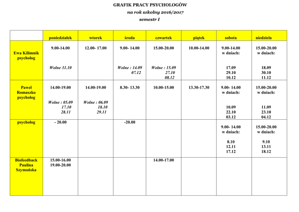 GRAFIK PRACY PSYCHOLOGÓW na rok szkolny 2016/2017 semestr I poniedziałek wtorek środa czwartek piątek sobota 9.00-14.00 12.00- 17.00 9.00- 14.00 15.00-20.00 10.00-14.00 9.00-14.00 w dniach: 15.00-20.00 w dniach: Wolne : 14.09 07.12 Wolne : 15.09 27.10 08.12 17.09 29.10 10.12 18.09 30.10 11.12 8.30- 13.30 10.00-15.00 9.00- 14.00 w dniach: 15.00-20.00 w dniach: 10.09 22.10 03.12 11.09 23.10 04.12 9.00- 14.00 w dniach: 15.00-20.00 w dniach: 8.10 12.11 17.12 9.10 13.11 18.12 Ewa Kilimnik psycholog Wolne 31.10 Paweł Romaszko psycholog psycholog Biofeedback Paulina Szymańska 14.00-19.00 14.00-19.00 Wolne : 05.09 17.10 28.11 Wolne : 06.09 18.10 29.11 - 20.00 15.00-16.00 19.00-20.00 13.30-17.30 niedziela -20.00 14.00-17.00