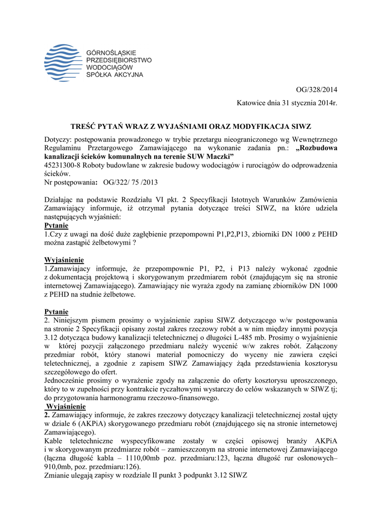 OG/328/2014 Katowice dnia 31 stycznia 2014r. TREŚĆ PYTAŃ WRAZ Z WYJAŚNIAMI ORAZ MODYFIKACJA SIWZ Dotyczy: postępowania prowadzonego w trybie przetargu nieograniczonego wg Wewnętrznego Regulaminu Przetargowego Zamawiającego na wykonanie zadania pn.: „Rozbudowa kanalizacji ścieków komunalnych na terenie SUW Maczki” 45231300-8 Roboty budowlane w zakresie budowy wodociągów i rurociągów do odprowadzenia ścieków. Nr postępowania: OG/322/ 75 /2013 Działając na podstawie Rozdziału VI pkt. 2 Specyfikacji Istotnych Warunków Zamówienia Zamawiający informuje, iŜ otrzymał pytania dotyczące treści SIWZ, na które udziela następujących wyjaśnień: Pytanie 1.Czy z uwagi na dość duŜe zagłębienie przepompowni P1,P2,P13, zbiorniki DN 1000 z PEHD moŜna zastąpić Ŝelbetowymi ? Wyjaśnienie 1.Zamawiajacy informuje, Ŝe przepompownie P1, P2, i P13 naleŜy wykonać zgodnie z dokumentacją projektową i skorygowanym przedmiarem robót (znajdującym się na stronie internetowej Zamawiającego). Zamawiający nie wyraŜa zgody na zamianę zbiorników DN 1000 z PEHD na studnie Ŝelbetowe. Pytanie 2. Niniejszym pismem prosimy o wyjaśnienie zapisu SIWZ dotyczącego w/w postępowania na stronie 2 Specyfikacji opisany został zakres rzeczowy robót a w nim między innymi pozycja 3.12 dotycząca budowy kanalizacji teletechnicznej o długości L-485 mb. Prosimy o wyjaśnienie w której pozycji załączonego przedmiaru naleŜy wycenić w/w zakres robót. Załączony przedmiar robót, który stanowi materiał pomocniczy do wyceny nie zawiera części teletechnicznej, a zgodnie z zapisem SIWZ Zamawiający Ŝąda przedstawienia kosztorysu szczegółowego do ofert. Jednocześnie prosimy o wyraŜenie zgody na załączenie do oferty kosztorysu uproszczonego, który to w zupełności przy kontrakcie ryczałtowymi wystarczy do celów wskazanych w SIWZ tj; do przygotowania harmonogramu rzeczowo-finansowego. Wyjaśnienie 2. Zamawiający informuje, Ŝe zakres rzeczowy dotyczący kanalizacji teletechnicznej został ujęty w dziale 6 (AKPiA) skorygowanego przedmiaru robót (znajdującego się na stronie internetowej Zamawiającego). Kable teletechniczne wyspecyfikowane zostały w części opisowej branŜy AKPiA i w skorygowanym przedmiarze robót – zamieszczonym na stronie internetowej Zamawiającego (łączna długość kabla – 1110,00mb poz. przedmiaru:123, łączna długość rur osłonowych– 910,0mb, poz. przedmiaru:126). Zmianie ulegają zapisy w rozdziale II punkt 3 podpunkt 3.12 SIWZ -łączna długość kanalizacji teletechnicznej jest: L= 485mb, winno być: L=910,0mb Zamawiający nie wyraŜa zgody na dołączenie do oferty kosztorysu ofertowego uproszczonego, jednocześnie podtrzymuje zapisy w Rozdziale V punkt 13 SIWZ. Pytanie 3.Prosimy o zmianę wymogu załączenia do oferty kosztorysu szczegółowego na formę kosztorysu uproszczonego. Wyjaśnienie 3.Zamawiający nie wyraŜa zgody na dołączenie do oferty kosztorysu ofertowego uproszczonego, jednocześnie podtrzymuje zapisy w Rozdziale V punkt 13 SIWZ. Pytanie 4.Wnioskujemy o rezygnację z wymogu podawania z nazwy ew. firmy podwykonawczej przy pozostawieniu wskazania zakresu robót podwykonawczych. Podwykonawca moŜe się zmienić w efekcie np. negocjacji. Prosimy o dopuszczenie zmiany podwykonawcy. Wyjaśnienie 4.Przedmiotowe postępowanie nie jest prowadzone według przepisów ustawy - Prawo zamówień publicznych lecz wg. Wewnętrznego Regulaminu Przetargowego Zamawiającego. W związku z tym Zamawiający nie wyraŜa zgody na zmianę treści załącznika nr 5 SIWZ i wymaga podania podwykonawców oraz zakresu robót przez nich wykonywanych. Pytanie 5. W inwentaryzacji zieleni (wycinka drzew) występuje ilość ok.60szt drzew a w przedmiarze tylko 20. Prosimy o wyjaśnienie tej rozbieŜności. Wyjaśnienie 5.Zamawiajacy informuje, iŜ ilość drzew do wycinki naleŜy przyjąć zgodnie ze skorygowanym przedmiarem robót zamieszczonym na stronie internetowej Zamawiającego. Pytanie 6. W przedmiarze brak pozycji ujmującej armaturę przepływomierza Prosimy o uzupełnienie lub wskazanie odp. pozycji dla wyceny. Wyjaśnienie 6.Zamawiajacy informuje, iŜ armatura przepływomierza jest ujęta w dziale skorygowanego przedmiaru robót „Roboty technologiczne” , pozycje 39 do 42 oraz w wykazie elementów na rysunku Nr 5 w „Części sanitarnej” projektu. Pytanie 7.Brak w przedmiarze pozycji umoŜliwiającej wycenę robót geodezyjnych. Prosimy o uzupełnienie lub wskazanie odp. pozycji dla wyceny. Wyjaśnienie 7. Zamawiający informuje, iŜ obsługa geodezyjna budowy nie jest robotą budowlano-montaŜową – wycenę uwzględnić w kosztach pośrednich. Pytanie 8. W PW oraz zestawieniu materiałów wymieniono między innymi: - Rura PP SN 8 Dz 200x8 1002.5mb - Rura PP SN Dz 160x 6,3 366,0m Wymienione grubości ścianek 6,3mm i 8mm opisują rurę PVC Litą typ supercięŜki SN 16 o zapisie odpowiednio 160x6,2 i 200x7,7 Rura PP SN 8 o potrójnej ściance ma wymiary wg katalogu prod. DN/ID 150Dz 173mm Dw 150mm DN/ID 200Dz 225mm Dw200mm Nie ma obecnie producenta rur PP (polipropylen ) o ściance litej. Prosimy o jednoznaczne określenie jakiego rodzaju rur naleŜy uŜyć W związku z powyŜszym wnosimy o przesunięcie terminu składania ofert. Wyjaśnienie 8. Zamawiający informuje, iŜ naleŜy uŜyć rur warstwowych PP ( pozycje skorygowanego przedmiaru robot: 33 i 34), który został zamieszczony na stronie internetowej Zamawiającego. rura PP SN8 Dz200 x 7,6 mm rura PP SN8 Dz160 x 6,1mm zamiast podanych w zestawieniu materiałów: rura PP SN8 Dz200x 8,0 mm rura PP SN8 Dz160 x 6,3mm Pytanie 9. Czy aby spełnić warunek udziału w postępowaniu w zakresie posiadanego doświadczenia roboty z zakresu budowy kanalizacji ściekowej o długości min.800 mb oraz roboty z zakresu budowy min. 1 przepompowni ścieków muszą być wykonane w ramach tego samego zadania inwestycyjnego ? Wyjaśnienie 9.Zamawiajacy dopuszcza do udziału w postę