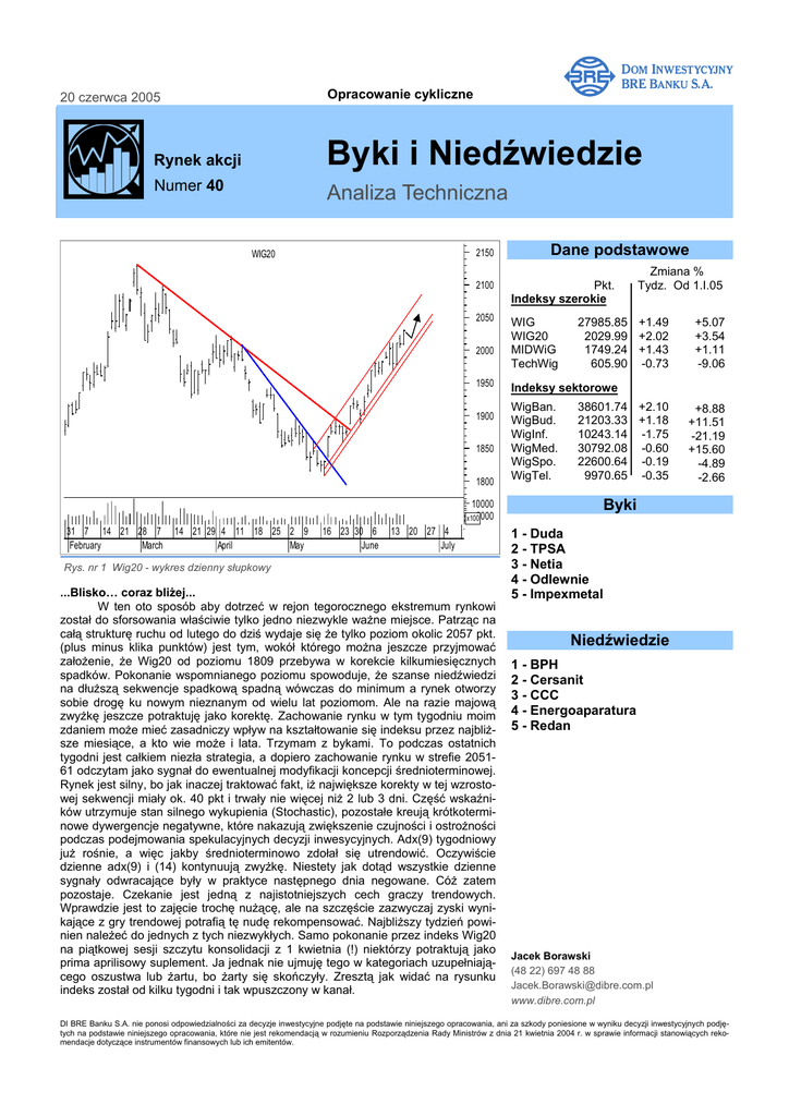 Byki i Niedźwiedzie BRE Bank BRE Bank Securities Opracowanie cykliczne 20 czerwca 2005 Rynek akcji Byki i Niedźwiedzie Numer 40 Analiza Techniczna 2150 WIG20 2100 Pkt. Indeksy szerokie 2050 WIG WIG20 MIDWiG TechWig 2000 1950 1900 1850 1800 10000 x1005000 31 7 14 21 28 7 February March 14 21 29 4 11 18 25 2 9 April May 16 23 30 6 June Dane podstawowe 13 20 27 4 1 July Rys. nr 1 Wig20 - wykres dzienny słupkowy ...Blisko… coraz bliżej... W ten oto sposób aby dotrzeć w rejon tegorocznego ekstremum rynkowi został do sforsowania właściwie tylko jedno niezwykle ważne miejsce. Patrząc na całą strukturę ruchu od lutego do dziś wydaje się że tylko poziom okolic 2057 pkt. (plus minus klika punktów) jest tym, wokół którego można jeszcze przyjmować założenie, że Wig20 od poziomu 1809 przebywa w korekcie kilkumiesięcznych spadków. Pokonanie wspomnianego poziomu spowoduje, że szanse niedźwiedzi na dłuższą sekwencje spadkową spadną wówczas do minimum a rynek otworzy sobie drogę ku nowym nieznanym od wielu lat poziomom. Ale na razie majową zwyżkę jeszcze potraktuję jako korektę. Zachowanie rynku w tym tygodniu moim zdaniem może mieć zasadniczy wpływ na kształtowanie się indeksu przez najbliższe miesiące, a kto wie może i lata. Trzymam z bykami. To podczas ostatnich tygodni jest całkiem niezła strategia, a dopiero zachowanie rynku w strefie 205161 odczytam jako sygnał do ewentualnej modyfikacji koncepcji średnioterminowej. Rynek jest silny, bo jak inaczej traktować fakt, iż największe korekty w tej wzrostowej sekwencji miały ok. 40 pkt i trwały nie więcej niż 2 lub 3 dni. Część wskaźników utrzymuje stan silnego wykupienia (Stochastic), pozostałe kreują krótkoterminowe dywergencje negatywne, które nakazują zwiększenie czujności i ostrożności podczas podejmowania spekulacyjnych decyzji inwesycyjnych. Adx(9) tygodniowy już rośnie, a więc jakby średnioterminowo zdołał się utrendowić. Oczywiście dzienne adx(9) i (14) kontynuują zwyżkę. Niestety jak dotąd wszystkie dzienne sygnały odwracające były w praktyce następnego dnia negowane. Cóż zatem pozostaje. Czekanie jest jedną z najistotniejszych cech graczy trendowych. Wprawdzie jest to zajęcie trochę nużącę, ale na szczęście zazwyczaj zyski wynikające z gry trendowej potrafią tę nudę rekompensować. Najbliższy tydzień powinien należeć do jednych z tych niezwykłych. Samo pokonanie przez indeks Wig20 na piątkowej sesji szczytu konsolidacji z 1 kwietnia (!) niektórzy potraktują jako prima aprilisowy suplement. Ja jednak nie ujmuję tego w kategoriach uzupełniającego oszustwa lub żartu, bo żarty się skończyły. Zresztą jak widać na rysunku indeks został od kilku tygodni i tak wpuszczony w kanał. Zmiana % Tydz. Od 1.I.05 27985.85 +1.49 2029.99 +2.02 1749.24 +1.43 605.90 -0.73 +5.07 +3.54 +1.11 -9.06 Indeksy sektorowe WigBan. WigBud. WigInf. WigMed. WigSpo. WigTel. 38601.74 +2.10 21203.33 +1.18 10243.14 -1.75 30792.08 -0.60 22600.64 -0.19 9970.65 -0.35 +8.88 +11.51 -21.19 +15.60 -4.89 -2.66 Byki 1 - Duda 2 - TPSA 3 - Netia 4 - Odlewnie 5 - Impexmetal Niedźwiedzie 1 - BPH 2 - Cersanit 3 - CCC 4 - Energoaparatura 5 - Redan Jacek Borawski (48 22) 697 48 88 [email protected] www.dibre.com.pl DI BRE Banku S.A. nie ponosi odpowiedzialności za decyzje inwestycyjne podjęte na podstawie niniejszego opracowania, ani za szkody poniesione w wyniku decyzji inwestycyjnych podjętych na podstawie niniejszego opracowania, które nie jest rekomendacją w rozumieniu Rozporządzenia Rady Ministrów z dnia 21 kwietnia 2004 r. w sprawie informacji stanowiących rekomendacje dotyczące instrumentów finansowych lub ich emitentów. Byki i Niedźwiedzie BRE Bank Byki Duda Zaklady Miesne (10.5000, 10.7000, 10.4000, 10.7000, +0.20000) 13.5 13.0 12.5 12.0 11.5 11.0 G R Duda Kurs - 10,70 zł. Oczekiwany zasięg Piątkowe wybicie może być ostatnim preludium, które wywoła wreszcie pokonanie oporu na wysokości 10,75 zł. Jeśli tak to byki nie powinny się już cofać. Obrona poniżej dna środowej świecy czyli po spadku poniżej 10,30 zł. 10.5 R 10.0 10000 x10 21 28 7 March 14 21 29 4 11 April 18 25 2 9 May 16 23 30 6 June 13 20 27 4 Ju TPSA (19.2500, 19.4000, 19.1000, 19.2000, -0.05000) 23.5 23.0 22.5 22.0 21.5 21.0 20.5 20.0 TPSA Kurs - 19,20 zł. Oczekiwany zasięg Byki i niedźwiedzie ślizgają się po średnioterminowej linii trendu spadkowego. Ponieważ reakcja byków na środowej sesji była dość mocna przebicie jej dna (18,70) zniweczy wysiłek byków na czas nieokreślony chwilowo neutralizując go. 19.5 19.0 18.5 18.0 17.5 50000 x100 21 28 7 March 14 21 29 4 11 April 18 25 2 9 May 16 23 30 6 June 13 20 27 4 Ju 4.9 4.8 4.7 4.6 4.5 4.4 4.3 4.2 4.1 4.0 3.9 3.8 3.7 3.6 3.5 Netia (4.00000, 4.01000, 3.98000, 3.99000, +0.0000) 50000 x100 ovember December 2005 February March April May June J Netia Kurs - 3,99 zł. Oczekiwany zasięg Obie strony wzajemnie czarują się. Po stronie niedźwiedzi nagrobek z poniedziałku na dużym wolumenie. Po stronie byków pozytywna formacja tygodniowa „podstawy wieży”. Jeśli byki chcą trzymać się w cugu wzrostowym tej sekwencji nie powinny dopuszczać do spadku poniżej 3,86 zł. Byki i Niedźwiedzie BRE Bank Odlewnie (3.50000, 3.53000, 3.50000, 3.53000, +0.0000) 4.6 4.5 4.4 4.3 4.2 4.1 4.0 3.9 3.8 3.7 3.6 3.5 3.4 3.3 3.2 3.1 3.0 Odlewnie Kurs - 3,53 zł. Oczekiwany zasięg Wyciągnięcie byków ponownie powyżej 3,50 może przynieść ruch górę. O ile dno środowego słupka powrotnie nie zostanie pokonane w dół. Po tym wydarzeniu bycza neutralizacja. 15000 10000 5000 x10 December 2005 February March April May June J Impexmetal (42.1000, 43.0000, 41.5000, 43.0000, +1.00000) 60 Impexmetal Kurs - 43,00 zł. Oczekiwany zasięg 55 50 Byki zadeklarowały się piątkowym wybiciem, a skoro tak się stało powinno już nie dochodzić do forsowania dna środowego młota czyli zbijania 40,50 zł. na koniec dnia. 45 40 4000