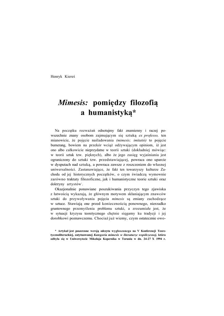 Henryk Kiereś Mimesis: pomiędzy filozofią a humanistyką* Na początku rozważań odnotujmy fakt znamienny i raczej po wszechnie znany osobom zajmującym się sztuką ex professo, ten mianowicie, że pojęcie naśladowania (mimesis; imitatió) to pojęcie bumerang, bowiem na przekór wciąż odżywającym opiniom, iż jest ono albo całkowicie nieprzydatne w teorii sztuki (dokładniej mówiąc: w teorii sztuk tzw. pięknych), albo że jego zasięg wyjaśniania jest ograniczony do sztuki tzw. przedstawiającej, powraca ono uparcie w dysputach nad sztuką, a powraca zawsze z roszczeniem do własnej uniwersalności. Zastanawiające, że fakt ten towarzyszy kulturze Za chodu od jej historycznych początków, o czym świadczą wymownie zarówno traktaty filozoficzne, jak i humanistyczne teorie sztuki oraz doktryny artystów . Okazjonalnie ponawiane poszukiwania przyczyn tego zjawiska z łatwością wykazują, że głównym motywem skłaniającym znawców sztuki do przywoływania pojęcia mimesis są zmiany zachodzące w sztuce. Stawiają one przed koniecznością ponownego, nierzadko gruntownego przemyślenia problemu sztuki, a zrozumiałe jest, że w sytuacji kryzysu teoretycznego chętnie sięgamy ku tradycji i jej dorobkowi poznawczemu. Chociaż już wiemy, czym ostatecznie owo1 * Artykuł jest poszerzone wersją odczytu wygłoszonego na V Konferencji Teoretycznoliterackiej, zatytuowanej Kategoria mimesis w literaturze współczesnej, która odbyła się w Uniwersytecie Mikołaja Kopernika w Toruniu w dn. 24-27 X 1994 r. 168 Henryk Kiereś cują takie powroty, poznajmy pełną gamę stanowisk dotyczących związku sztuki z naśladowaniem. Prawie każda historycznie znana konfrontacja nowej sztuki z po jęciem naśladowania prowadzi do wyłonienia się trzech zróżnicowa nych wewnętrznie stanowisk. I tak, według pierwszego z nich s z t u k a n i e j e s t żadnym n a ś l a d o w a n i e m (natury), l e c z — łącznie lub rozłącznie — t w ó r c z o ś c i ą (kreowaniem, projekto waniem, konstruowaniem) bądź e k s p r e s j ą (wyrażaniem). Warto zapamiętać, że zwolennicy tego poglądu są przeświadczeni, iż kreacja i (lub) ekspresja nie suponuje naśladowania, co — jak konkludują — w pełni legitymuje postulat eliminacji bałamutnego pojęcia mime sis z teorii sztuki, a jeżeli dopuszczają oni możliwość mówienia 0 sztuce naśladowczej, wiążą taką sztukę z rzemiosłem lub z odmia nami sztuki przez małe „s", np. z dekoratorstwem . W związku z powyższym zauważmy, że trudno oprzeć się pytaniu, dlaczego naśladowanie nie podpada pod zakres pojęcia sztuki, a jeżeli podpada, co sprawia, że sztuka z niego wyrosła jest sztuką poślednią? Czy pogląd ten nie przemyca przypadkiem jakiegoś apriorycznego, czyli nie uzasadnionego kryterium oceny sztuki? Sztuka naśladow cza resp. sztuka przedstawiająca jest przecież nie tylko znanym, ale również uznanym kulturowo faktem, z którego w żaden spo sób nie wynika jej niższość wobec sztuk mających swe źródło w in nych kanonach! Przytoczona wątpliwość oraz towarzysząca jej argumentacja zna ne są przedstawicielom kolejnego ujęcia, według którego i s t o t ę s z t u k i o k r e ś l a j ą alternatywnie: mimeza, kreacja 1 e k s p r e s j a . Dzięki swemu koncyliaryzmowi wyznawcy tego poglądu zachowują pojęcia naśladowania w teorii sztuki, ale — jak pamiętamy — wiążą je wyłącznie ze sztuką tzw. przedstawiającą, to znaczy z taką sztuką, która nie wykracza poza ramy wyznaczone artyście przez zastany świat . Odnotujmy na gorąco, że pomimo spektakularnej różnicy w deter minowaniu zakresu pojęcia sztuki oba stanowiska łączy główna teza o radykalnej odrębności kreacji i ekspresji od mimezy! Broniąc się przed możliwymi zarzutami, jakie wynikałyby z tego niechcianego 2 3 Mimesis: pomiędzy filozofią a humanistyką 169 pokrewieństwa, autorzy alternatywnej definicji sztuki podkreślają, że — w odróżnieniu od zwolenników teorii ekspresji oraz teorii krea cji — budując teorię sztuki wychodzą od opisu stanu faktycznego w sztuce, dzięki czemu unikają skutecznie wprowadzania apriorycz nych rozstrzygnięć dotyczących zarówno problemu istoty sztuki, możliwości jej podziału, jak i kryterium oceny jej dokonań. Czy to wyjaśnienie chroni definicję alternatywną przed zarzutami? Można sądzić, że jej siła leży bezsprzecznie w zgodności z faktami w sztuce, które wyrastają przecież z różnych kanonów artystycznych, ale — co odnotowują jej krytycy — trudno wyzbyć się podejrzenia, że i ona, i konkurujące z nią ujęcia przciwstawiają sobie bezzasadnie i naiwnie mimezę, ekspresję i kreację. Ponadto należy przytoczyć ważki argument, że jeżeli wyrażanie, naśladowanie i tworzenie nie mają żadnych wspólnych odniesień przedmiotowych, to na jakiej podstawie wiąże się je z pojęciem sztuki? Słusznie respektuje się fakty, ale nie dostrzega się, że „alternatywizm" prowadzi do rozbicia jedności pojęcia sztuki! Powyższy zarzut jest udziałem zwolenników trzeciego stanowis ka w sporze o mimesis, zgodnie z którym e k s p r e s j a i ( l u b ) kreacja są r o d z a j a m i mimesis, ono z a ś w s k a z u j e na i s t o t ę sztuki . Chociaż tę propozycję cechuje nie tylko troska o ogarnięcie faktów zaistniałych na terenie sztuki, ale także dbałość o aspekt logicznopojęciowy teorii sztuki, jest ona nie do przyjęcia, a powody są przynajmniej następujące. Otóż, po pierwsze, podobnie jak w teorii alternatywnej operuje się w niej pojęciem sztuki przypominającym przysłowiowy „worek bez dna", do którego można wrzucić i arbit ralnie nazwać sztuką jakiekolwiek poczynania i dokonania człowieka. Inaczej mówiąc, złudne przekonanie o „zawieraniu" się kreacji i eks presji w mimezie uniemożliwia podanie ostatecznego kryterium oce ny sztuki, ponieważ — po drugie — pociąga ono za sobą błąd tz