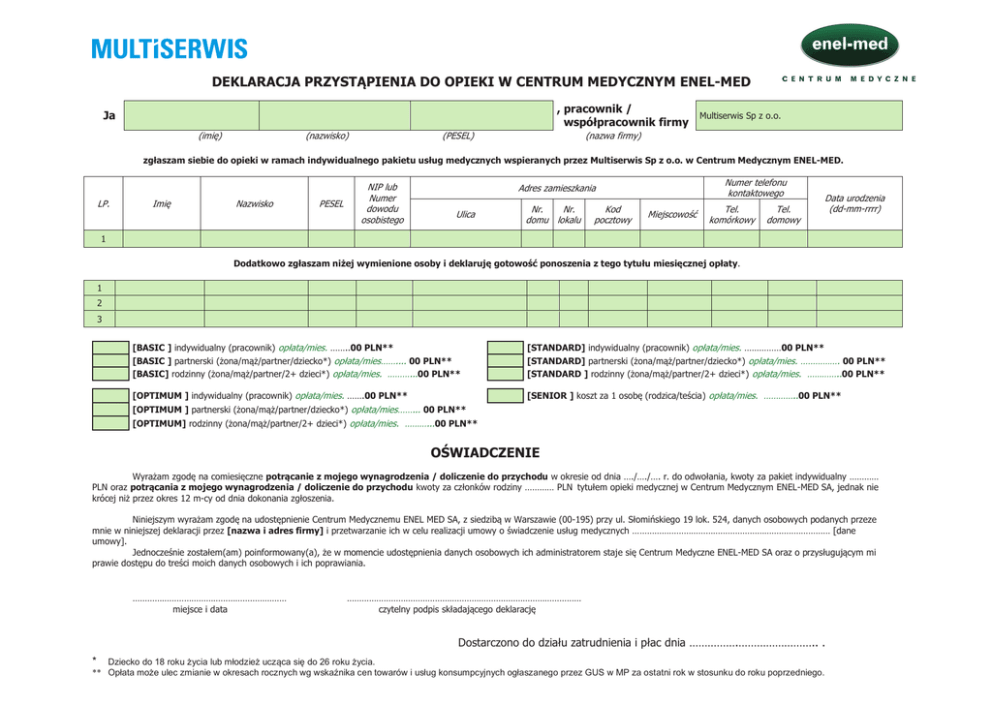 DEKLARACJA PRZYSTĄPIENIA DO OPIEKI W CENTRUM MEDYCZNYM ENEL-MED , pracownik / Multiserwis Sp z o.o. współpracownik firmy Ja (imię) (nazwisko) (PESEL) (nazwa firmy) zgłaszam siebie do opieki w ramach indywidualnego pakietu usług medycznych wspieranych przez Multiserwis Sp z o.o. w Centrum Medycznym ENEL-MED. LP. Imię Nazwisko PESEL NIP lub Numer dowodu osobistego Numer telefonu kontaktowego Adres zamieszkania Ulica Nr. Nr. domu lokalu Kod pocztowy Miejscowość Tel. komórkowy Tel. domowy Data urodzenia (dd-mm-rrrr) 1 Dodatkowo zgłaszam niżej wymienione osoby i deklaruję gotowość ponoszenia z tego tytułu miesięcznej opłaty. 1 2 3 [BASIC ] indywidualny (pracownik) opłata/mies. ……..00 PLN** [BASIC ] partnerski (żona/mąż/partner/dziecko*) opłata/mies…….... 00 PLN** [BASIC] rodzinny (żona/mąż/partner/2+ dzieci*) opłata/mies. ………...00 PLN** [STANDARD] indywidualny (pracownik) opłata/mies. ……………00 PLN** [STANDARD] partnerski (żona/mąż/partner/dziecko*) opłata/mies. ……………. 00 PLN** [STANDARD ] rodzinny (żona/mąż/partner/2+ dzieci*) opłata/mies. …………..00 PLN** [OPTIMUM ] indywidualny (pracownik) opłata/mies. …….00 PLN** [SENIOR ] koszt za 1 osobę (rodzica/teścia) opłata/mies. …………..00 PLN** [OPTIMUM ] partnerski (żona/mąż/partner/dziecko*) opłata/mies……... 00 PLN** [OPTIMUM] rodzinny (żona/mąż/partner/2+ dzieci*) opłata/mies. ………...00 PLN** OŚWIADCZENIE Wyrażam zgodę na comiesięczne potrącanie z mojego wynagrodzenia / doliczenie do przychodu w okresie od dnia …./…./…. r. do odwołania, kwoty za pakiet indywidualny ………… PLN oraz potrącania z mojego wynagrodzenia / doliczenie do przychodu kwoty za członków rodziny ………… PLN tytułem opieki medycznej w Centrum Medycznym ENEL-MED SA, jednak nie krócej niż przez okres 12 m-cy od dnia dokonania zgłoszenia. Niniejszym wyrażam zgodę na udostępnienie Centrum Medycznemu ENEL MED SA, z siedzibą w Warszawie (00-195) przy ul. Słomińskiego 19 lok. 524, danych osobowych podanych przeze mnie w niniejszej deklaracji przez [nazwa i adres firmy] i przetwarzanie ich w celu realizacji umowy o świadczenie usług medycznych ……………………………………………………………………… [dane umowy]. Jednocześnie zostałem(am) poinformowany(a), że w momencie udostępnienia danych osobowych ich administratorem staje się Centrum Medyczne ENEL-MED SA oraz o przysługującym mi prawie dostępu do treści moich danych osobowych i ich poprawiania. ……………………………………………………… miejsce i data …………………………………………………………………………………… czytelny podpis składającego deklarację Dostarczono do działu zatrudnienia i płac dnia …………….…………………….. . * Dziecko do 18 roku życia lub młodzież ucząca się do 26 roku życia. ** Opłata może ulec zmianie w okresach rocznych wg wskaźnika cen towarów i usług konsumpcyjnych ogłaszanego przez GUS w MP za ostatni rok w stosunku do roku poprzedniego.