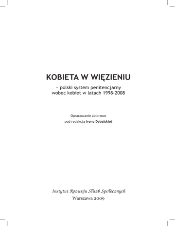 KOBIETA W WIĘZIENIU – polski system penitencjarny wobec kobiet w latach 1998-2008 Opracowanie zbiorowe pod redakcją Ireny Dybalskiej Instytut Rozwoju Służb Społecznych Warszawa 2009 Spis treści Irena Dybalska Przedmowa.................................................................... 15 Rozdział 1. Wybrane problemy wykonywania kary pozbawienia wolności wobec kobiet w obowiązującym systemie penitencjarnym w Polsce Irena Dybalska Wstęp................................................................................................... 21 Główne cele i środki oddziaływania w wykonywaniu kary pozbawienia wolności.........................................................................26 Informacje ogólne o systemie penitencjarnym.................................. 27 Wybrane informacje o Służbie Więziennej, populacji więźniów oraz środkach oddziaływania według stanu w dniu 31 grudnia 2008 roku.........................................................................29 Wybrane regulacje prawne dotyczące problematyki kobiet w polskich zakładach karnych i aresztach śledczych..........................39 Dostęp kobiet do usług medycznych..................................................42 Polski model wykonywania kary pozbawienia wolności wobec kobiet, matek dzieci do lat trzech.......................................................42 Przegląd wybranych problemów dotyczących struktury wieku, płci i niektórych rodzajów przestępstw dokonywanych przez poszczególne grupy sprawców..................................................46 Specyfika przestępczości kobiet na podstawie danych o liczbie osadzonych za niektóre przestępstwa przeciwko zdrowiu i życiu......49 Spójność systemów............................................................................. 51 Praktyka wobec problemu przemocy w wymiarze sprawiedliwości – stan po czterech latach od uchwalenia ustawy o przeciwdziałaniu przemocy w rodzinie...........................................................................53 Zakończenie........................................................................................56 Załączniki............................................................................................ 57 Bibliografia..........................................................................................59 9 Spis treści Rozdział 2. Niektóre zagadnienia przestępczości kobiet Marzena Piekarska Ofiara czy sprawca? Problem kobiet odbywających karę pozbawienia wolności za zabójstwo partnera.......................... 65 Organizacja badań, charakterystyka badanej grupy..........................66 Formy przemocy stosowane wobec badanych oraz czas pozostawania w związkach krzywdzących..........................................67 Poglądy badanych kobiet na zjawisko przemocy w rodzinie, przyczyny i rozmiary zjawiska............................................................68 Formy obrony, ocena ich skuteczności oraz korzystanie z pomocy placówek i instytucji w opinii badanych kobiet..................................70 Powody pozostawania kobiet w związku ze znęcającym się partnerem............................................................................................70 Ocena skutków przemocy w rodzinie przez badane kobiety.............. 71 Podsumowanie i wnioski.................................................................... 72 Marta Sikoń-Łatka Przekrój społeczny i psychologiczny sprawczyń wybranych typów przestępstw charakterystycznych dla stolicy.................. 74 Dzieciobójczynie.................................................................................78 Przestępczość zorganizowana............................................................. 79 Podsumowanie................................................................................... 80 Bibliografia.......................................................................................... 81 Waldemar Kowalski Przestępczość kobiet w mieście portowym............................. 83 Ewa Chmurska Wizerunek kobiety w oczach skazanych recydywistów uzależnionych od alkoholu................................................. 89 Cele badania........................................................................................89 Otrzymane wyniki...............................................................................89 Wnioski............................................................................................... 91 10 Spis treści Rozdział 3. Przykłady oddziaływań resocjalizacyjnych Lidia Olejnik Program pracy wolontarystycznej „BONA” jako metoda readaptacji społecznej...................................................... 95 Założenia merytoryczne programu.....................................................96 Kryteria klasyfikacji do pracy wolontarystycznej............................... 97 Zadania dla opiekunów grupy............................................................ 97 Piotr Ciwiński Terapia metodą teatru terapeutycznego kobiet doświadczonych przemocą......................................................................105 Obraz kobiet ofiar przemocy domowej odbywających karę pozbawienia wolności....................................................................... 105 Ogólna charakterystyka metody teatru terapeutycznego................. 107 Założenia merytoryczne programu................................................... 109 Cele i techniki pracy..........................................................................109 Skuteczność teatru terapeutycznego – analiza badań własnych....... 111 Wnioski końcowe z przeprowadzonych badań..................................112 Adam Szymura Terapia przez zajęcia teatralne..........................................115 Joanna Kurowska Zakład Karny w Krzywańcu................................................119 Jacek Łotowski „Uniwersytet Więzienny – droga do wolności” w