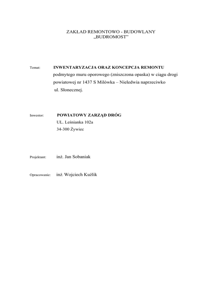 ZAKŁAD REMONTOWO - BUDOWLANY „BUDROMOST” Temat: INWENTARYZACJA ORAZ KONCEPCJA REMONTU podmytego muru oporowego (zniszczona opaska) w ciągu drogi powiatowej nr 1437 S Milówka – Nieledwia naprzeciwko ul. Słonecznej. Inwestor: POWIATOWY ZARZĄD DRÓG UL. Leśnianka 102a 34-300 Żywiec Projektant: inż. Jan Sobaniak Opracowanie: inż. Wojciech Kuźlik KONCEPCJA REMONTU podmytego muru oporowego (zniszczona opaska) w ciągu DP nr 1437 S w Milówka - Nieledwia na przeciwko ul. Słonecznej Maj, 2008 r. ZAWARTOŚĆ OPRACOWANIA I. CZĘŚĆ OPISOWA 1. Podstawy opracowania 1.1 Podstawy formalne 1.2 Podstawy prawne 2. Cel i zakres opracowania 3. Opis techniczny istniejącego muru oporowego 3.1. Dane ogólne 3.2. Konstrukcja nośna 3.3. Przepusty 3.4. Koryto potoku 4. Inwentaryzacja uszkodzeń i ocena stanu technicznego 4.1 Mur oporowy 4.2 Most 4.3 Gurt drewniany 4.4 Koryto potoku 5. Wnioski 6. Koncepcja remontu 7. Zalecenia, technologia i kolejność robót 8. Zastosowane materiały konstrukcyjne II. CZĘŚĆ RYSUNKOWA A. Inwentaryzacja 1. Widok z góry, przekrój A-A 2. Przekroje muru i koryta B. Koncepcja remontu 2. Widok z góry, przekrój A-A 3. Przekroje muru i koryta 5. Zbrojenie ZR-B “BUDROMOST” - LAS 2 KONCEPCJA REMONTU podmytego muru oporowego (zniszczona opaska) w ciągu DP nr 1437 S w Milówka - Nieledwia na przeciwko ul. Słonecznej I. CZĘŚĆ OPISOWA 1. Podstawy opracowania 1.1. Podstawy formalne Niniejsze opracowanie zostało sporządzone zgodnie ze zleceniem nr PZD/30/ogólna/2008 z dnia 8.04.2008 Powiatowego Zarządu Dróg w Żywcu ul. Leśnianka 102a, dla Zakładu Remontowo – Budowlanego „Budromost” Las 225. 1.2 Podstawy techniczne [1] Wizja lokalna na obiekcie z dnia 09.05.08 oraz pomiary inwentaryzacyjne [2] PN-85/S-10030 Obiekty mostowe. Obciążenia. [3] PN-91/S-10042 Obiekty mostowe. Konstrukcje betonowe, żelbetowe i sprężone. Projektowanie. [4] PN-82/S-10052 Obiekty mostowe. Konstrukcje stalowe. Projektowanie. [5] Literatura techniczna 2. Cel i zakres opracowania Przedmiotowe opracowanie zostało sporządzone w celu określenia sposobu oraz zakresu remontu podmytego muru oporowego (zniszczona opaska) w ciągu DP nr 1437 S Milówka – Nieledwia w naprzeciwko ul. Słonecznej Zgodnie z zawartą umową niniejsza praca obejmuje: ZR-B “BUDROMOST” - LAS - inwentaryzację geometryczną, - inwentaryzację uszkodzeń, - ocenę stanu technicznego, - koncepcję remontu, - wnioski i zalecenia. 3 KONCEPCJA REMONTU podmytego muru oporowego (zniszczona opaska) w ciągu DP nr 1437 S w Milówka - Nieledwia na przeciwko ul. Słonecznej 3. Opis techniczny istniejącego muru oporowego: 3.1. Dane ogólne: Przedmiotowy mur usytuowany jest w ciągu DP nr 1437 S Milówka – Nieledwia w naprzeciwko ul. Słonecznej. Jest to obiekt monolityczny wykonany z kamienia i betonu, usytuowany wzdłuż drogi powiatowej na krawędzi koryta potoku Nieledwianka. Podstawowe dane geometryczne: - Długość całkowita przedmiotowego odcinka muru 33.0m - Szerokość korony muru 0.30m - Szerokość podstawy muru - Wysokość muru zmienna: 2.06 – 2.66m - szerokość drogi 4.50m - szerokość koryta potoku - szerokość gurtu drewnianego 3.2. ok.0.55m zmienna: 3.0 – 4.80m ok.5.50m Konstrukcja nośna: Mur oporowy chroniący koronę drogi powiatowej przed wodami potoku Nieledwianka wykonany jest z betonu i kamienia. Mur posadowiony jest na płask. 3.3. Przepusty: W murze znajdują się dwa wyloty przepustów Ø40 i Ø50 cm poprowadzonych pod koroną drogi powiatowej. 4. Inwentaryzacja uszkodzeń i ocena stanu technicznego: Inwentaryzacja uszkodzeń została przeprowadzona w dniu 14.04.08r. Ogólny stan techniczny muru oporowego jest zły. Zasadnicze uszkodzenia dotyczą podstawy muru która została uszkodzona podczas powodzi z września 2007r. Uszkodzenia te stanowią duże zagrożenie dla bezpiecznego użytkowania obiektu i w razie ponownego wystąpienia wielkiej wody mogą doprowadzić do trwałych uszkodzeń obiektu i korpusu drogi lub całkowitego zawalenia się ZR-B “BUDROMOST” - LAS 4 KONCEPCJA REMONTU podmytego muru oporowego (zniszczona opaska) w ciągu DP nr 1437 S w Milówka - Nieledwia na przeciwko ul. Słonecznej obiektu. Szczegółowy zakres uszkodzeń zostanie podany równocześnie z oceną stanu technicznego i uzupełniony dokumentacją fotograficzną. 4.1. Mur oporowy: Na całej długości mur oporowy wykazuje liczne pęknięcia oraz podmycia. Z oględzin wynika że był on w przeszłości remontowany (wykonano opaski betonowe). Podczas powodzi z września 2007 r. umocnienia te zostały uszkodzone i wymagają natychmiastowego remontu z uwagi na to że przedmiotowy obiekt znajduje się na zakolu potoku i każde następne wezbranie grozi jego trwałym uszkodzeniem. 4.2. Most: Podczas powodzi nastąpiło podmycie części przyczółka umiejscowionego w murze. 4.3 Gurt drewniany: Dno potoku za gurtem zostało wypłukane i znacznie się obniżyło. 4.4 Koryto potoku: Koryto potoku znajduje się w bardo złym stanie. Występują liczne zatory oraz pozostałości po uszkodzonych konstrukcjach oporowych (części opaski). Dno potoku występuje w spadku równym 0.8% . W środkowej części przedmiotowego odcinka koryta w rejonie mostu występuje znaczne przewężenie (szerokość dna wynosi tylko 3.0m). Te wszystkie czynniki powodują ze wody potoku w tym rejonie są bardzo rwące i zagrażają konstrukcji oporowej. 5. Wnioski: Z przeprowadzonej oceny stanu technicznego przedmiotowego muru oporowego wynikają następujące wnioski: 1. Opaska żelbetowa została zniszczona podczas powodzi 2007 i nie zabezpiecza muru oporowego i przyczółka przed wodami potoku. 2. Przyczółek umiejscowiony w murze oporowym jest podmyty i nie może być dalej bezpiecznie użytkowany. 3. Dno potoku Nieledwianka jest ciągle wypłukiwane przez wody potoku podczas wezbrań. 4. Dno potoku za gurtem zostało wypłukane, znacznie się obniżyło i nie zapewnia odpowiedniej podstawy dla koszy siatkowo-kam