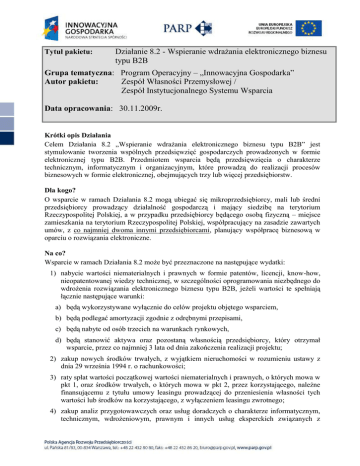 Tytuł pakietu: Działanie 8.2 - Wspieranie wdrażania elektronicznego biznesu typu B2B Grupa tematyczna: Program Operacyjny – „Innowacyjna Gospodarka” Autor pakietu: Zespół Własności Przemysłowej / Zespół Instytucjonalnego Systemu Wsparcia Data opracowania: 30.11.2009r. Krótki opis Działania Celem Działania 8.2 „Wspieranie wdrażania elektronicznego biznesu typu B2B” jest stymulowanie tworzenia wspólnych przedsięwzięć gospodarczych prowadzonych w formie elektronicznej typu B2B. Przedmiotem wsparcia będą przedsięwzięcia o charakterze technicznym, informatycznym i organizacyjnym, które prowadzą do realizacji procesów biznesowych w formie elektronicznej, obejmujących trzy lub więcej przedsiębiorstw. Dla kogo? O wsparcie w ramach Działania 8.2 mogą ubiegać się mikroprzedsiębiorcy, mali lub średni przedsiębiorcy prowadzący działalność gospodarczą i mający siedzibę na terytorium Rzeczypospolitej Polskiej, a w przypadku przedsiębiorcy będącego osobą fizyczną – miejsce zamieszkania na terytorium Rzeczypospolitej Polskiej, współpracujący na zasadzie zawartych umów, z co najmniej dwoma innymi przedsiębiorcami, planujący współpracę biznesową w oparciu o rozwiązania elektroniczne. Na co? Wsparcie w ramach Działania 8.2 może być przeznaczone na następujące wydatki: 1) nabycie wartości niematerialnych i prawnych w formie patentów, licencji, know-how, nieopatentowanej wiedzy technicznej, w szczególności oprogramowania niezbędnego do wdrożenia rozwiązania elektronicznego biznesu typu B2B, jeżeli wartości te spełniają łącznie następujące warunki: a) będą wykorzystywane wyłącznie do celów projektu objętego wsparciem, b) będą podlegać amortyzacji zgodnie z odrębnymi przepisami, c) będą nabyte od osób trzecich na warunkach rynkowych, d) będą stanowić aktywa oraz pozostaną własnością przedsiębiorcy, który otrzymał wsparcie, przez co najmniej 3 lata od dnia zakończenia realizacji projektu; 2) zakup nowych środków trwałych, z wyjątkiem nieruchomości w rozumieniu ustawy z dnia 29 września 1994 r. o rachunkowości; 3) raty spłat wartości początkowej wartości niematerialnych i prawnych, o których mowa w pkt 1, oraz środków trwałych, o których mowa w pkt 2, przez korzystającego, należne finansującemu z tytułu umowy leasingu prowadzącej do przeniesienia własności tych wartości lub środków na korzystającego, z wyłączeniem leasingu zwrotnego; 4) zakup analiz przygotowawczych oraz usług doradczych o charakterze informatycznym, technicznym, wdrożeniowym, prawnym i innych usług eksperckich związanych z projektem, w szczególności w zakresie re-inżynierii procesów biznesowych, reorganizacji przedsiębiorstw, wydzielania funkcji, wydzielania zadań oraz tworzenia wirtualnych przedsiębiorstw, świadczonych przez doradców zewnętrznych, przy czym usługi te nie mogą stanowić elementu stałej lub okresowej działalności gospodarczej przedsiębiorcy lub być związane z bieżącymi wydatkami operacyjnymi; 5) działania informacyjne o udziale finansowym środków budżetu Unii Europejskiej w realizowanym projekcie objętym wsparciem; 6) wynagrodzenia wraz z obowiązkowymi pozapłacowymi kosztami pracy osób zaangażowanych bezpośrednio w realizację projektu objętego wsparciem oraz na obowiązkowe pozapłacowe koszty pracy przedsiębiorców będących osobami fizycznymi prowadzącymi działalność gospodarczą; 7) zakup szkoleń specjalistycznych niezbędnych do wdrożenia rozwiązania elektronicznego biznesu typu B2B dla osób zaangażowanych w realizację projektu objętego wsparciem, do wysokości nieprzekraczającej 10% całkowitych wydatków kwalifikujących się do objęcia wsparciem, o których mowa w pkt 1 – 6, w tym wydatki na: a) zatrudnienie wykładowców, b) podróże wykładowców i uczestników szkolenia, w tym wydatki na zakwaterowanie, c) inne wydatki bieżące, w tym na materiały bezpośrednio związane z realizacją projektu, d) amortyzację narzędzi i wyposażenia w zakresie, w jakim są wykorzystywane na potrzeby realizacji projektu, e) usługi konsultacyjne i doradcze związane z realizacją projektu, f) pokrycie kosztów osobowych uczestników szkolenia oraz pokrycie ogólnych kosztów pośrednich (administracyjnych, wynajmu, ogólnych) do wysokości całkowitych wydatków kwalifikujących się do objęcia wsparciem, o których mowa w lit. a–e, przy czym w odniesieniu do pokrycia kosztów osobowych uczestników szkolenia uwzględnia się tylko czas faktycznego uczestnictwa w szkoleniu.. Projekty zostaną objęte dofinansowaniem przez okres nie dłuższy niż 24 miesiące. Poziom i wysokość wsparcia Kwota wsparcia na projekt w zakresie wspierania wdrażania elektronicznego biznesu typu B2B nie może być niższa niż 20 000 złotych i jednocześnie nie może przekraczać 2 000 000 złotych. Intensywność wsparcia jest zróżnicowana w zależności od m.in. statusu przedsiębiorcy, lokalizacji projektu i kategorii wydatków kwalifikowalnych. Terminy, sposób i miejsce składania wniosków oraz ocena projektów Nabór wniosków odbywa się w trybie konkursu zamkniętego. Terminy składania wniosków o dofinansowanie, miejsce składania wniosków oraz wysokość budżetu przeznaczonego na rundę aplikacyjną, określone są w ogłoszeniu o naborze wniosków, zamieszczonym na stronie internetowej Agencji. PARP prowadzi bieżący monitoring wartości przyjmowanych projektów w celu określenia maksymalnej możliwej do przyjęcia liczby projektów dla danej alokacji na rundę. Po osiągnięciu poziomu 130% alokacji przewidzianej na daną rundę, PARP poinformuje na stronie internetowej www.parp.gov.pl, z wyprzedzeniem 3 dni roboczych, o dacie wstrzymania naboru wniosków. Data zakończenia przyjmowania wniosków nie może przekroczyć wyznaczonej daty zamknięcia naboru wniosków dla danej rundy aplikacyjnej. Wnioski składane są do Regionalnych Insty