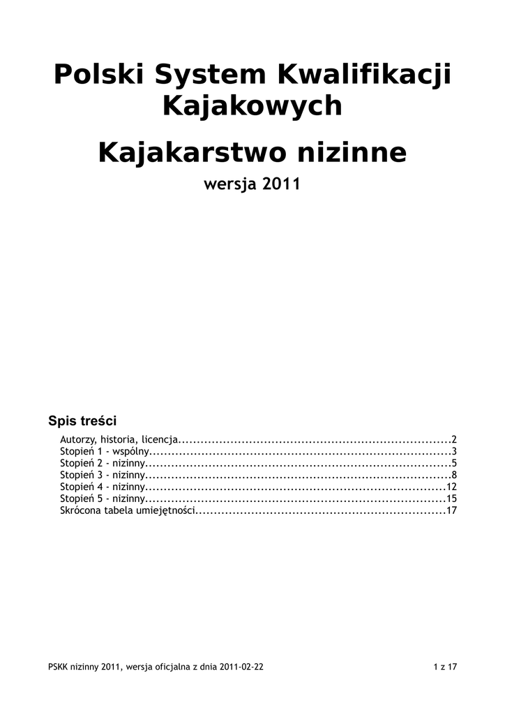 Polski System Kwalifikacji Kajakowych Kajakarstwo nizinne wersja 2011 Spis treści Autorzy, historia, licencja.........................................................................2 Stopień 1 - wspólny.................................................................................3 Stopień 2 - nizinny..................................................................................5 Stopień 3 - nizinny..................................................................................8 Stopień 4 - nizinny................................................................................12 Stopień 5 - nizinny................................................................................15 Skrócona tabela umiejętności...................................................................17 PSKK nizinny 2011, wersja oficjalna z dnia 2011-02-22 1 z 17 Autorzy Niniejszy dokument został opracowany w ramach Forum Organizacji Kajakowych (FOK). Autorami tekstu są członkowie zespołu nizinnego FOK: Bartosz Sawicki (koordynator), Rafał Gryko, Piotr Kaliszek, Tomasz Krajewski, Adam Rohatyński, Maciej Skarbek, Jerzy Świtek. Wielkie podziękowania należą się dziesiątkom doświadczonych kajakarzy, którzy włączyli się w dyskusje o nowym systemie kwalifikacji. Dziękujemy Elżbiecie Jaworskiej za korektę językową i redakcyjną. Historia systemu kwiecień 2009 - pomysł nowego systemu (po targach WiW 2009) czerwiec 2009 - założenia nowego systemu szkoleniowego lipiec 2009 - powołanie zespołów (nizinny, górski, morski) grudzień 2009 - ogólny projekt systemu kwalifikacji luty 2010 - ustalenie nazwy PSKK maj 2010 - robocza wersja PSKK nizinny 1-3 luty 2011 – pierwsza, pełna wersja PSKK nizinny PSKK nizinny 2011 jest pierwszym wydaniem systemu. W kolejnych latach planowane jest przygotowywanie kolejnych wersji, ulepszonych o zbierane doświadczenia. Zainteresowanych zapraszamy do dyskusji na FOK. Licencja Dokument ten jest dostępny publicznie na licencji Creative Commons BY-SA. Oznacza to, że każdy może kopiować i rozpowszechniać ten dokument pod warunkiem uznania autorstwa. Wolno także wykorzystywać ten tekst do tworzenia innych dokumentów, jednak z zastrzeżeniem, że one również będą udostępnione na tych samych warunkach. Szczegóły licencji CC BY-SA dostępne są na stronie: http://creativecommons.org/licenses/by-sa/3.0/deed.pl PSKK nizinny 2011, wersja oficjalna z dnia 2011-02-22 2 z 17 Stopień 1 - wspólny Krótki opis Stopień wspólny dla wszystkich rodzajów kajakarstwa. Kajakarz musi znać podstawowe zasady bezpiecznego i świadomego kajakarstwa, zapoznać się z systemem. Stanowi on zachętę do dalszego zdobywania umiejętności. Cel Stopień mający na celu zachęcenie kandydata do dalszego szkolenia, ocena podstawowych umiejętności po kursie wprowadzającym. Sam egzamin powinien zachęcać do zabawy, poprawności podstawowych manewrów, bezpieczeństwa oraz świadomości i troski o odpowiedni sprzęt i środowisko naturalne. Miejsce Osłonięta płaska woda (nie basen) Sprzęt Kajak lub kanadyjka oraz odpowiednie wiosło, kamizelka asekuracyjna, ubiór odpowiedni do warunków. Warunki dopuszczenia Aby podejść do egzaminu nie trzeba spełniać żadnych kryteriów wstępnych. WIOSŁOWANIE Egzamin można zdawać na dowolnym rodzaju kajaka lub kanadyjki. W łódkach dwuosobowych, wszystkie elementy muszą być wykonane dwukrotnie, jako szlakowy oraz jako sternik. Umiejętność Woda stojąca Opis Kandydat musi udowodnić, że jest w stanie utrzymać kontrolę nad łódką płynąc w linii prostej na dystansie 50 metrów w wyznaczonym kierunku. Pewne problemy z utrzymaniem linii prostej są dopuszczalne, Wiosłowanie do przodu jednak nie mogą one doprowadzać do zatrzymania łódki lub płynięcia serią niekontrolowanych łuków. Podczas wiosłowania przyjmuje prawidłową postawę: nie odchyla się do tyłu, nogi zaparte, uda/kolana w kontakcie z łódką. Poprawnie trzyma wiosło. Kandydat potrafi zatrzymać łódkę płynąc zarówno do przodu, jak i do tyłu. Pełne zatrzymanie zostaje osiągnięte po kilku Zatrzymywanie się pociągnięciach niezbyt daleko od burty, nie powodując obrócenia kajaka. PSKK nizinny 2011, wersja oficjalna z dnia 2011-02-22 3 z 17 Obroty 360 stopni Wiosłowanie do tyłu Pływanie po ósemce Obracanie kajaka o 360 stopni w miejscu w obie strony, za pomocą kombinacji szerokich zawiosłowań do przodu i do tyłu. Widoczne jest skręcanie linii barków. Łódka musi przepłynąć 25 metrów tyłem w wyznaczonym kierunku. Widoczne skręcanie linii barków oraz oglądanie się przez ramię w celu zweryfikowania kierunku płynięcia. Prawidłowe ułożenie wiosła (nieodwracanie piór). Kandydat przepływa przodem tor w kształcie cyfry 8 używając do skrętu odpowiednich, szerokich pociągnięć wiosła. RATOWNICTWO Umiejętność Opis 1. Wywrotka w bliskiej, bezpiecznej odległości od brzegu (bez zapiętego fartucha). 2. Po wywrotce kandydat powinien, zachowując spokój, wyjść z Kabina przy brzegu łódki pod wodą. 3. Ustabilizowanie pozycji poprzez uchwycenie się jedną ręką kajaka, a w drugiej ręce trzymanie wiosła. Kandydat wie w jaki sposób wylać wodę z łódki. Powinien Pomoc przy wylewaniu aktywnie pomagać przy wylewaniu wody, ale nie musi być w wody stanie zrobić tego samodzielnie. UMIEJĘTNOŚCI POMOCNICZE Umiejętność Opis Kandydat samodzielnie dobiera i dopasowuje sobie kamizelkę asekuracyjną, wiosło oraz inny sprzęt odpowiadający rodzajowi Dobieranie sprzętu kajakarstwa i panującym warunkom, na przykład kask, fartuch, odzież oraz odpowiednie obuwie, itp. Zwrócić uwagę na poprawne zapięcie kamizelki asekuracyjnej. Kandydat musi zaprezentować poprawne podnoszenie i noszenie Podnoszenie i noszenie kajaka przy użyciu nóg, a nie pleców. Może wykorzystać pomoc kajaka drugiej osoby lub ciągnąć kajak na wózku. 1. Kontrolowane i delikatne wodowanie łódki. Zejście na wod